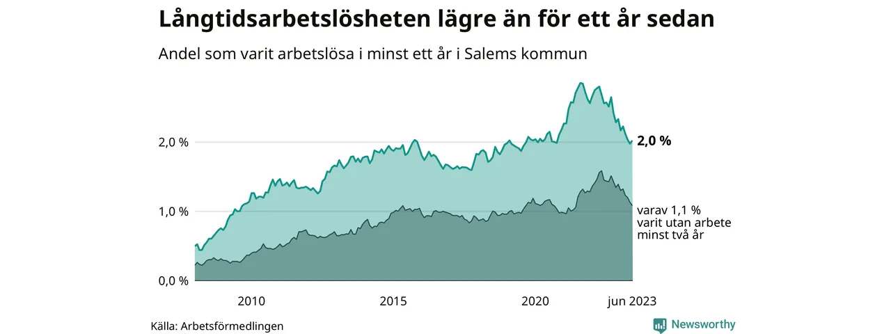 Totalt i riket hade knappt 138 000 personer varit utan arbete i minst ett år i juni. Det motsvarar 2,6 procent av arbetskraften, vilket är en minskning med 0,6 procentenheter jämfört med ett år sedan.