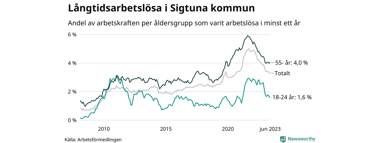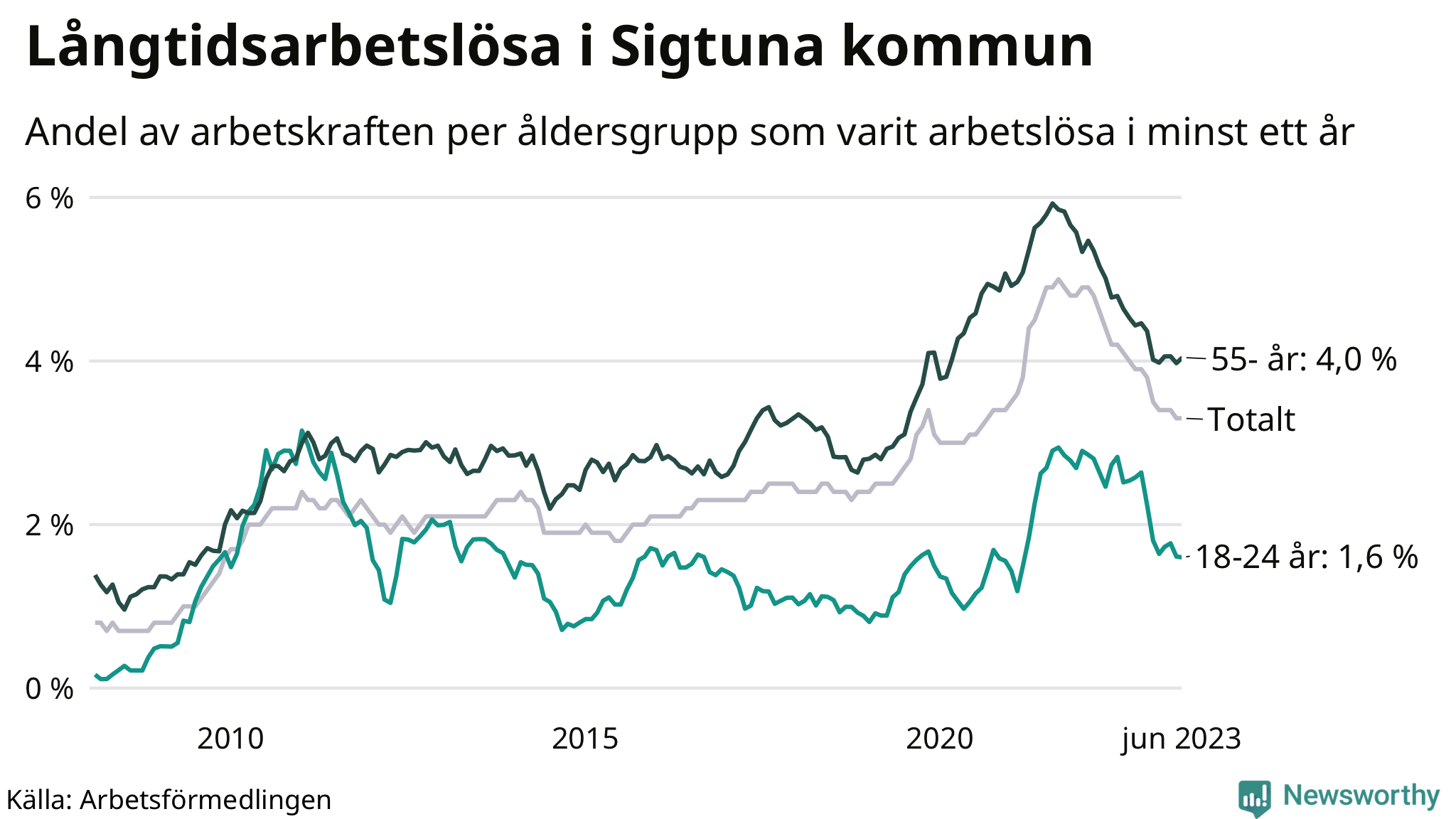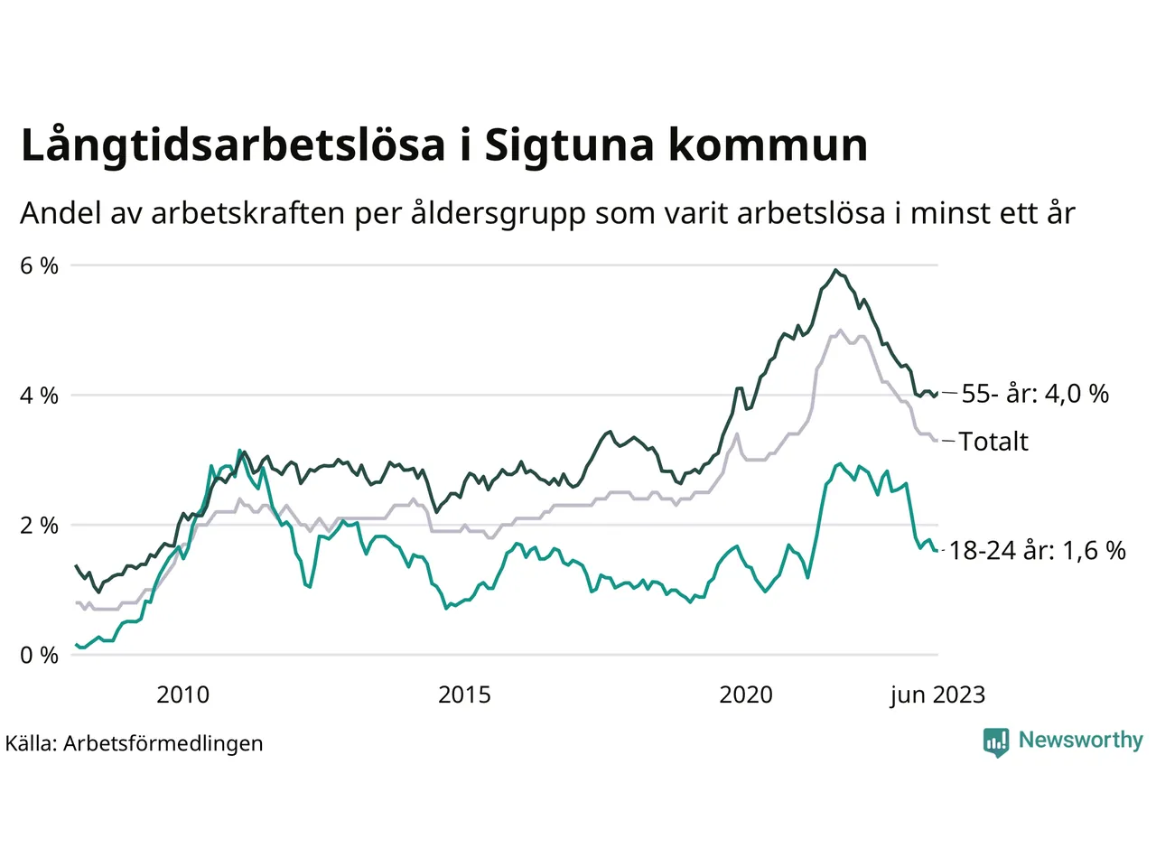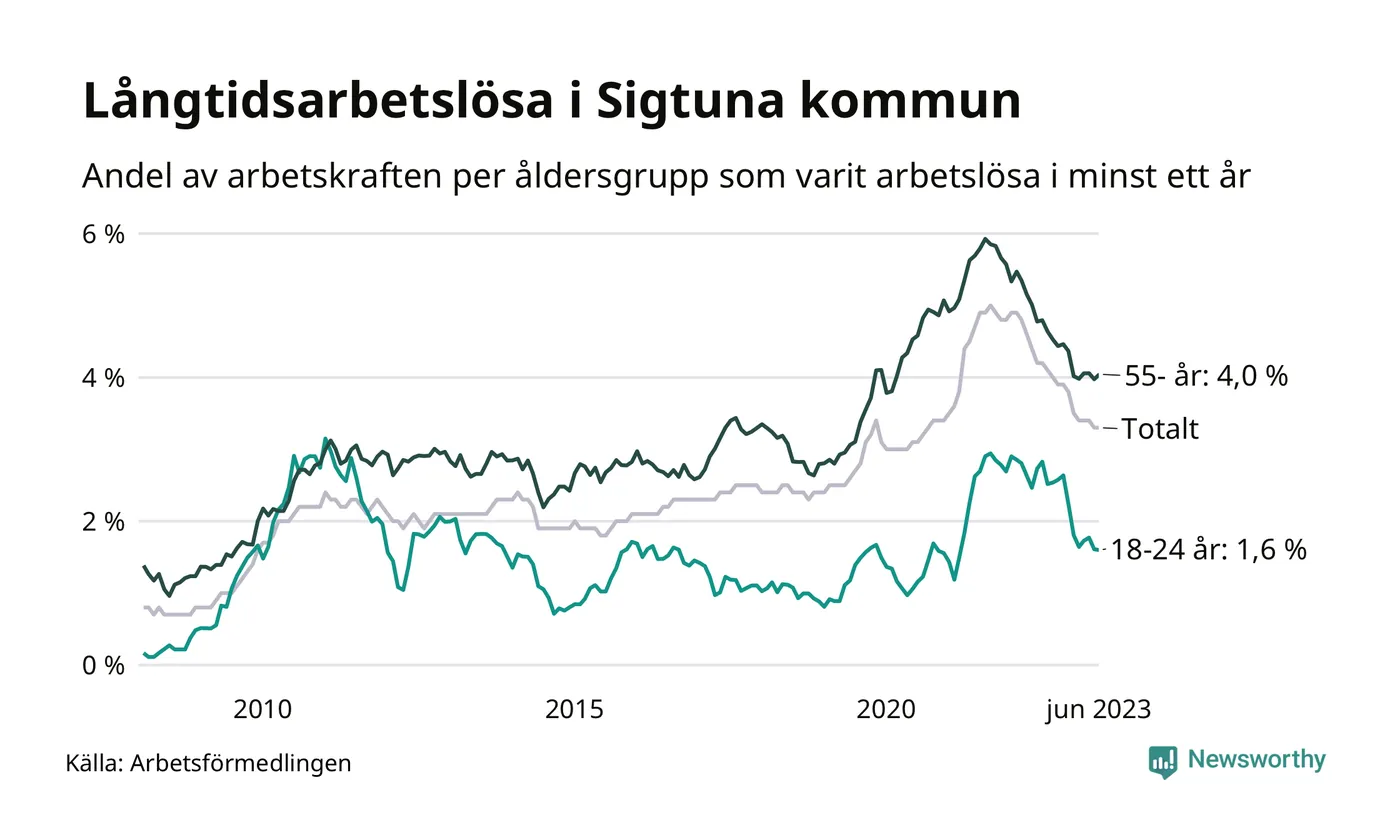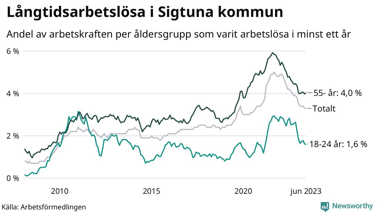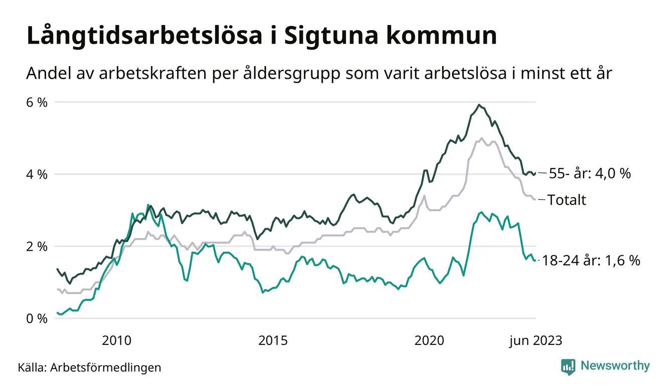 Av de 838 personerna som varit arbetslösa i mer än ett år i Sigtuna kommun är 195 personer mellan 55 och 651 år och 39 är mellan 18 och 24 år. För den äldre gruppen är andelen arbetslösa 4,0 procent medan den i den yngre gruppen är 1,6 procent. Även i riket som helhet är långtidsarbetslösheten högre i gruppen äldre.