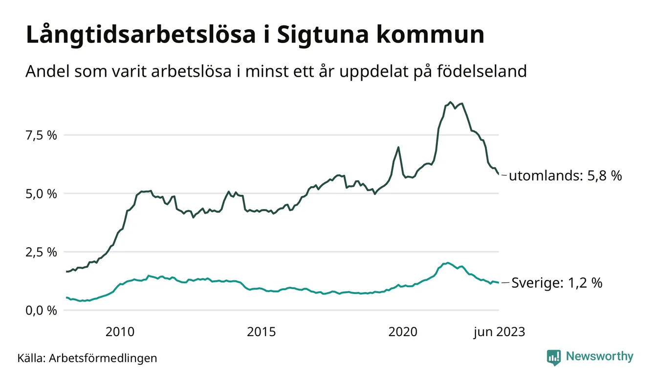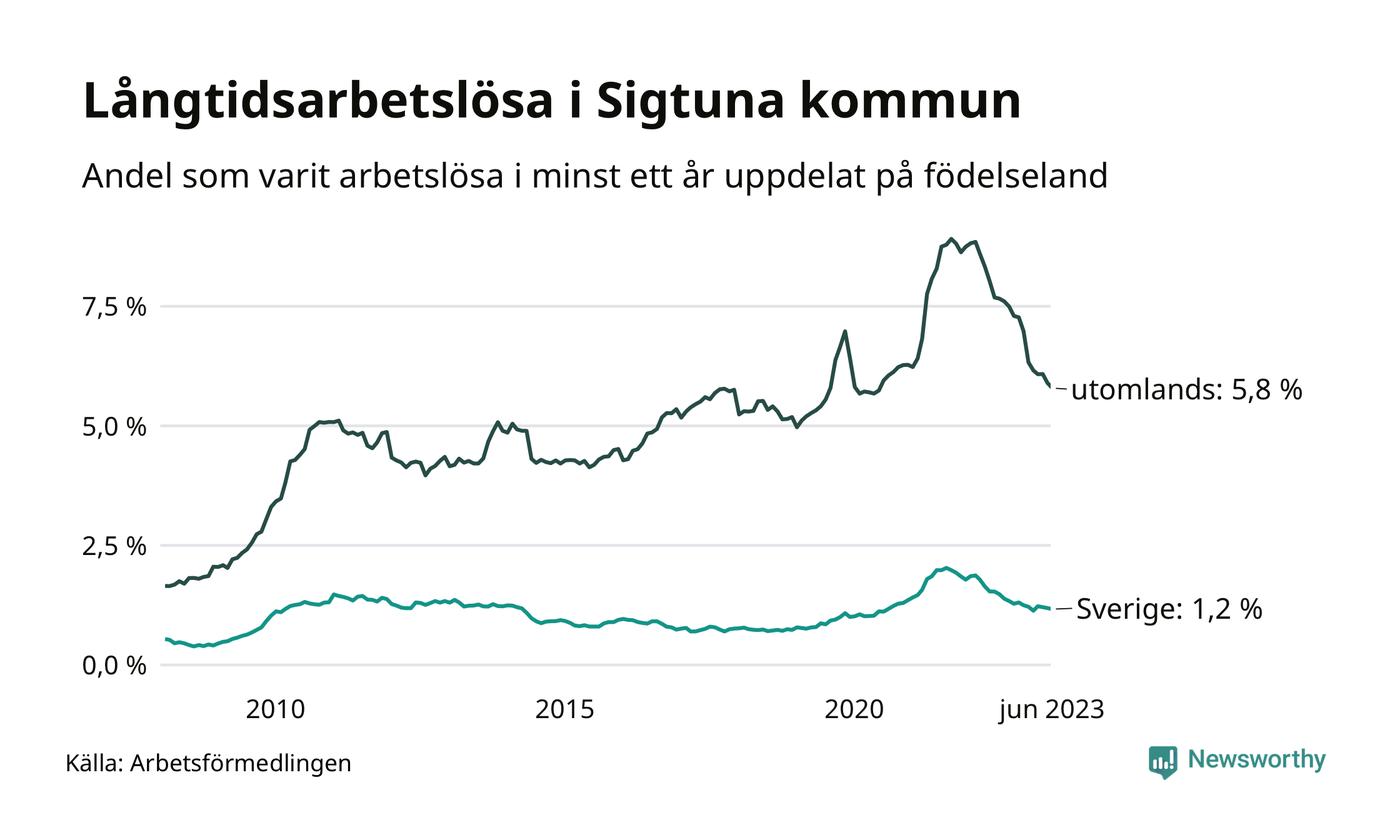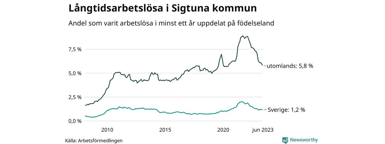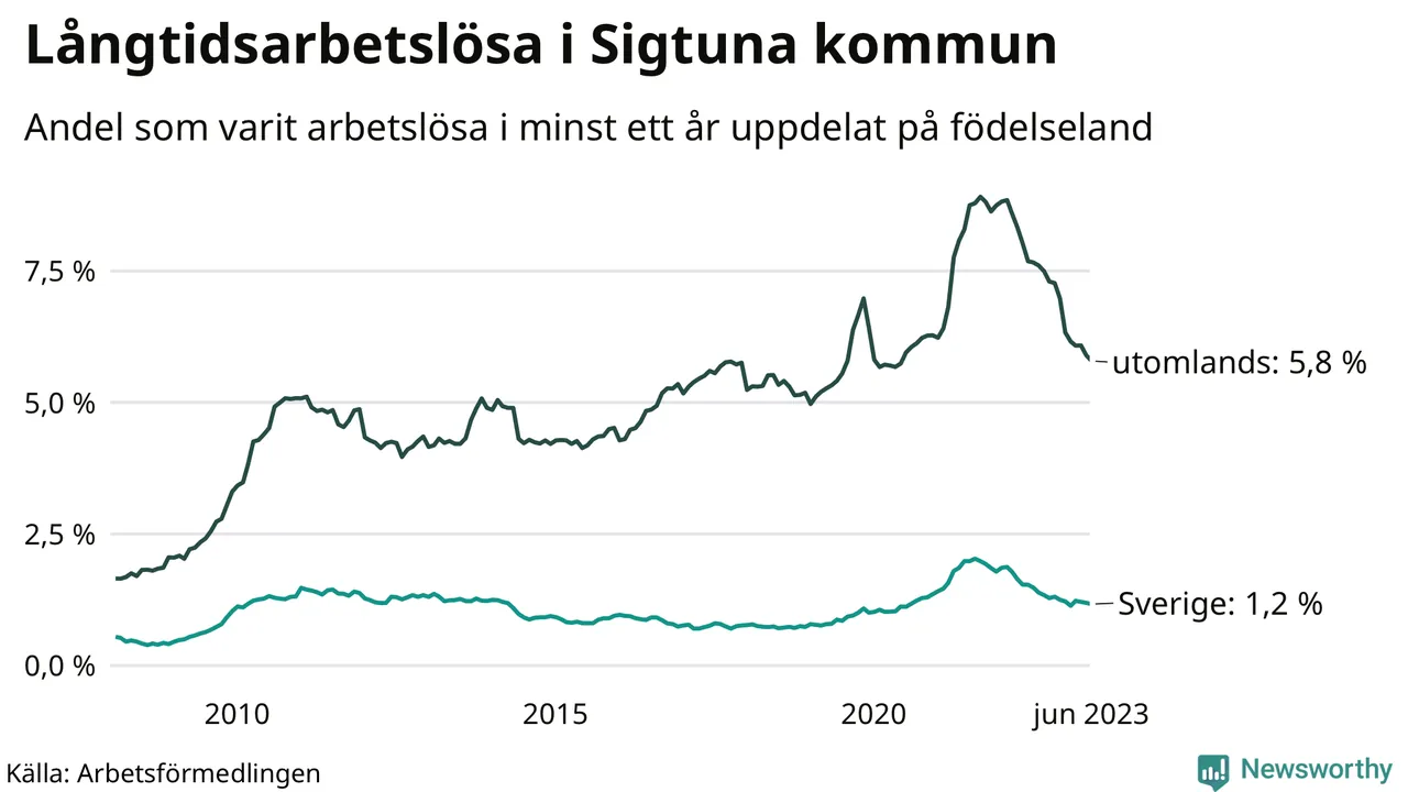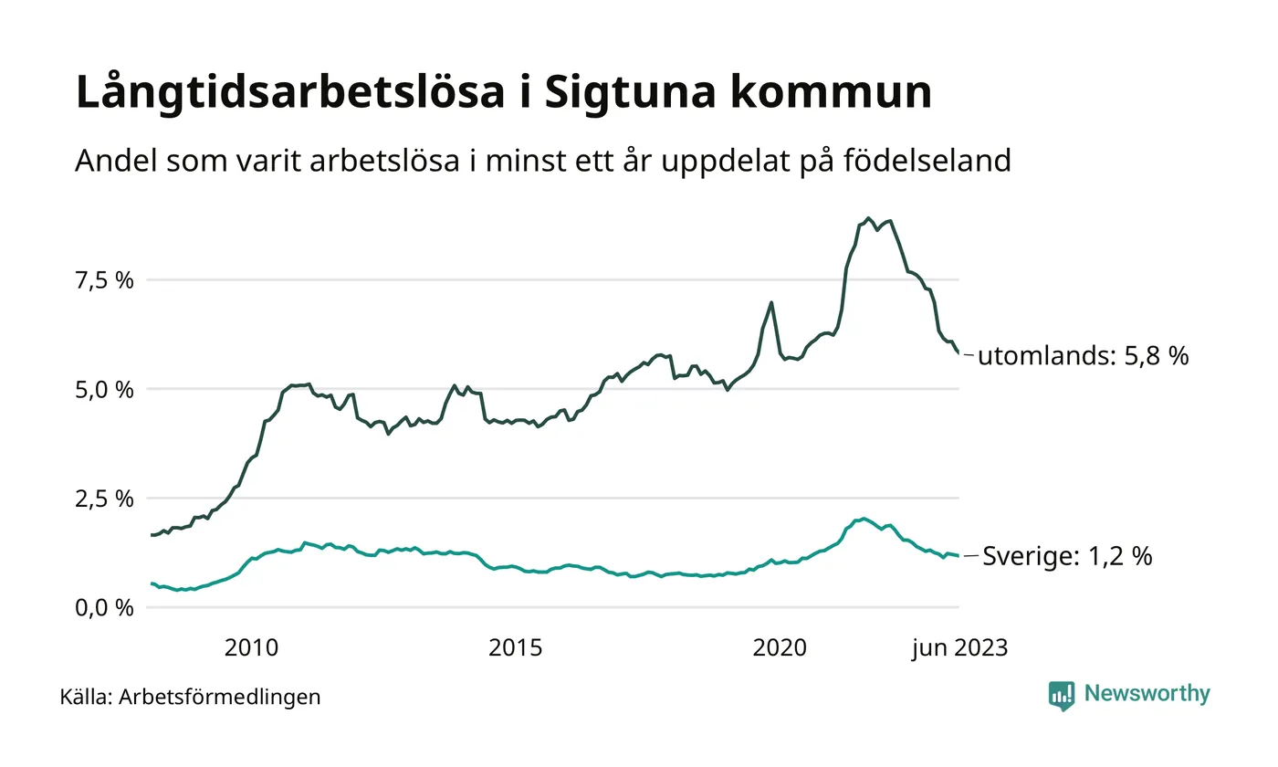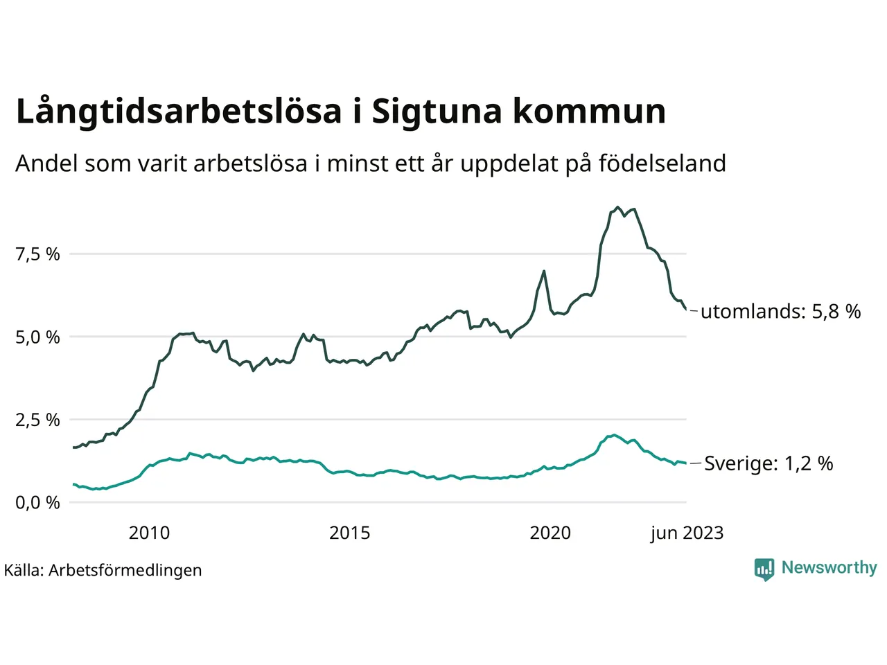 165 av de långtidsarbetslösa i Sigtuna är födda i Sverige, medan 673 är födda utomlands. Det innebär att långtidsarbetslösheten bland Sverigefödda är 1,2 procent, medan den är fem gånger så hög – 5,8 procent – bland födda utomlands. Även i riket som helhet är arbetslösheten högre bland utrikesfödda.