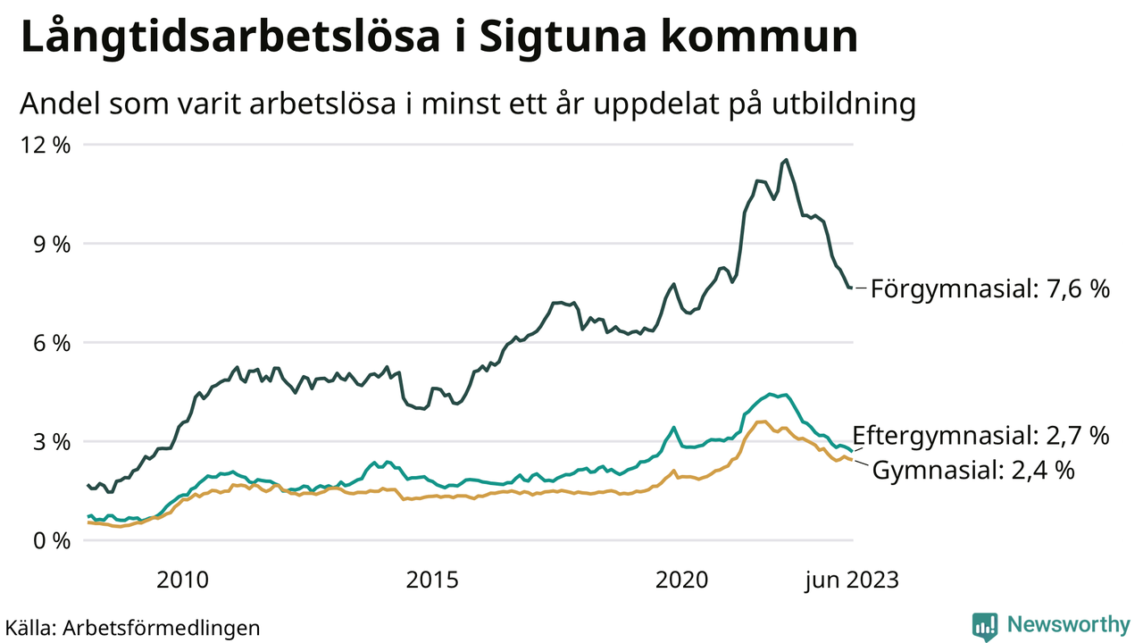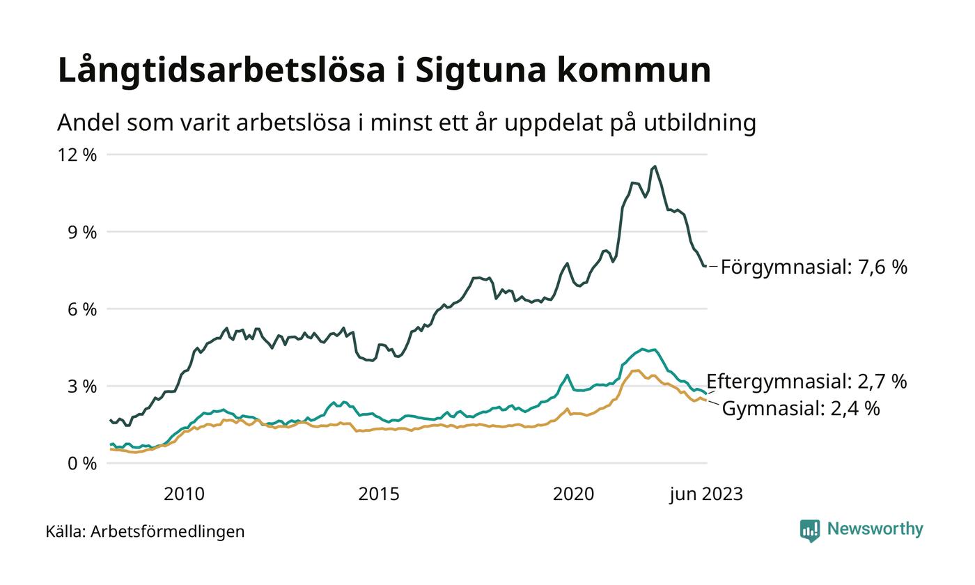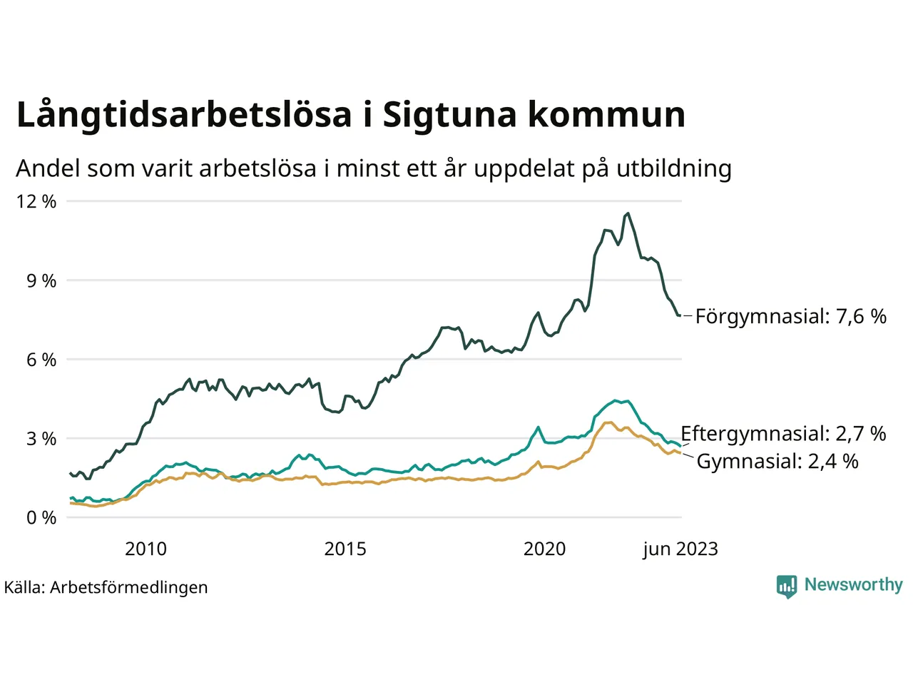 I juni hade 838 Sigtunabor varit arbetslösa i minst ett år, vilket är 14 färre än månaden innan. 838 personer motsvarar 3,3 procent av arbetskraften i kommunen – andelen långtidsarbetslösa är 0,9 procentenheter lägre än samma månad för ett år sedan.