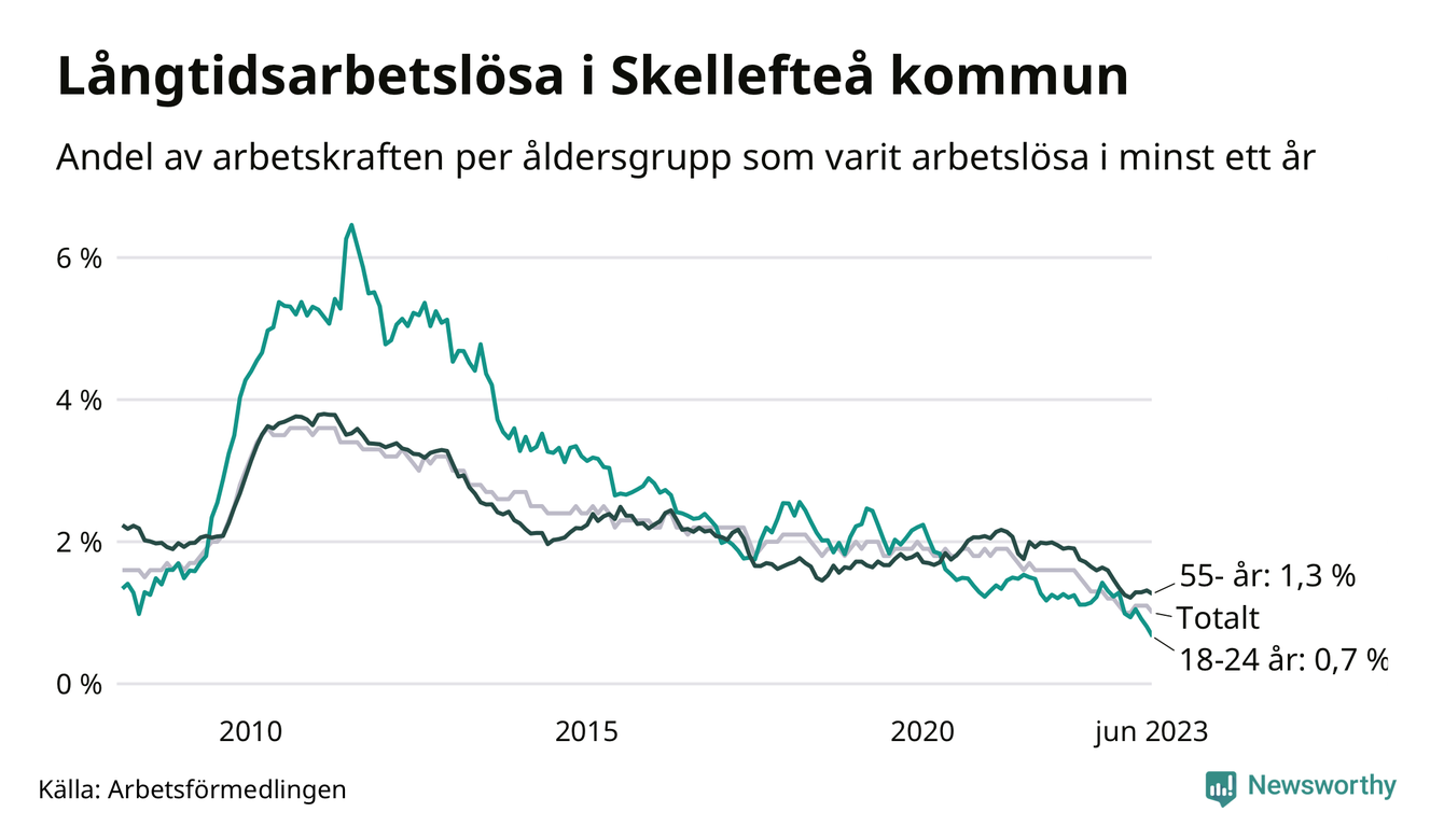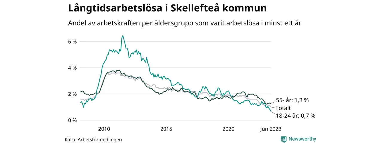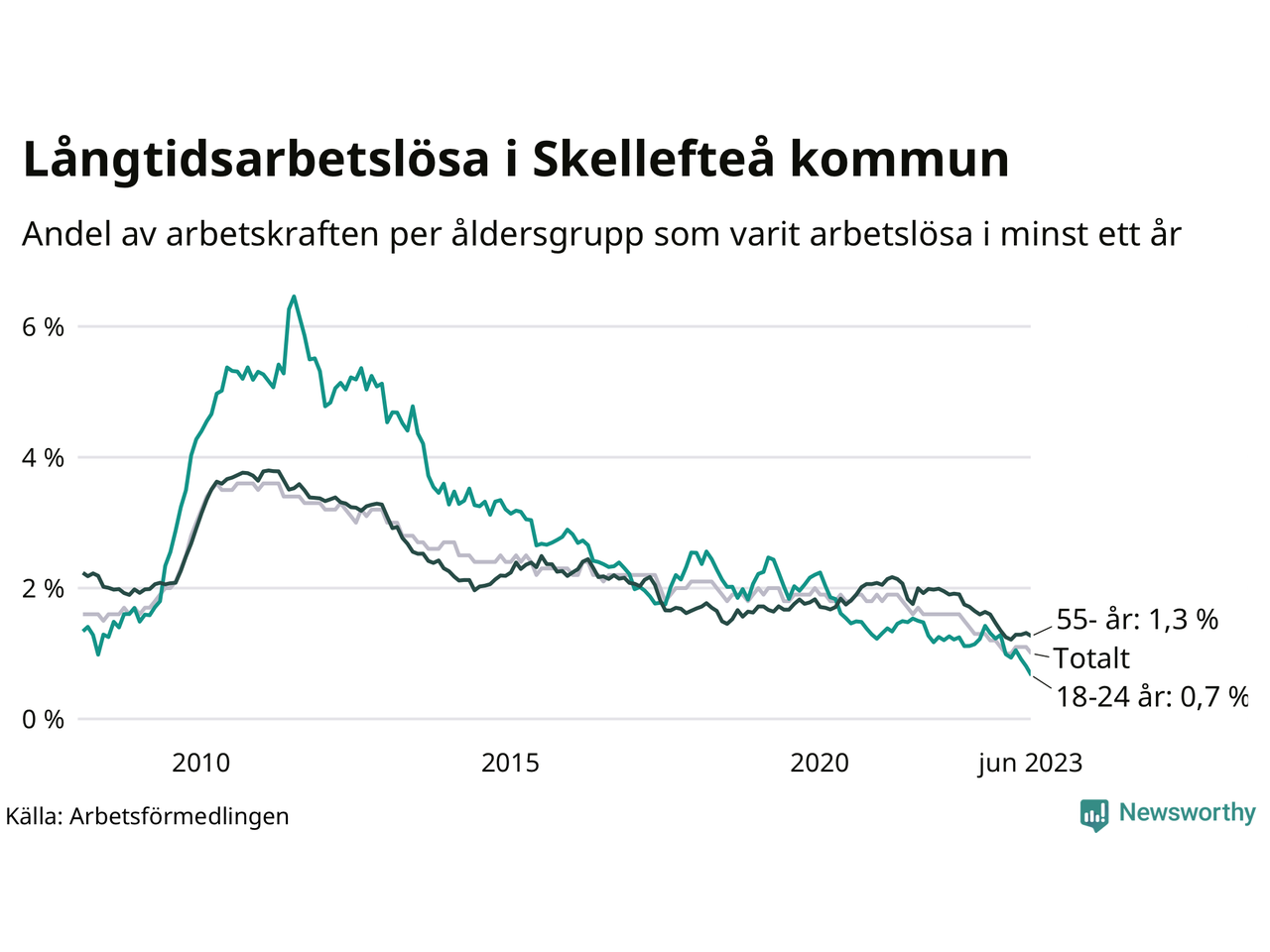 Av de 341 personerna som varit arbetslösa i mer än ett år i Skellefteå kommun är 102 personer mellan 55 och 651 år och 24 är mellan 18 och 24 år. För den äldre gruppen är andelen arbetslösa 1,3 procent medan den i den yngre gruppen är 0,7 procent. Även i riket som helhet är långtidsarbetslösheten högre i gruppen äldre.