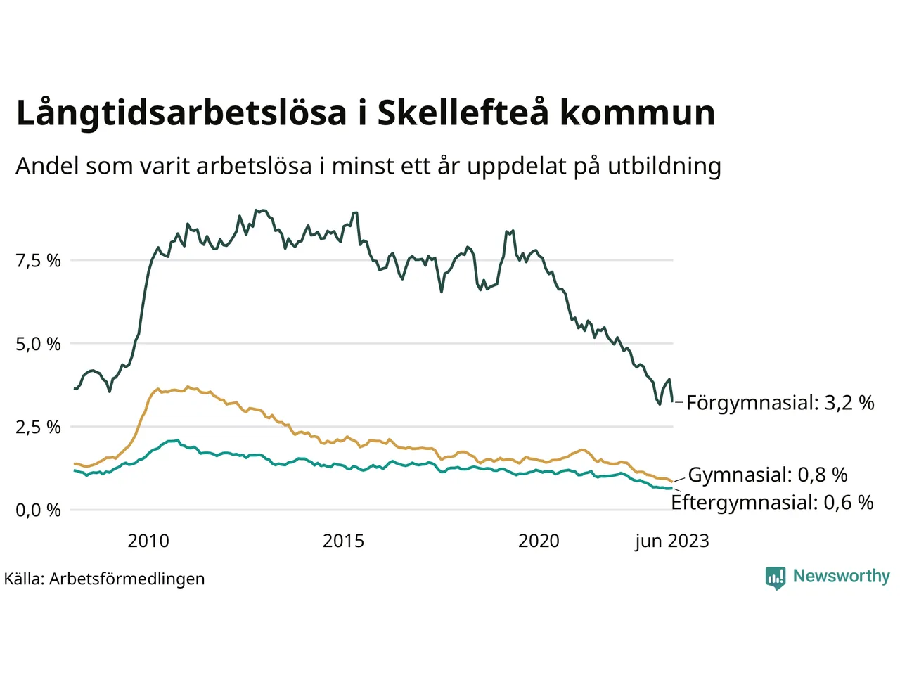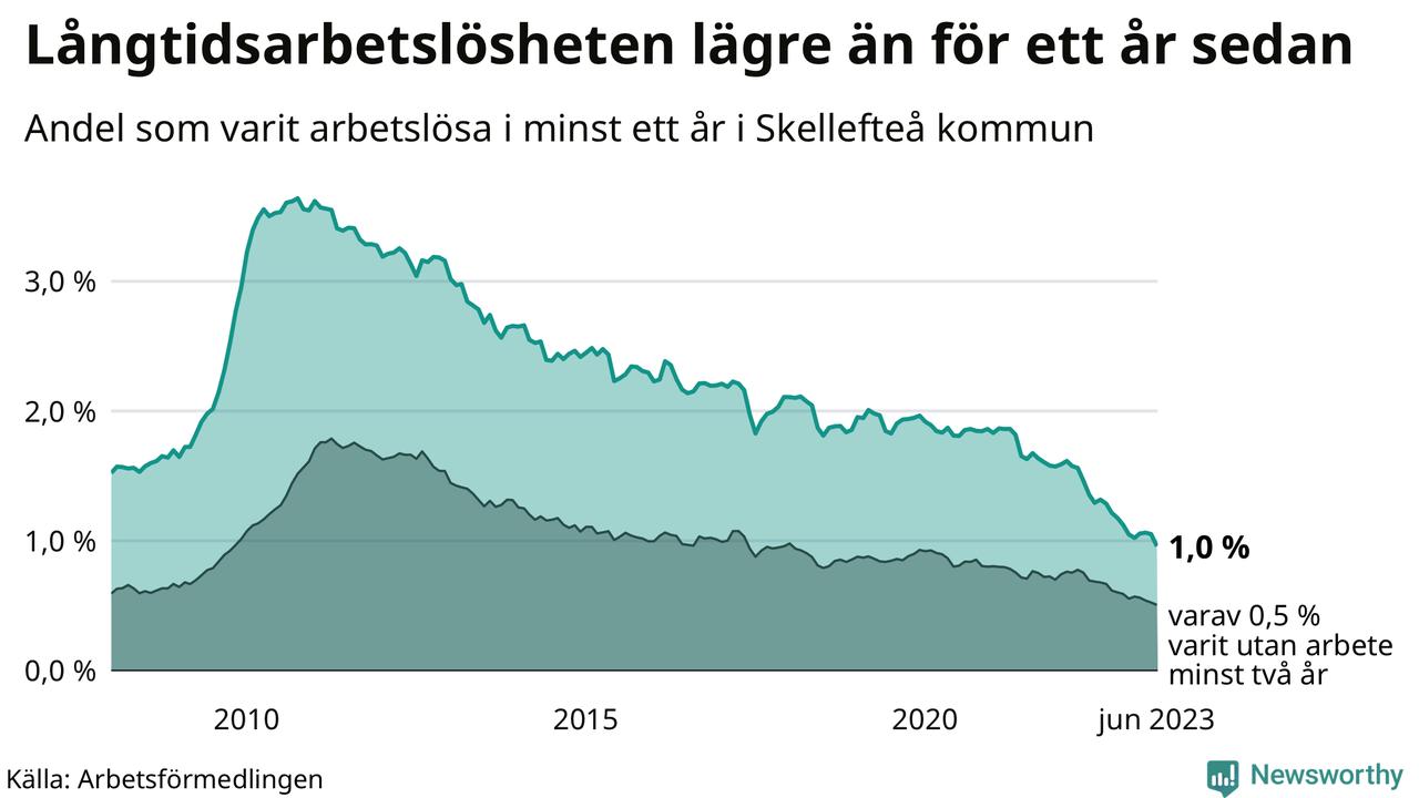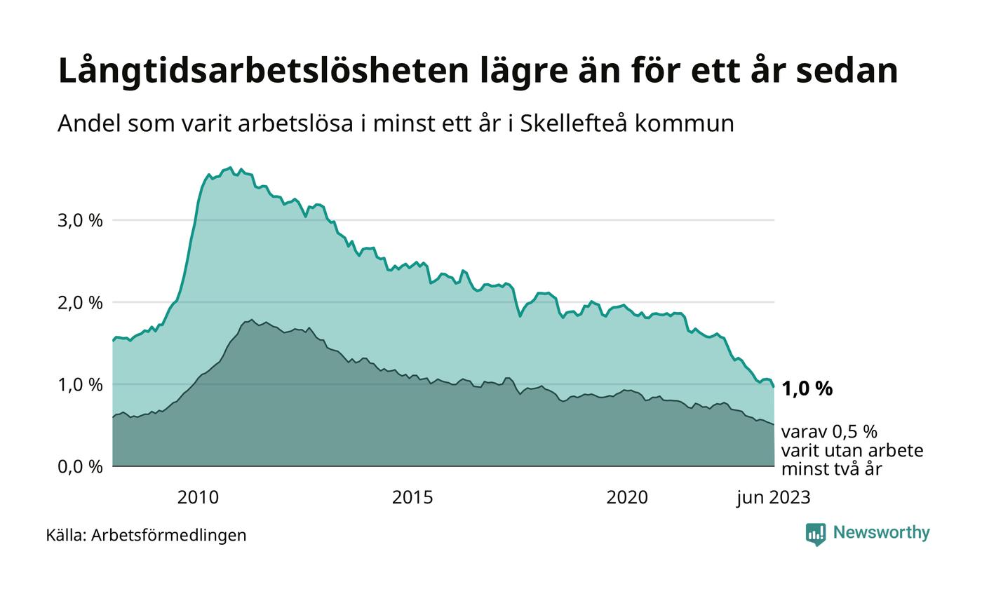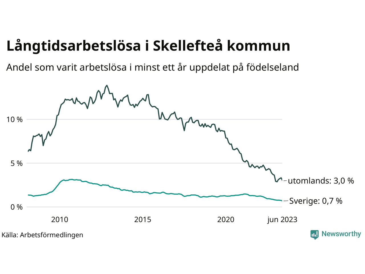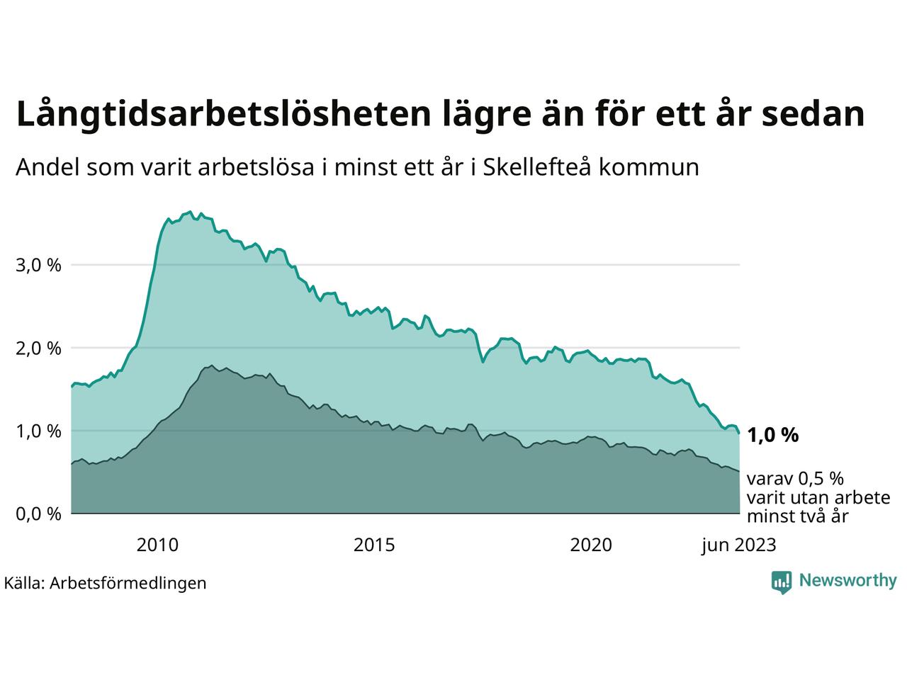 I juni hade 341 Skellefteåbor varit arbetslösa i minst ett år, vilket är 34 färre än månaden innan. 341 personer motsvarar 1,0 procent av arbetskraften i kommunen – andelen långtidsarbetslösa är 0,4 procentenheter lägre än samma månad för ett år sedan. Det är också den den lägsta andelen långtidsarbetslösa under de senaste 15 åren. Skellefteå tillhör de kommuner med lägst andel långtidsarbetslösa i hela landet just nu.