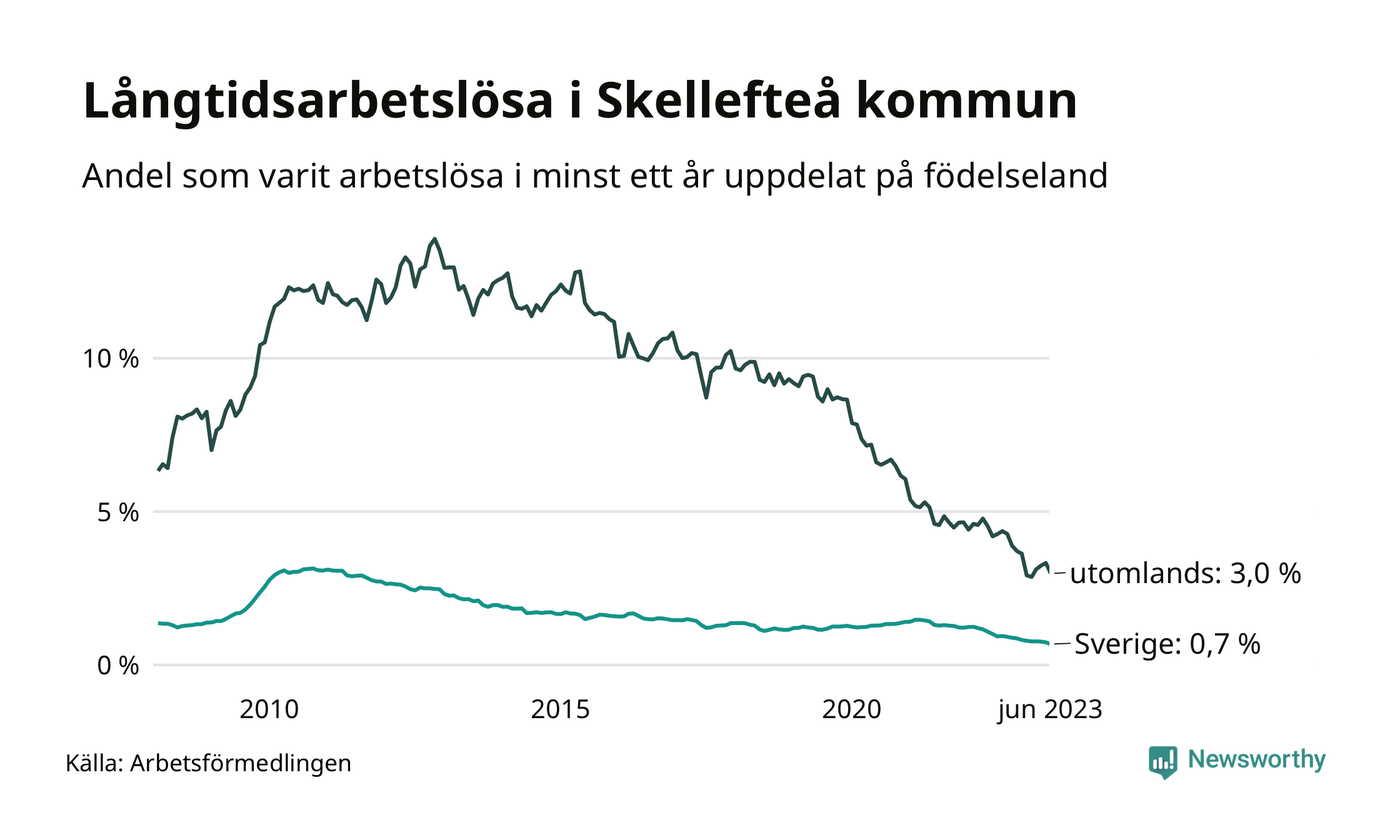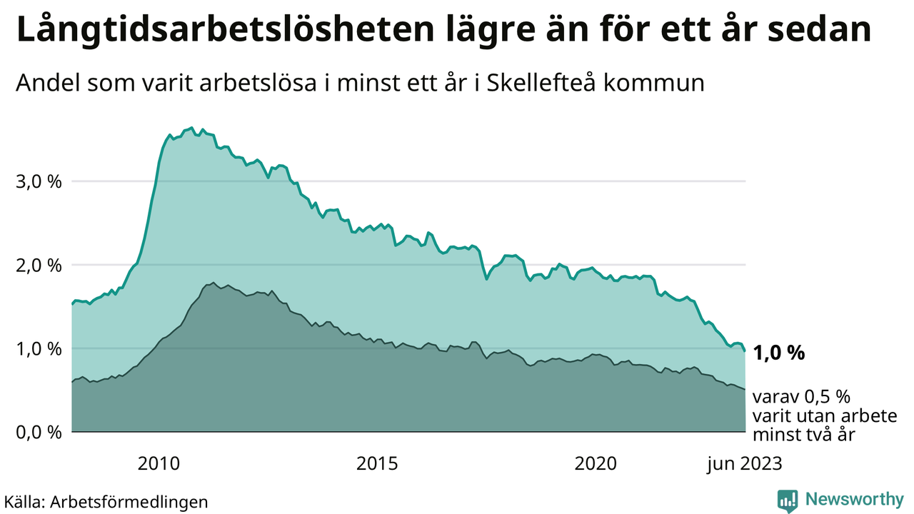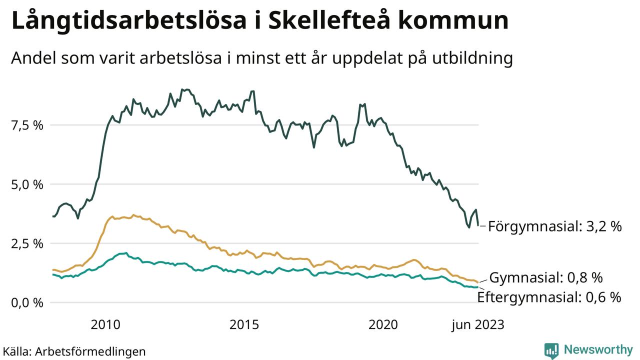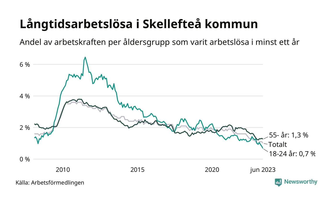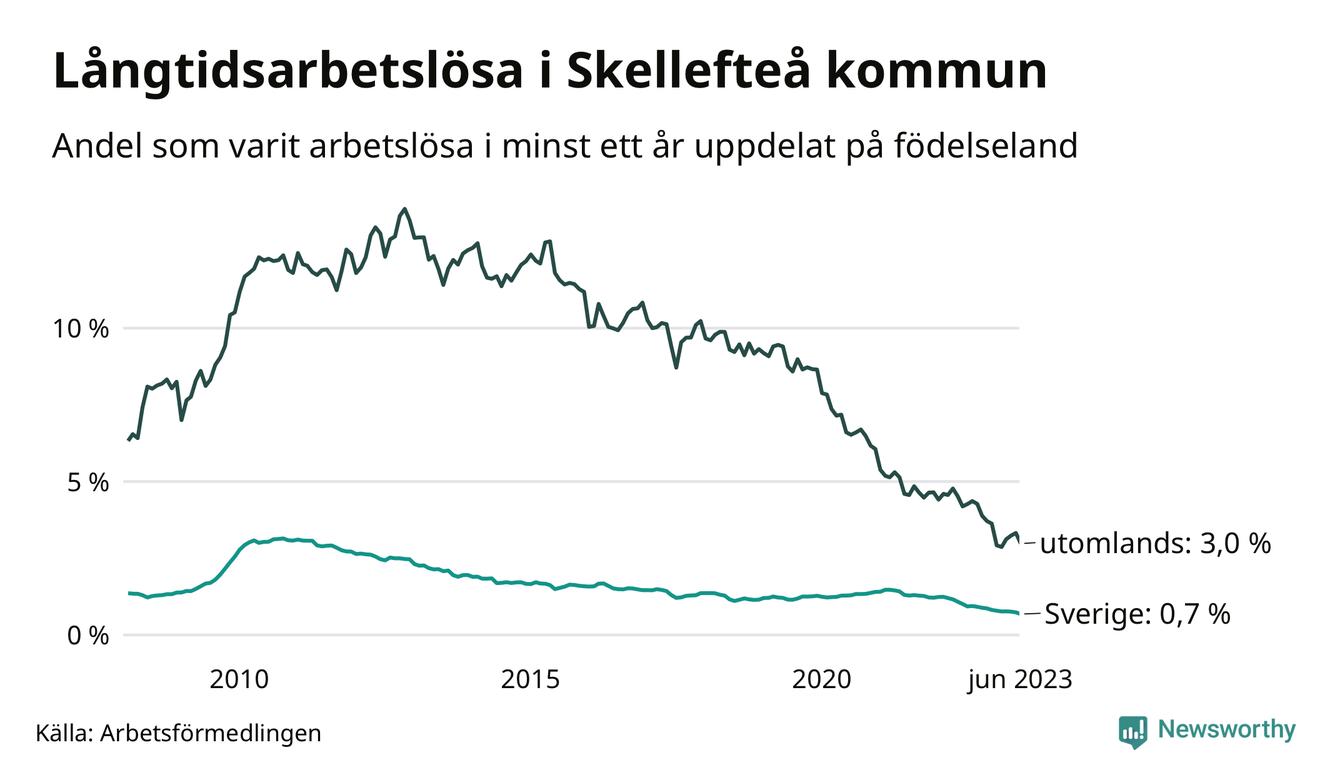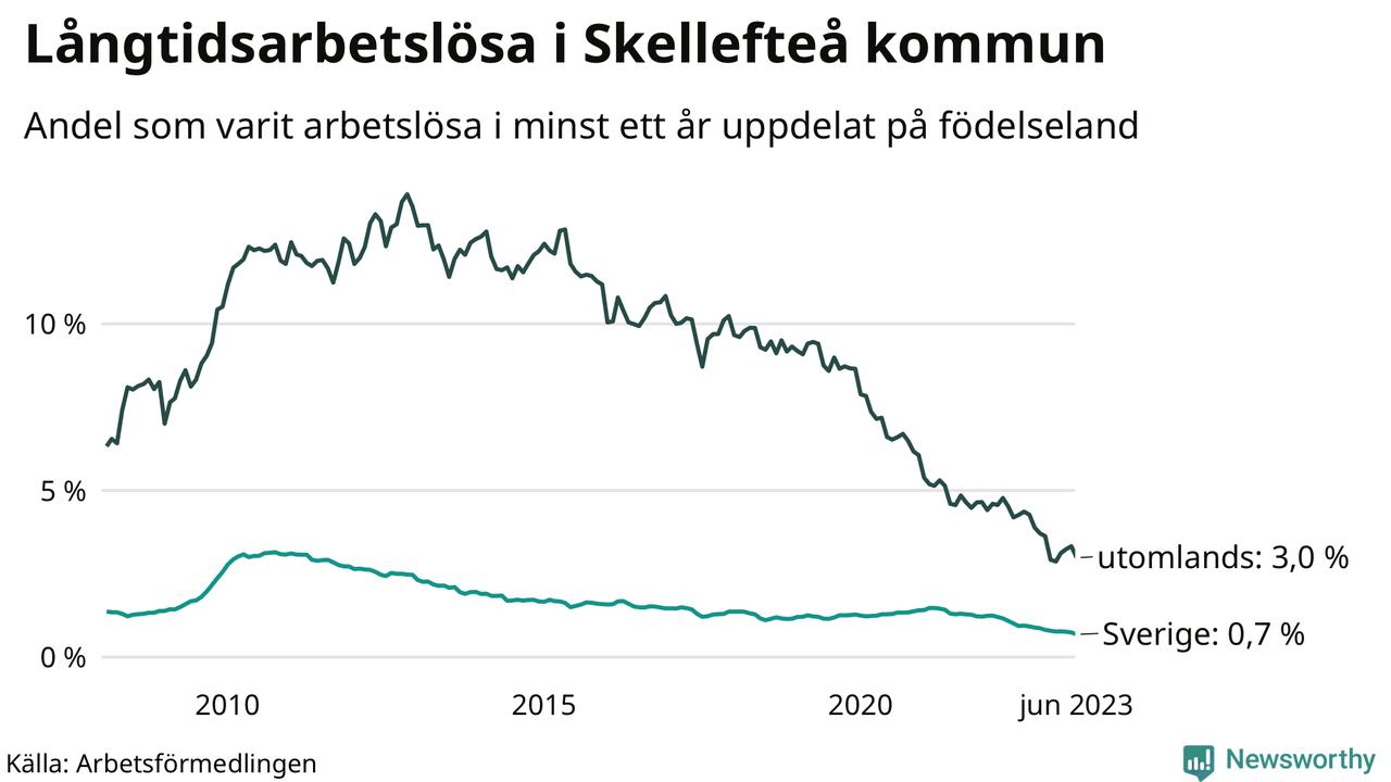 I juni hade 341 Skellefteåbor varit arbetslösa i minst ett år, vilket är 34 färre än månaden innan. 341 personer motsvarar 1,0 procent av arbetskraften i kommunen – andelen långtidsarbetslösa är 0,4 procentenheter lägre än samma månad för ett år sedan. Det är också den den lägsta andelen långtidsarbetslösa under de senaste 15 åren. Skellefteå tillhör de kommuner med lägst andel långtidsarbetslösa i hela landet just nu.