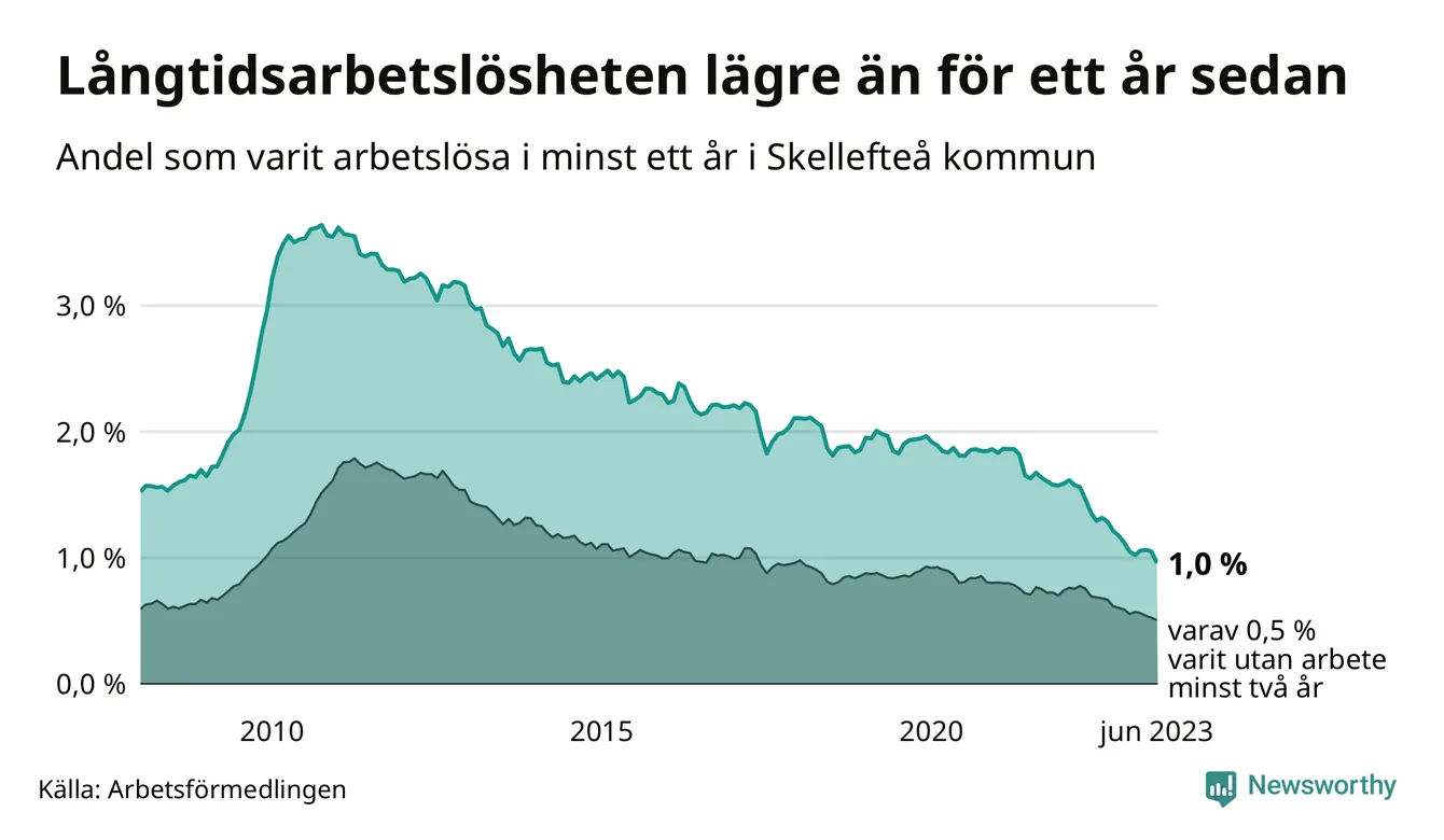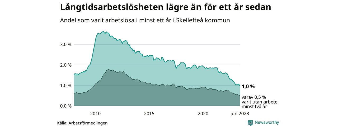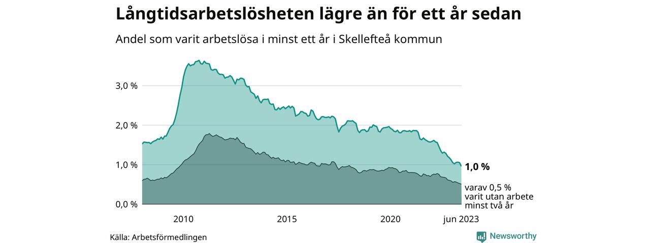 Andelen långtidsarbetslösa i Skellefteå är den lägsta i Västerbottens län. I Åsele finns länets högsta långtidsarbetslöshet, 3,1 procent. I Västerbotten som helhet hade 1 884 personer (1,4 procent) varit arbetslösa i minst ett år i juni. Det är 94 personer färre än månaden innan, och det är den tjugo­sjätte månaden i rad som antalet sjunkit.