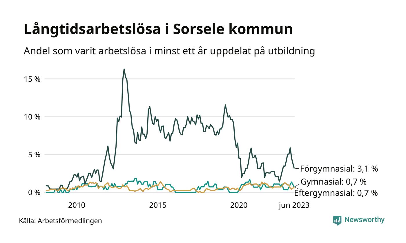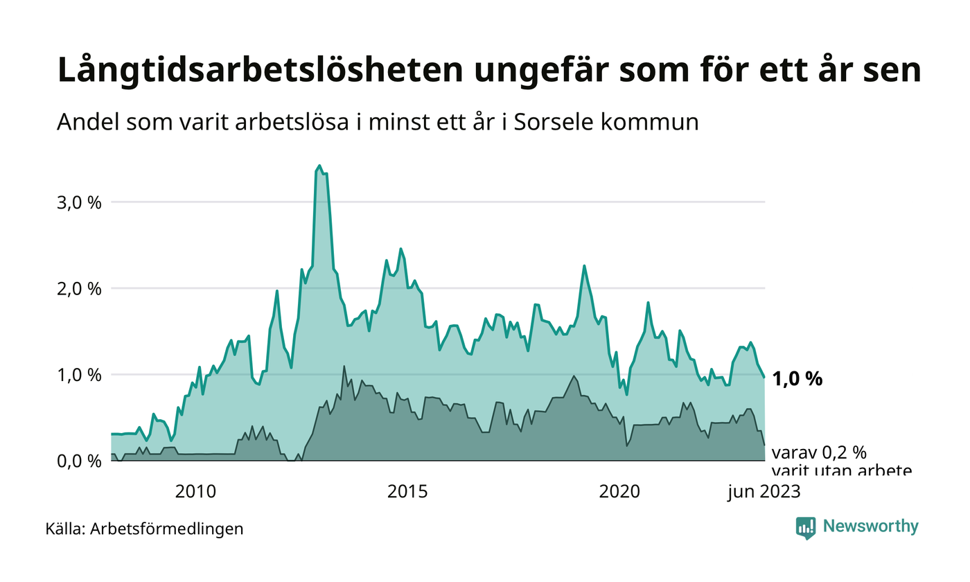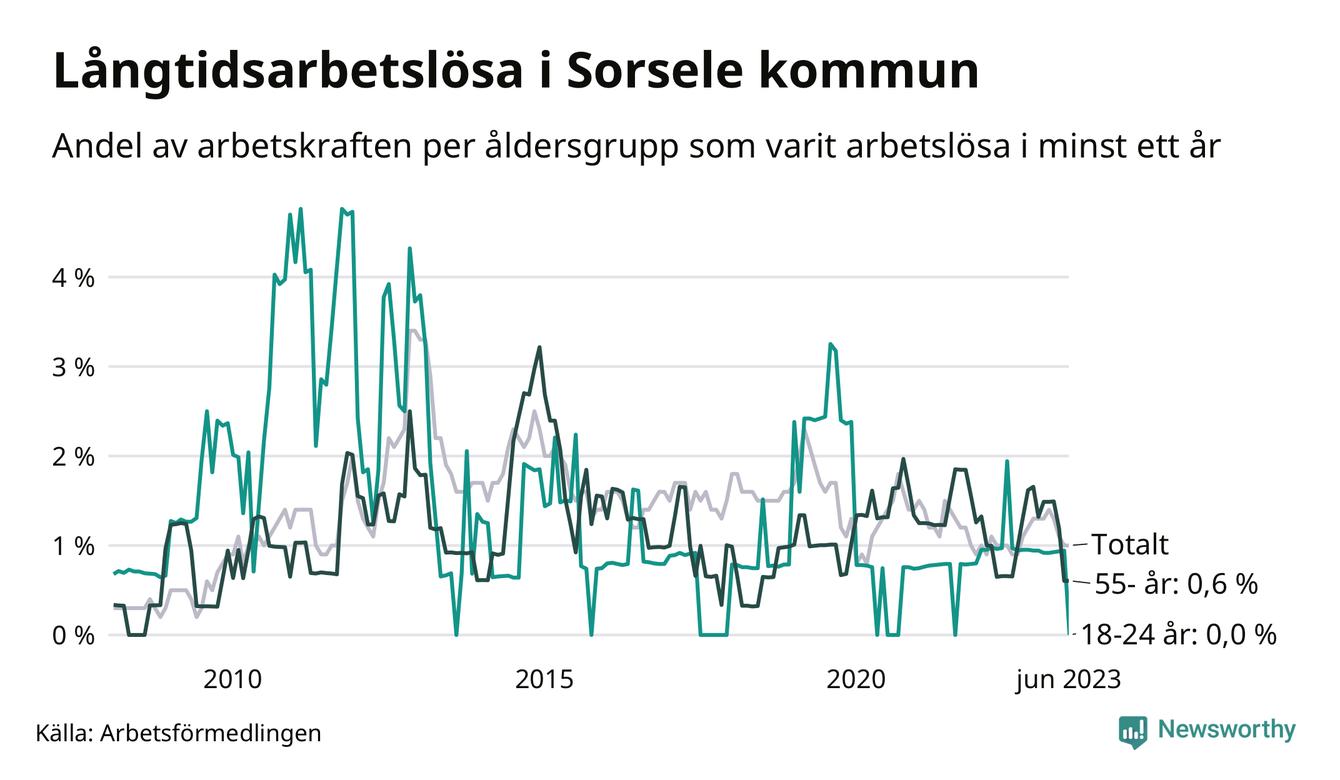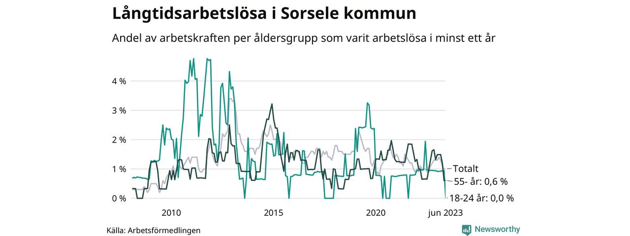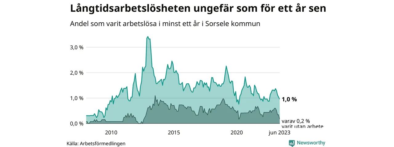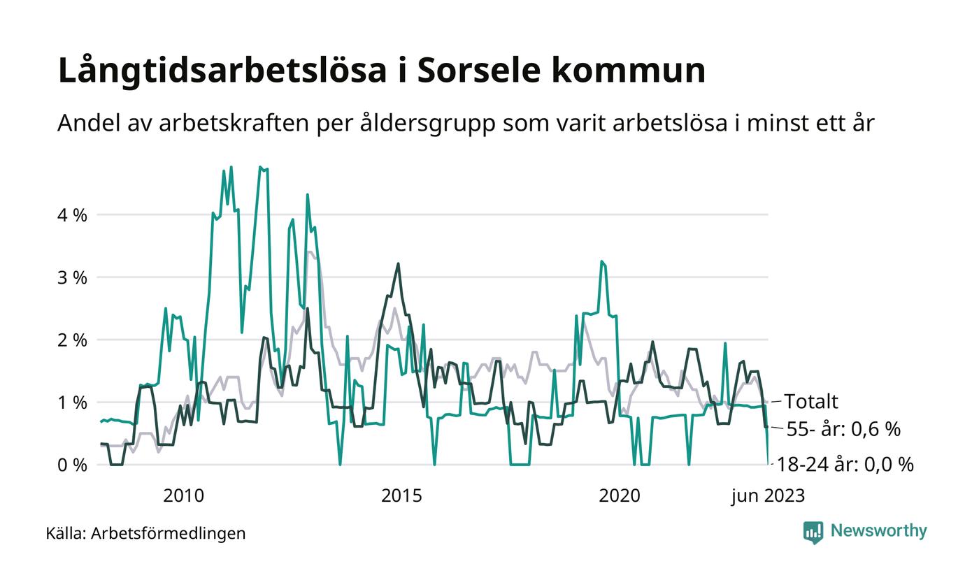 I juni hade elva Sorselebor varit arbetslösa i minst ett år, vilket är en färre än månaden innan. Det är den fjärde månaden i rad med minskande antal långtidsarbetslösa. Elva personer motsvarar 1,0 procent av arbetskraften i kommunen – andelen långtidsarbetslösa är ungefär på samma nivå som för ett år sedan. Sorsele hade lägst andel långtidsarbetslösa i landet i juni.