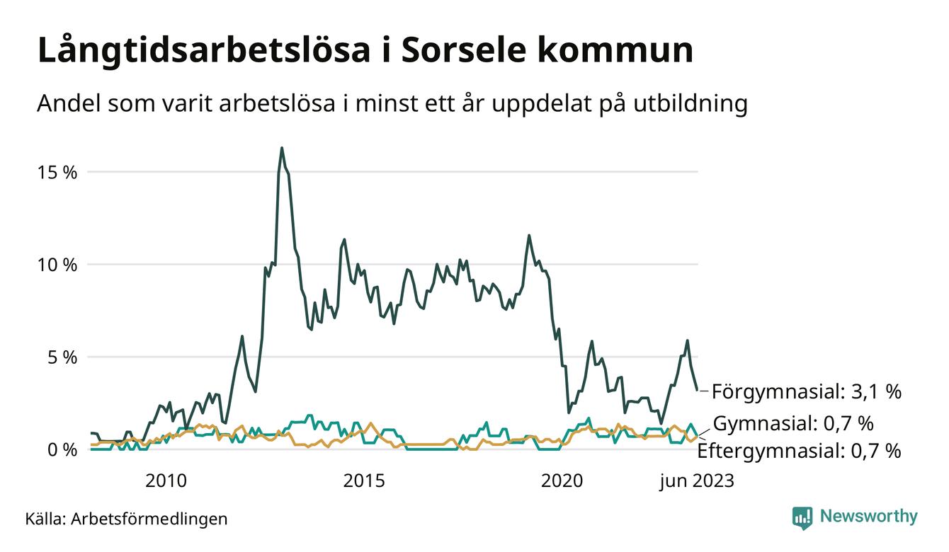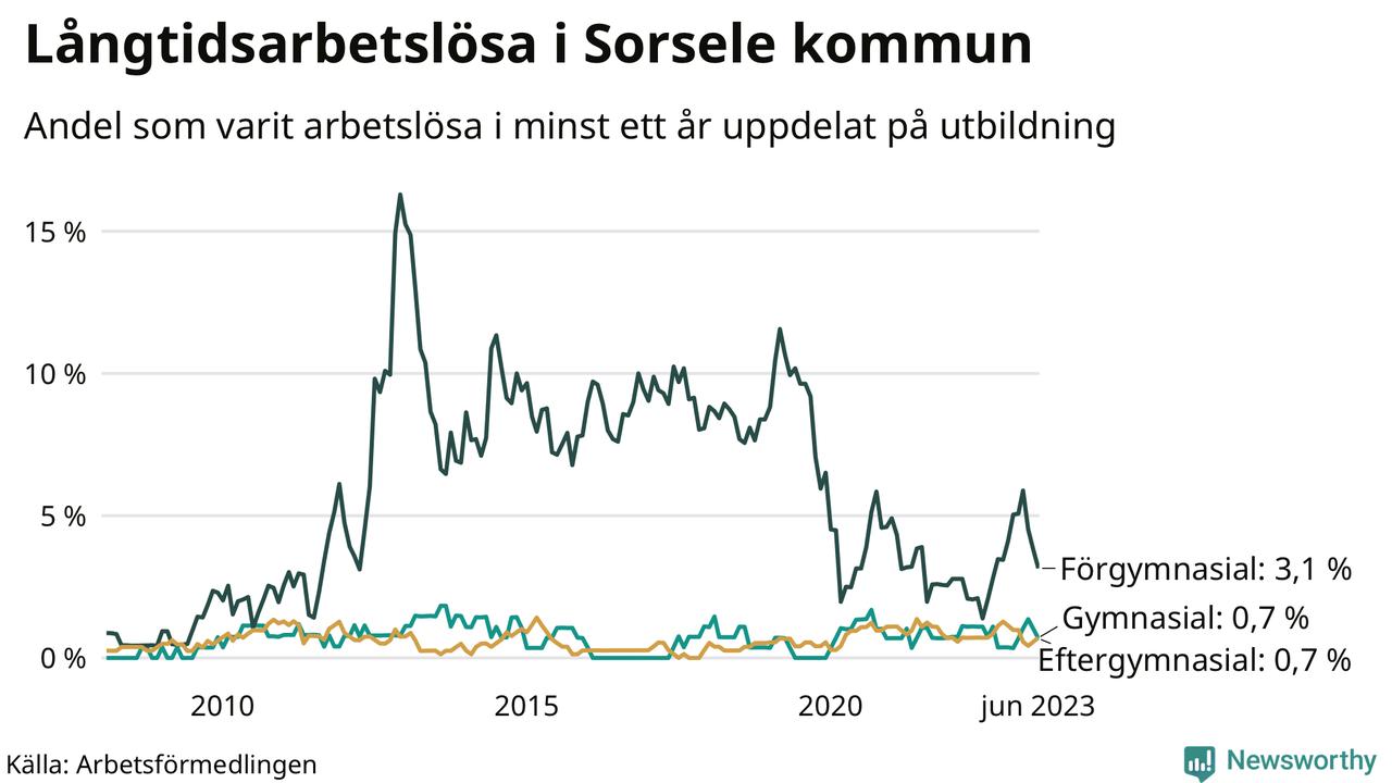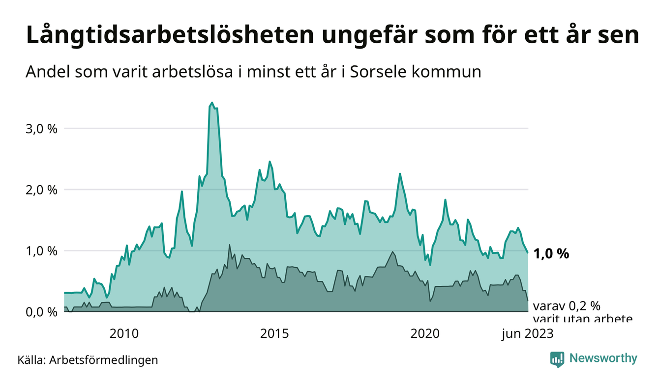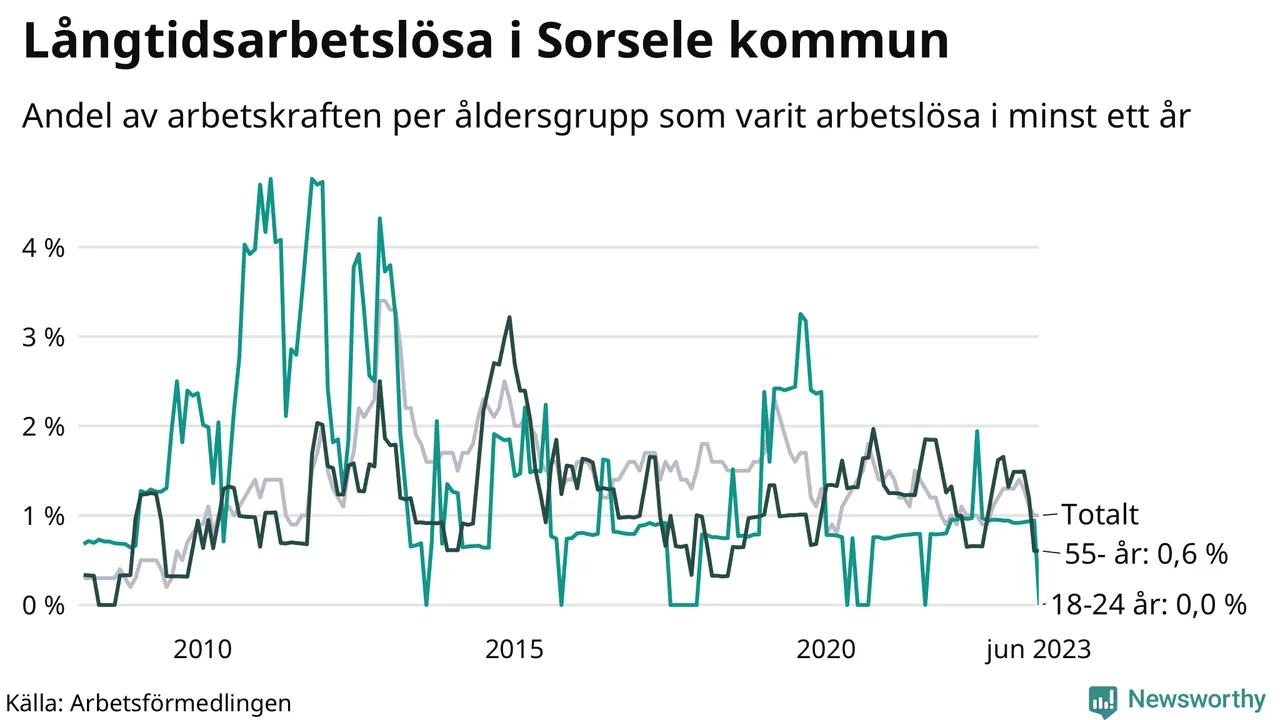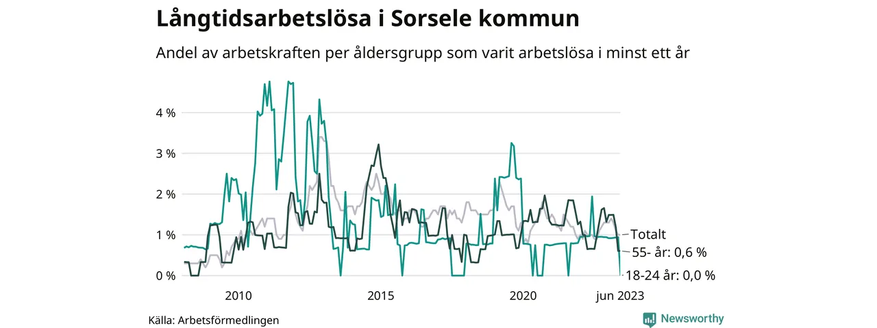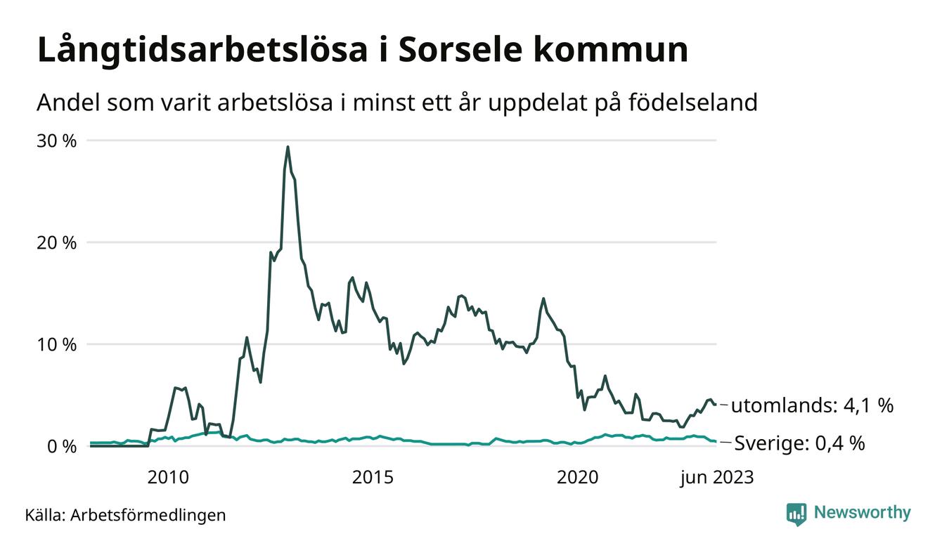 I juni hade elva Sorselebor varit arbetslösa i minst ett år, vilket är en färre än månaden innan. Det är den fjärde månaden i rad med minskande antal långtidsarbetslösa. Elva personer motsvarar 1,0 procent av arbetskraften i kommunen – andelen långtidsarbetslösa är ungefär på samma nivå som för ett år sedan. Sorsele hade lägst andel långtidsarbetslösa i landet i juni.
