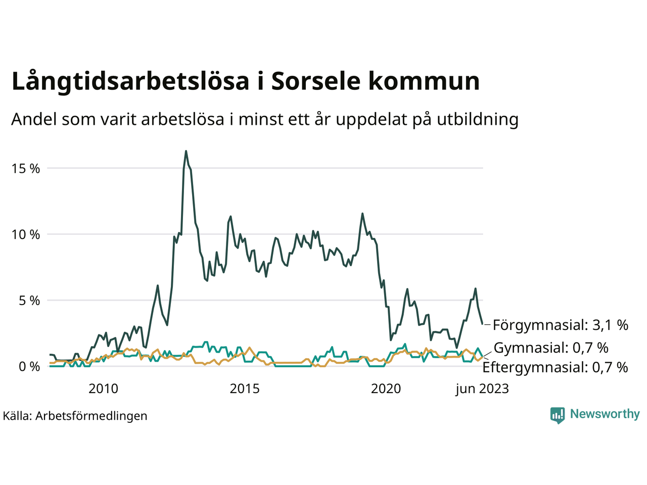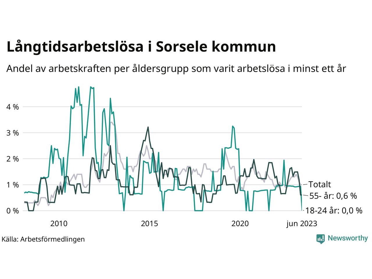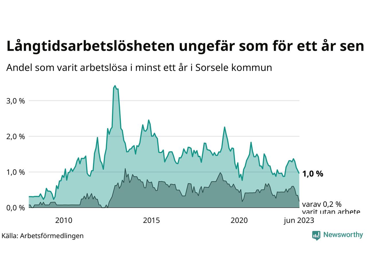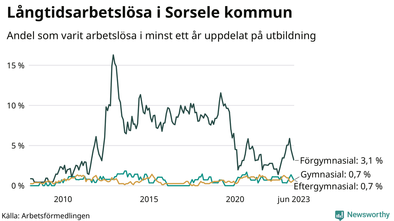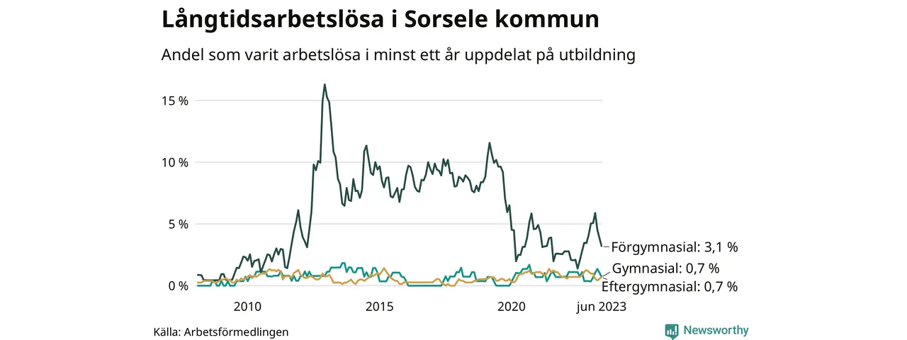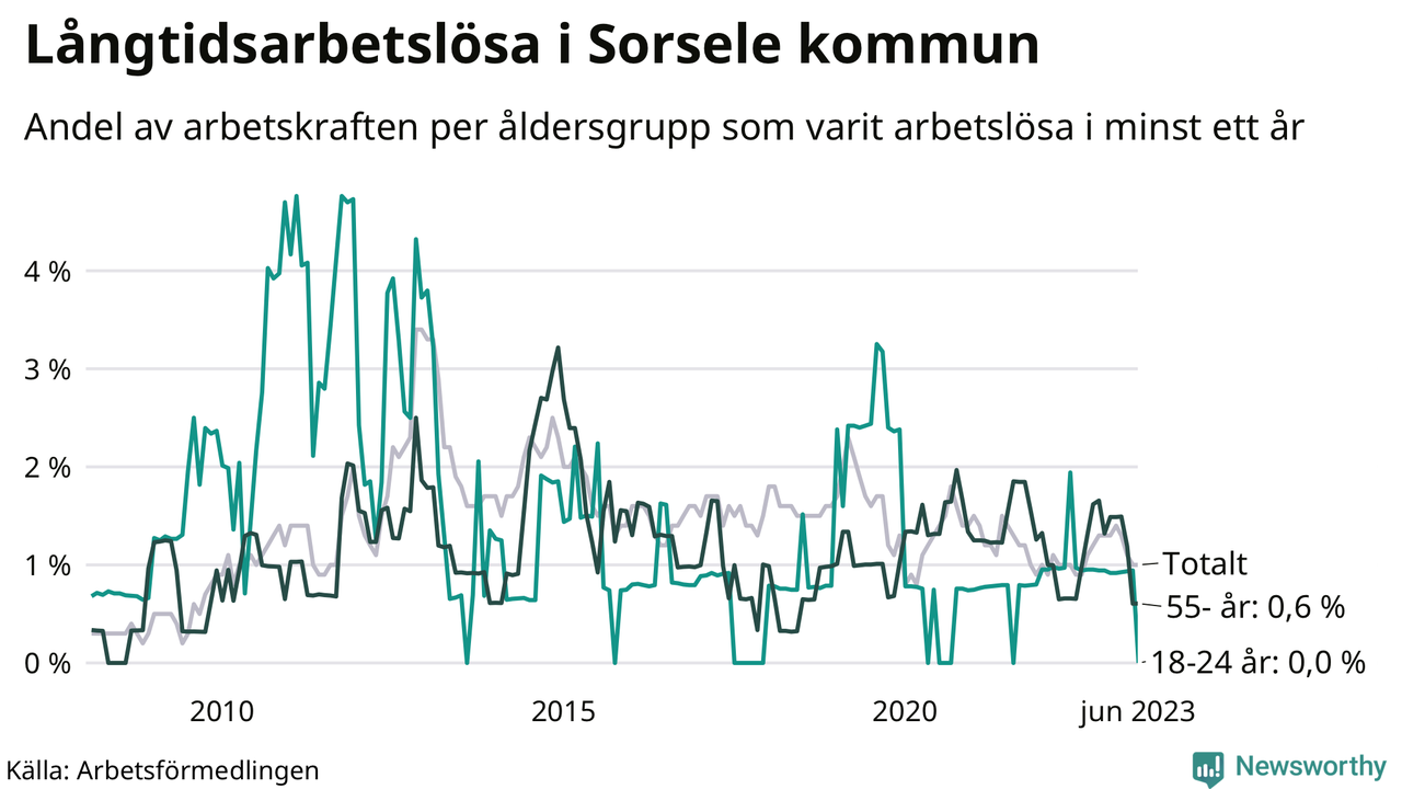 I juni hade elva Sorselebor varit arbetslösa i minst ett år, vilket är en färre än månaden innan. Det är den fjärde månaden i rad med minskande antal långtidsarbetslösa. Elva personer motsvarar 1,0 procent av arbetskraften i kommunen – andelen långtidsarbetslösa är ungefär på samma nivå som för ett år sedan. Sorsele hade lägst andel långtidsarbetslösa i landet i juni.