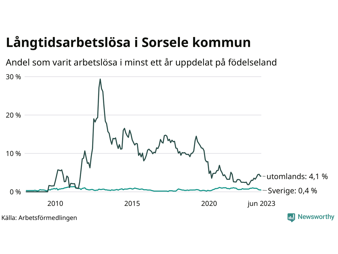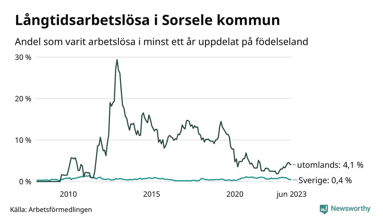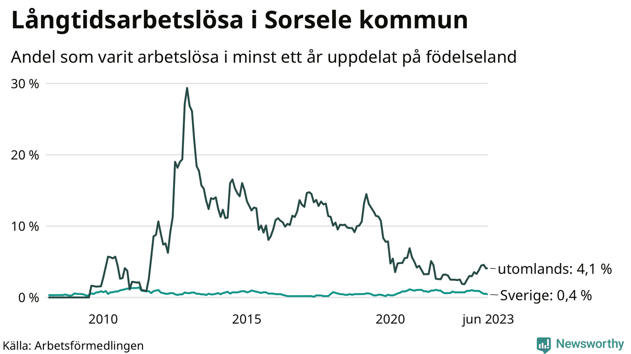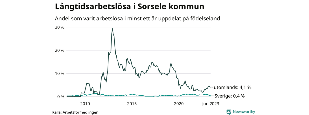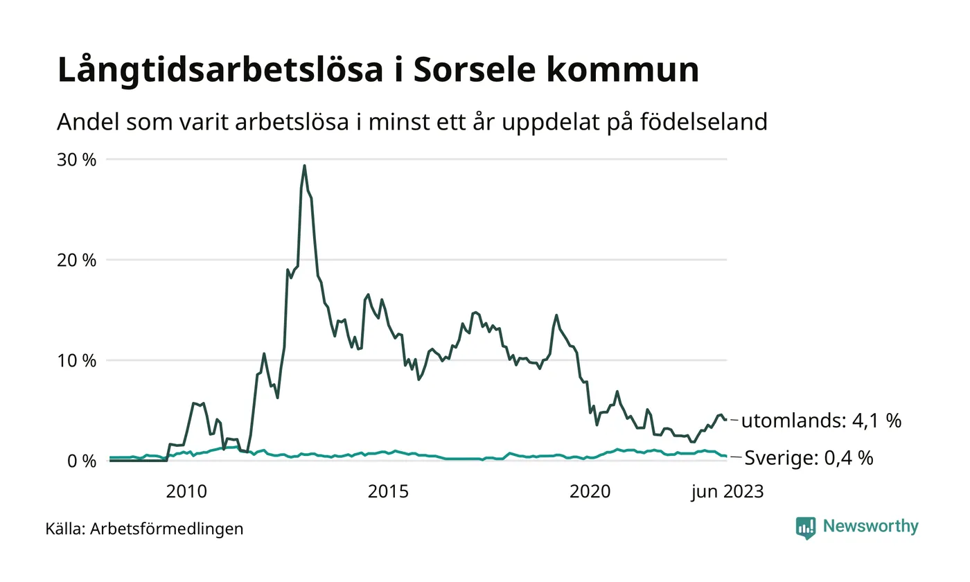 Fyra av de långtidsarbetslösa i Sorsele är födda i Sverige, medan sju är födda utomlands. Det innebär att långtidsarbetslösheten bland Sverigefödda är 0,4 procent, medan den är 4,1 procent bland födda utomlands. Även i riket som helhet är arbetslösheten högre bland utrikesfödda.