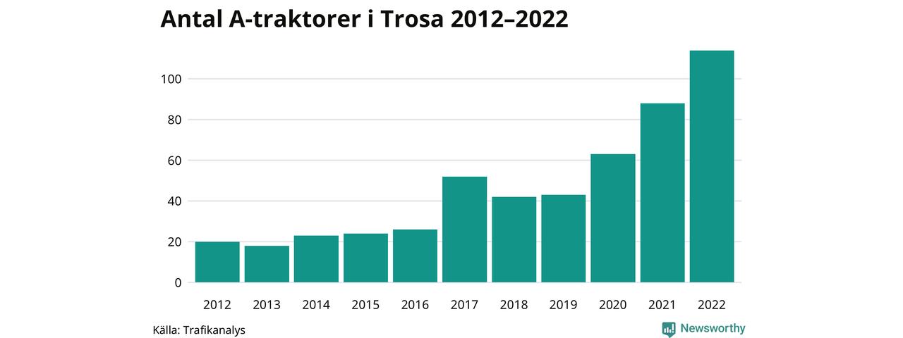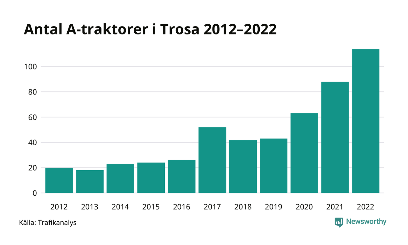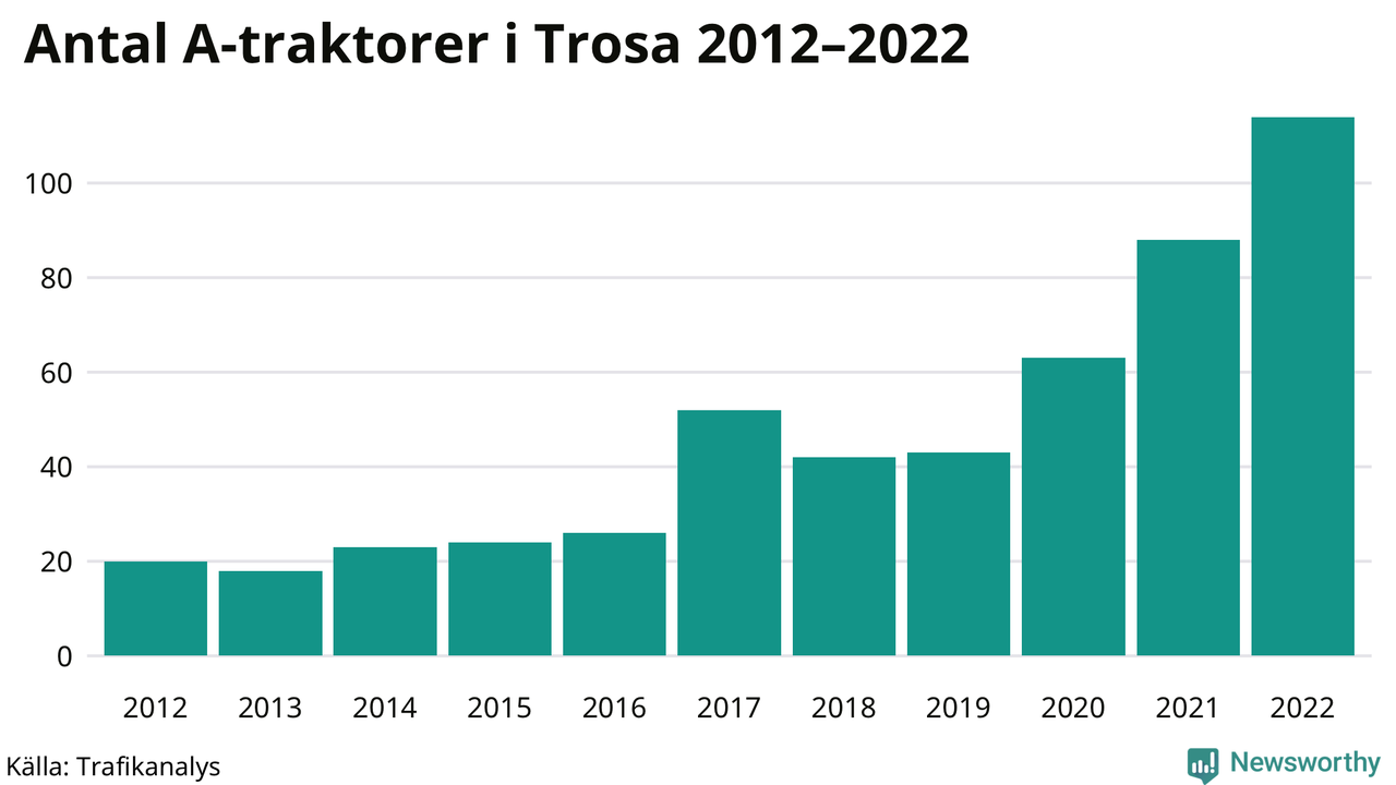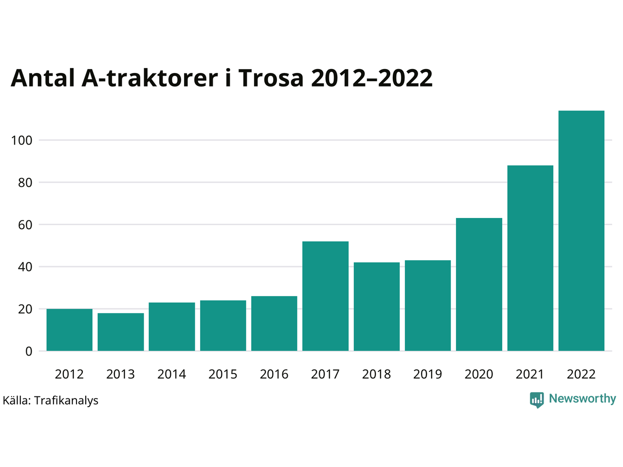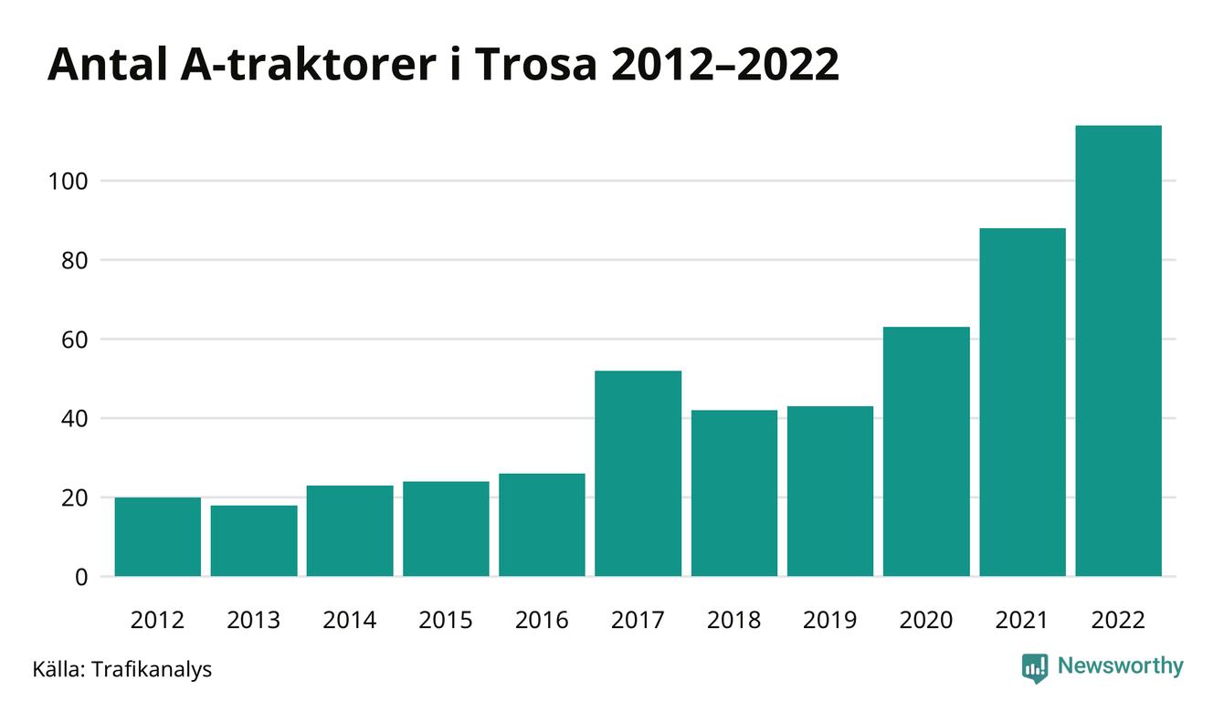 Det har aldrig funnits så många A-traktorer som nu i Trosa kommun. I slutet av 2022 fanns 114 A-traktorer registrerade i kommunen, nästan en sexdubbling jämfört med 2012. Därmed följer kommunen trenden i både Södermanlands län och i landet som helhet. Under motsvarande period har antalet A-traktorer nästan femdubblats i Södermanlands län och mer än tredubblats i riket som helhet.