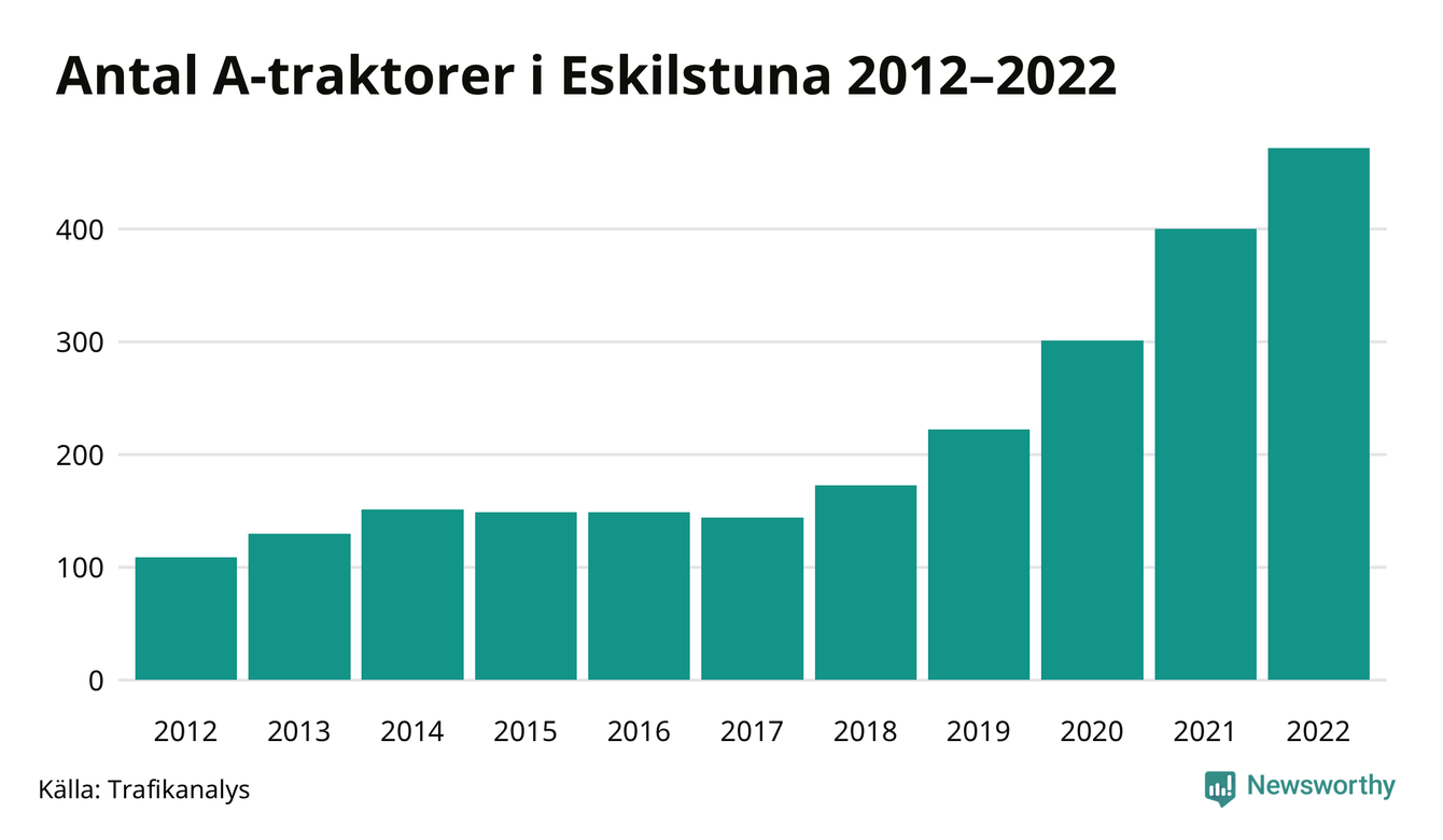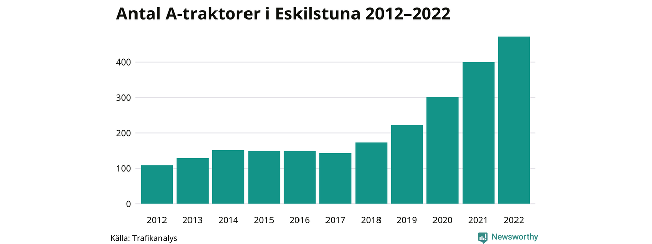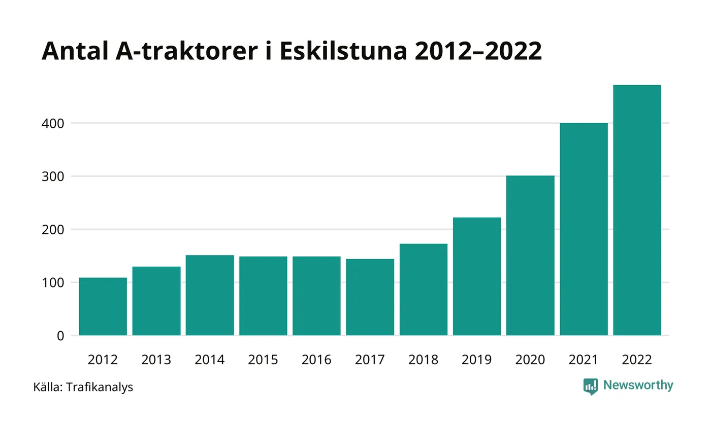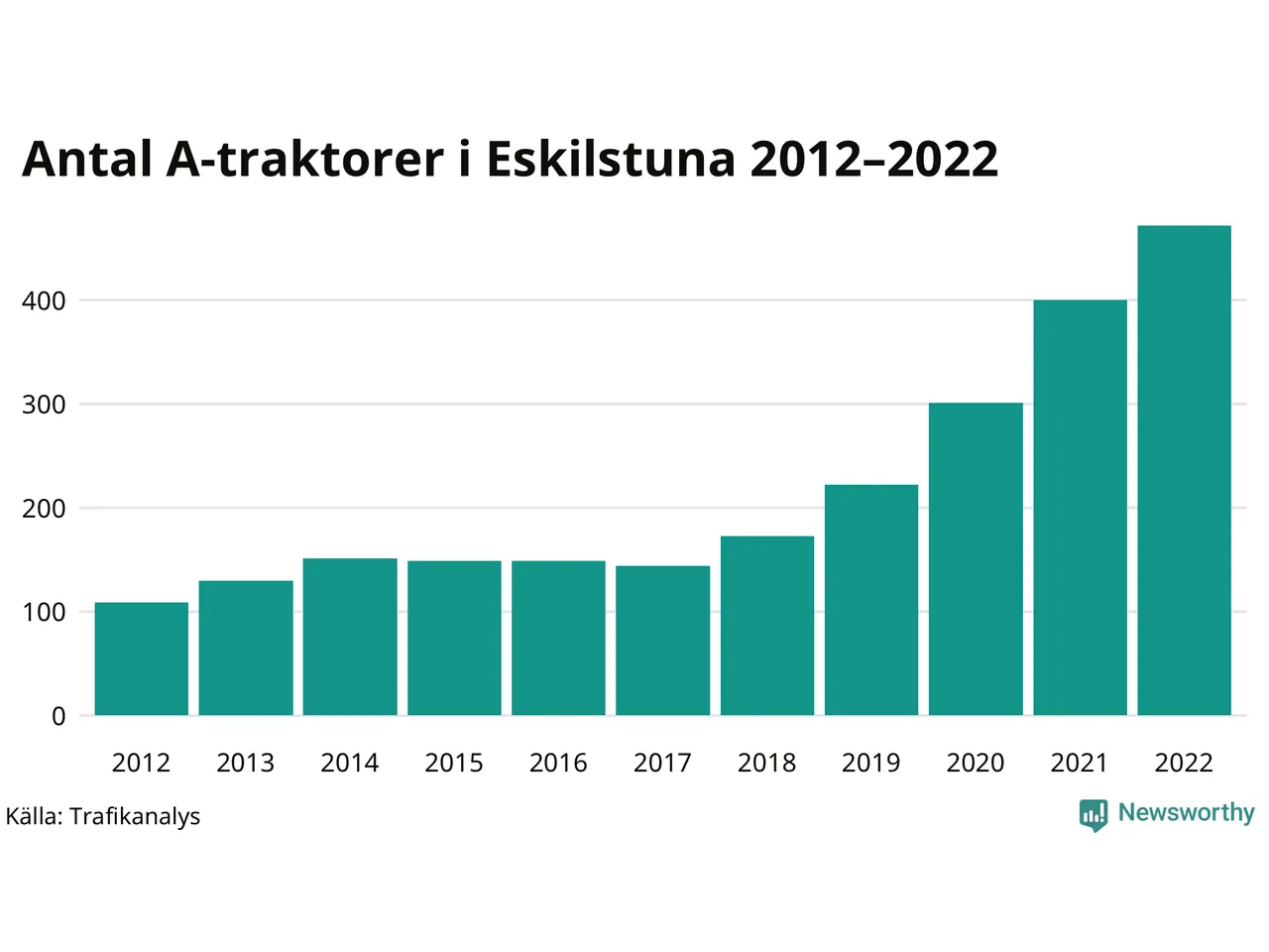 Det har aldrig funnits så många A-traktorer som nu i Eskilstuna kommun. I slutet av 2022 fanns 472 A-traktorer registrerade i kommunen, mer än en fyrdubbling jämfört med 2012. Därmed följer kommunen trenden i både Södermanlands län och i landet som helhet. Under motsvarande period har antalet A-traktorer nästan femdubblats i Södermanlands län och mer än tredubblats i riket som helhet.