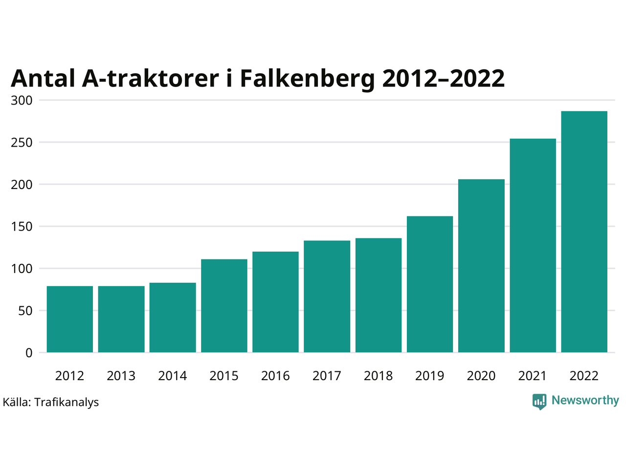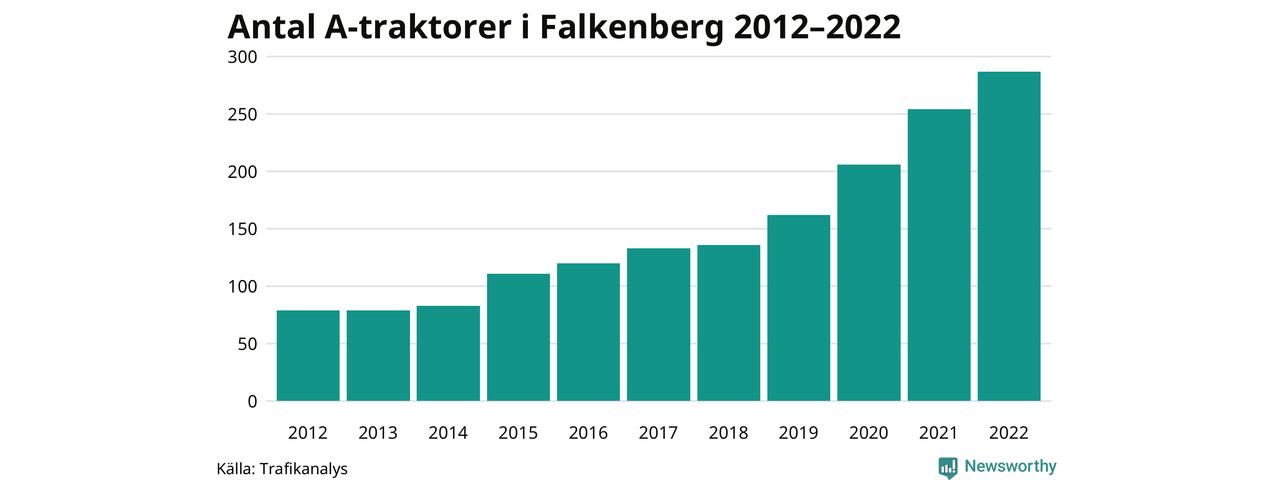 Det har aldrig funnits så många A-traktorer som nu i Falkenbergs kommun. I slutet av 2022 fanns 287 A-traktorer registrerade i kommunen, nästan en fyrdubbling jämfört med 2012. Därmed följer kommunen trenden i både Hallands län och i landet som helhet. Under motsvarande period har antalet A-traktorer mer än tredubblats i Hallands län och mer än tredubblats i riket som helhet.