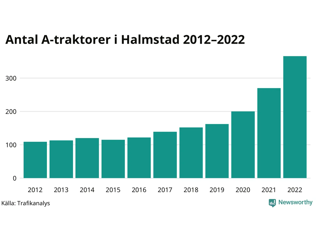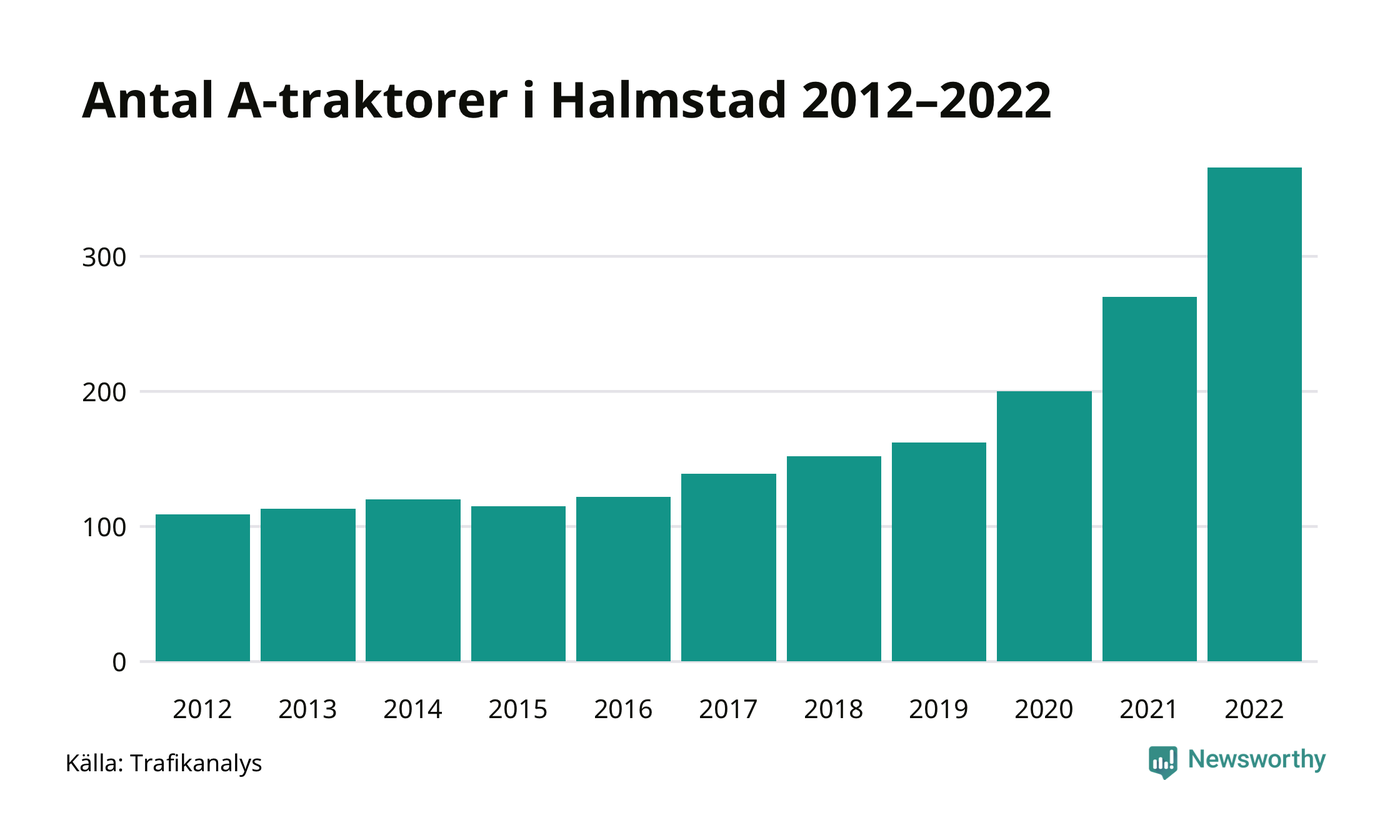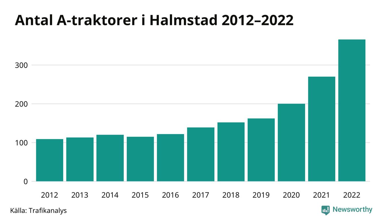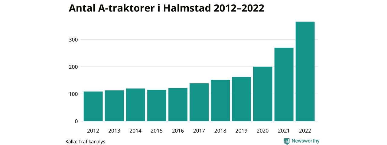 Det har aldrig funnits så många A-traktorer som nu i Halmstads kommun. I slutet av 2022 fanns 366 A-traktorer registrerade i kommunen, mer än en tredubbling jämfört med 2012. Därmed följer kommunen trenden i både Hallands län och i landet som helhet. Under motsvarande period har antalet A-traktorer mer än tredubblats i både Hallands län i Sverige som helhet.