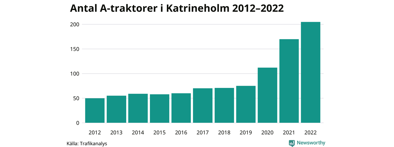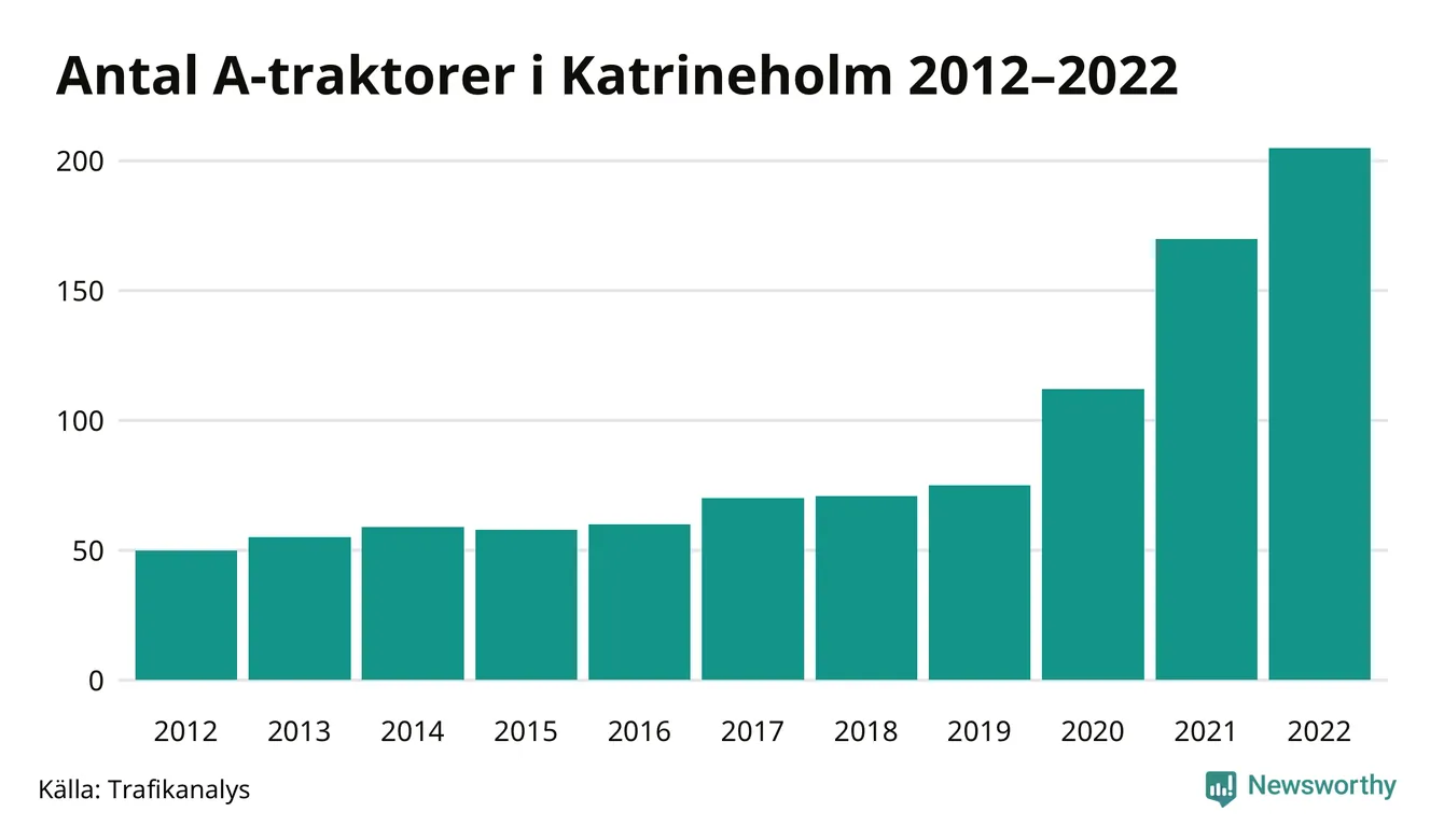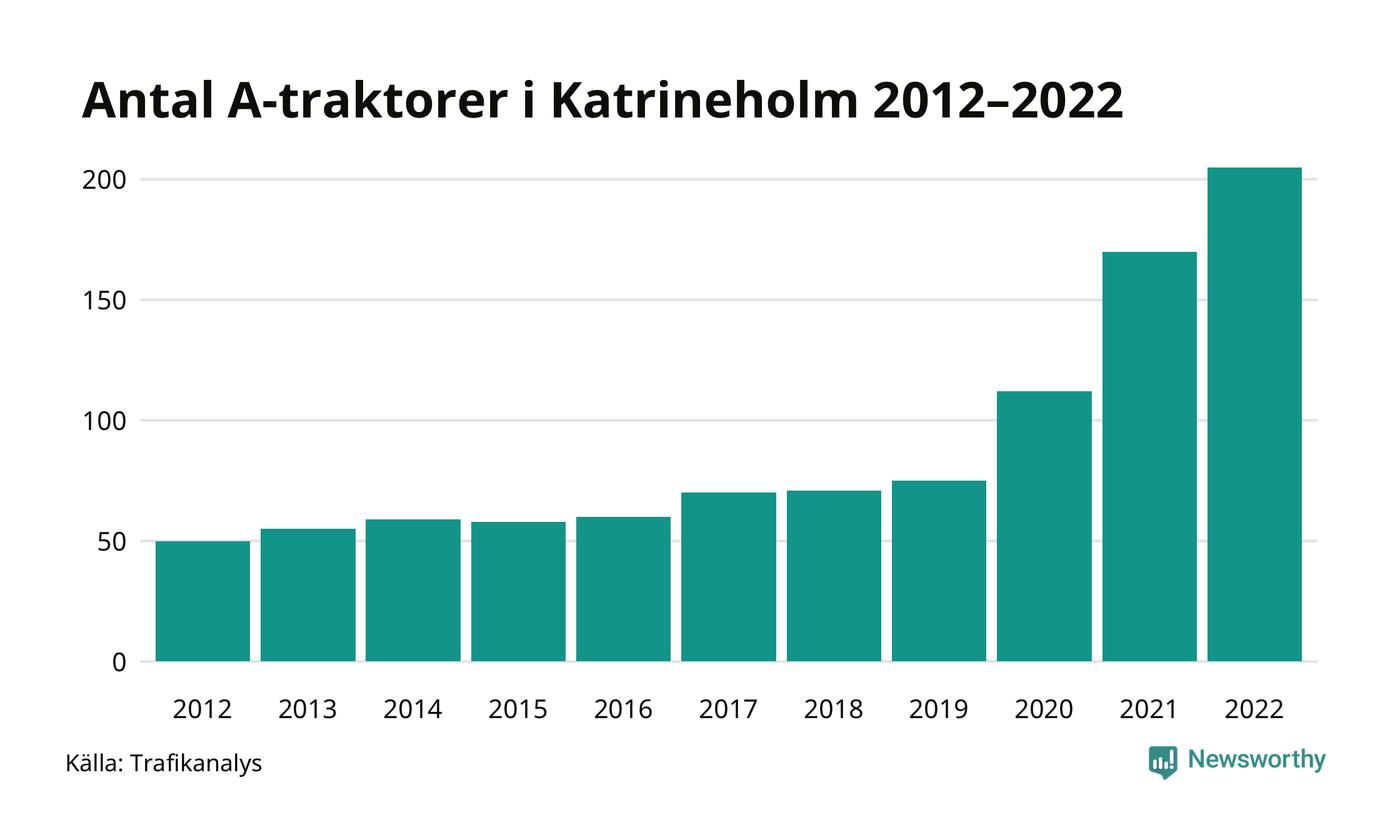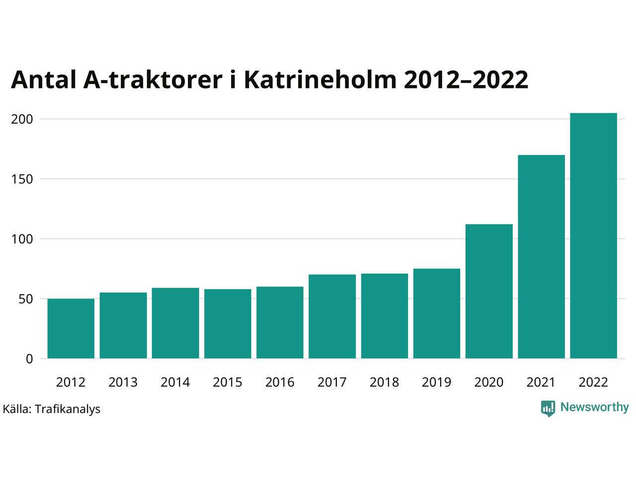 Det har aldrig funnits så många A-traktorer som nu i Katrineholms kommun. I slutet av 2022 fanns 205 A-traktorer registrerade i kommunen, mer än en fyrdubbling jämfört med 2012. Därmed följer kommunen trenden i både Södermanlands län och i landet som helhet. Under motsvarande period har antalet A-traktorer nästan femdubblats i Södermanlands län och mer än tredubblats i riket som helhet.