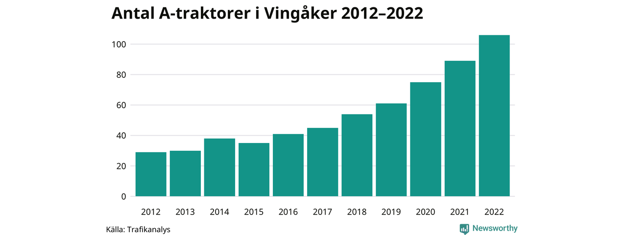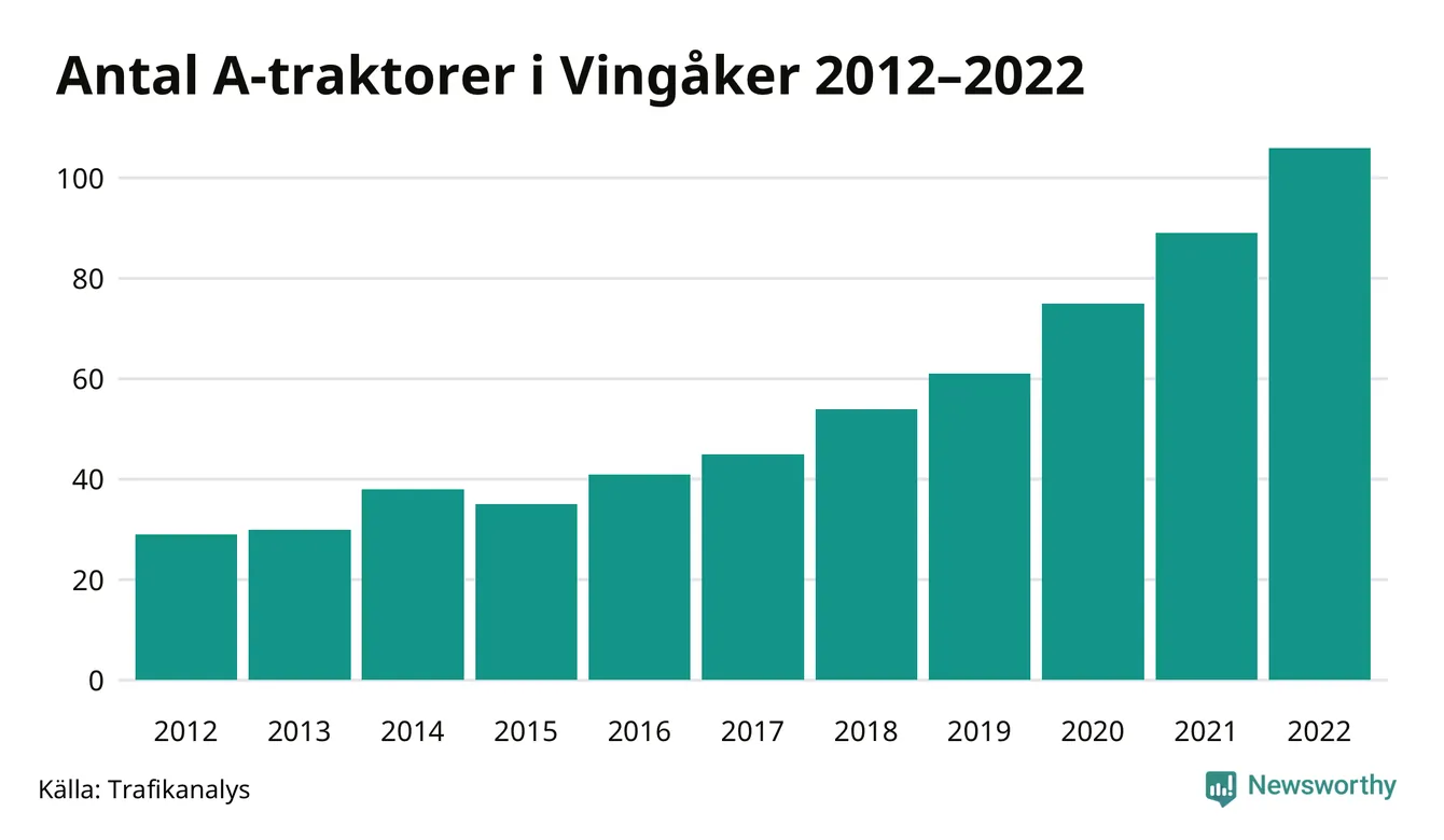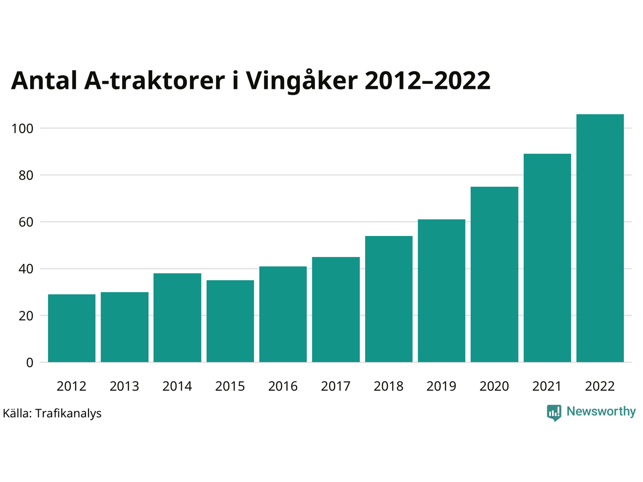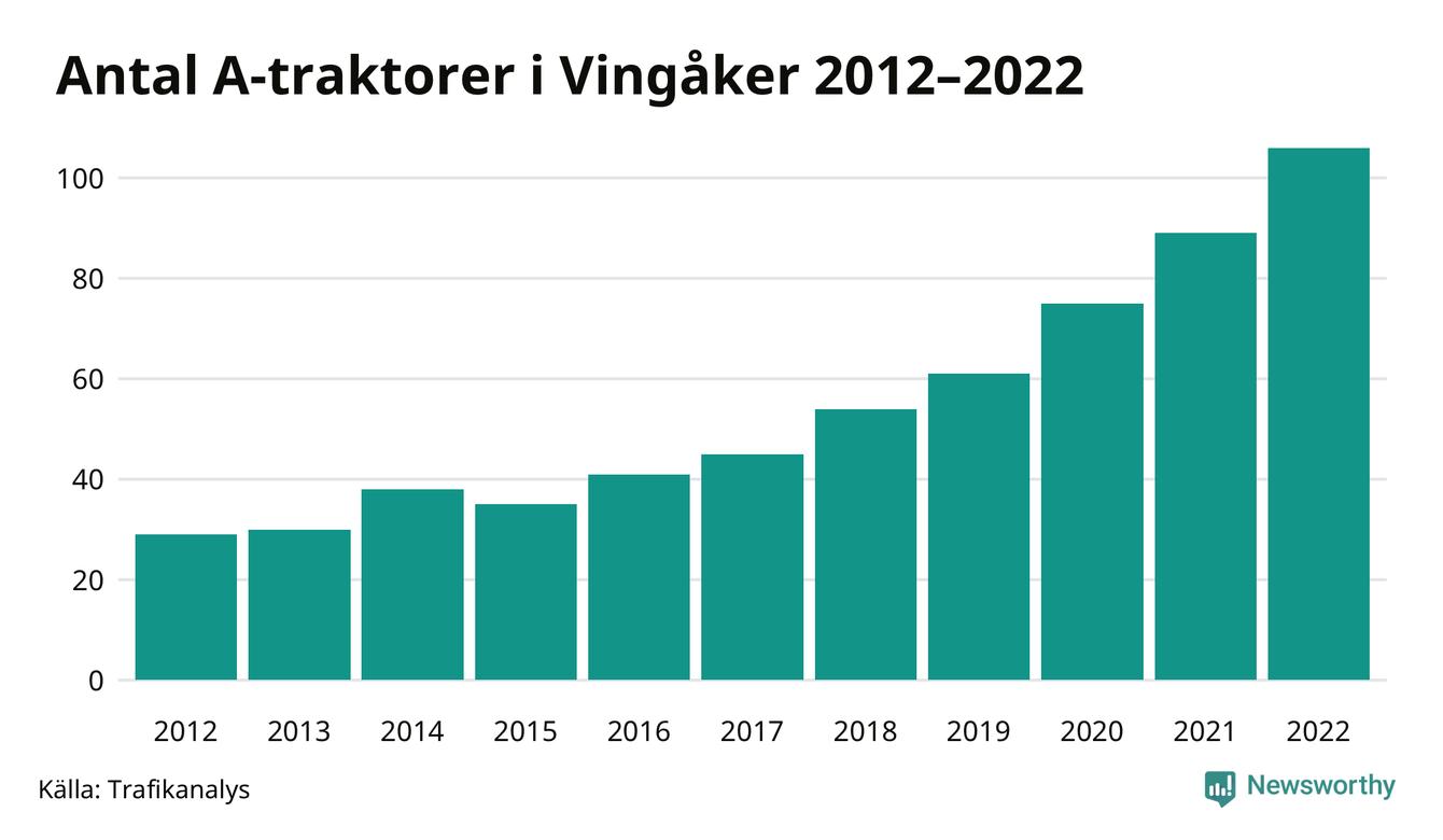Det har aldrig funnits så många A-traktorer som nu i Vingåkers kommun. I slutet av 2022 fanns 106 A-traktorer registrerade i kommunen, nästan en fyrdubbling jämfört med 2012. Därmed följer kommunen trenden i både Södermanlands län och i landet som helhet. Under motsvarande period har antalet A-traktorer nästan femdubblats i Södermanlands län och mer än tredubblats i riket som helhet.