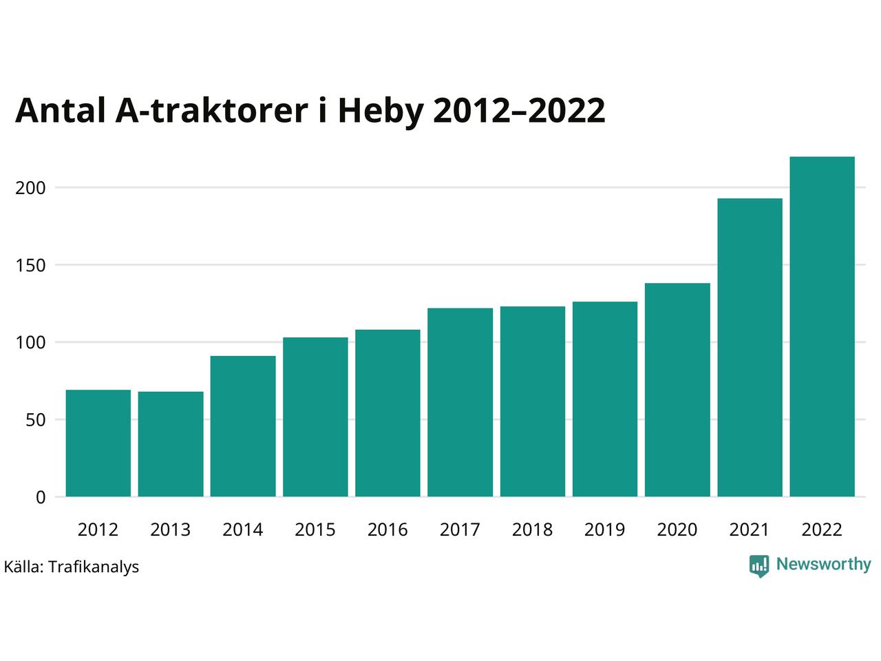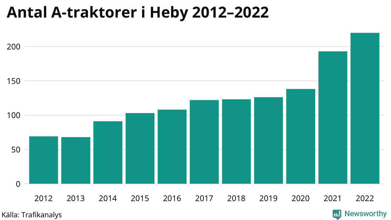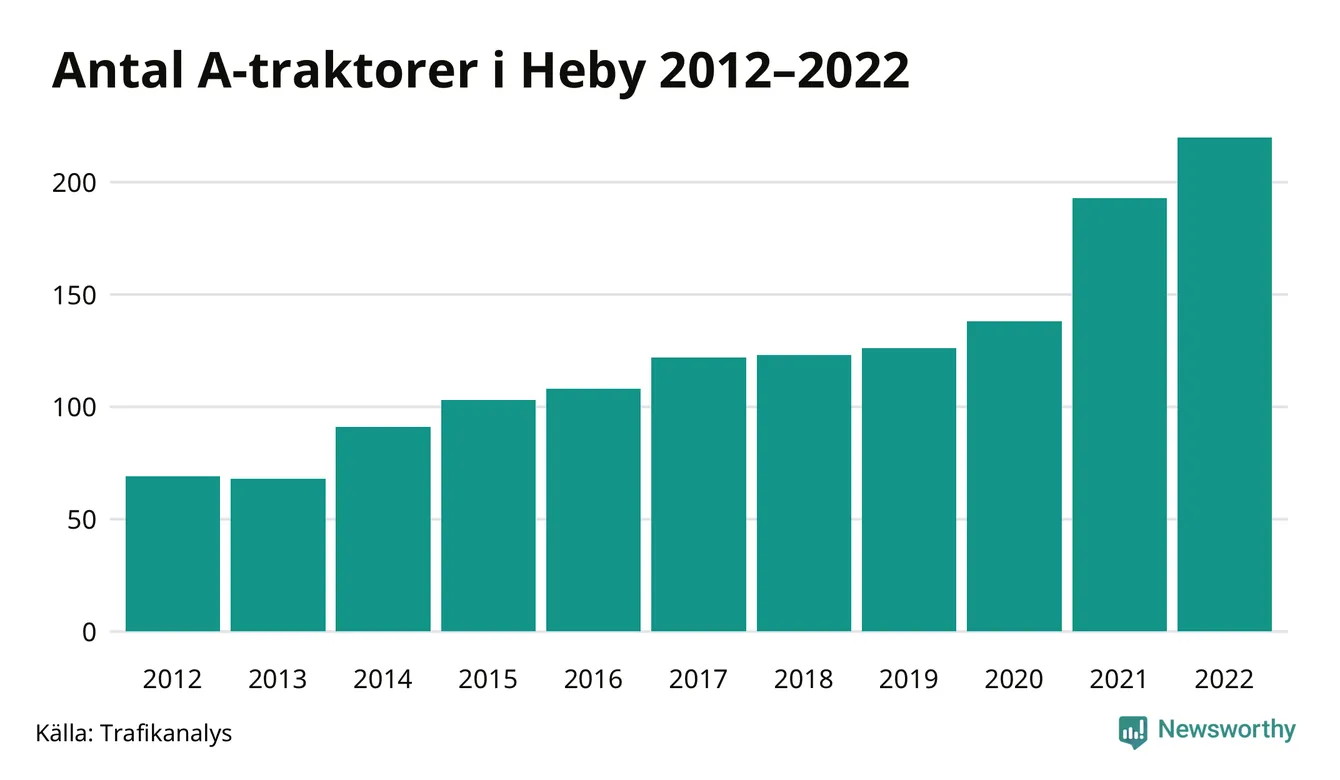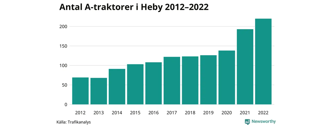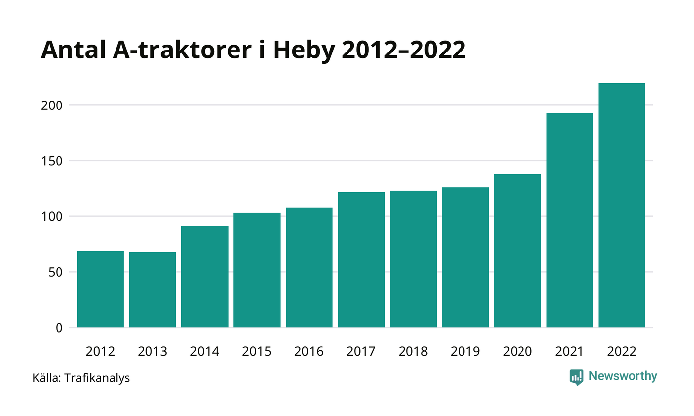 Det har aldrig funnits så många A-traktorer som nu i Heby kommun. I slutet av 2022 fanns 220 A-traktorer registrerade i kommunen, mer än en tredubbling jämfört med 2012. Därmed följer kommunen trenden i både Uppsala län och i landet som helhet. Under motsvarande period har antalet A-traktorer tredubblats i Uppsala län och mer än tredubblats i riket som helhet.