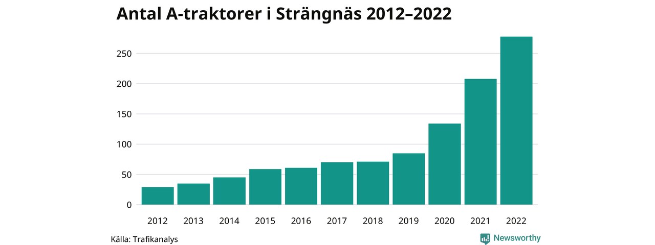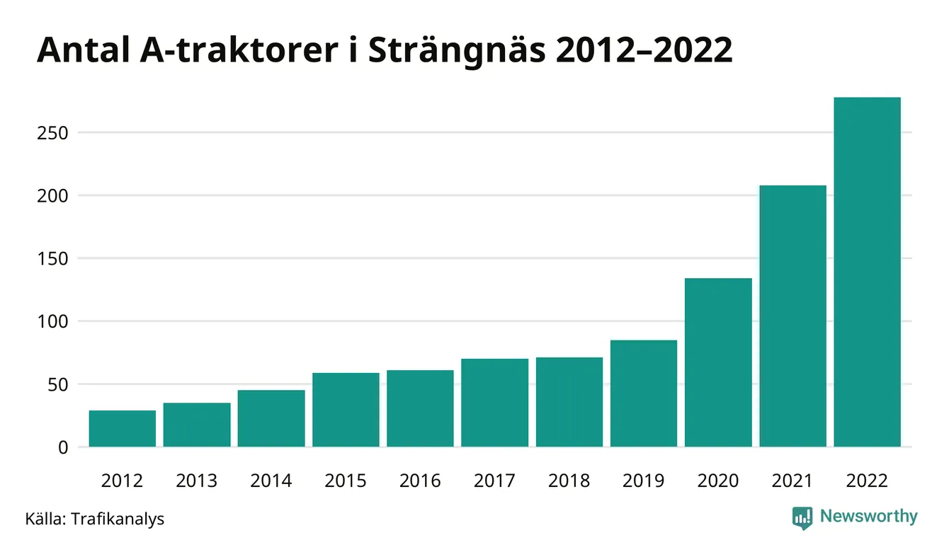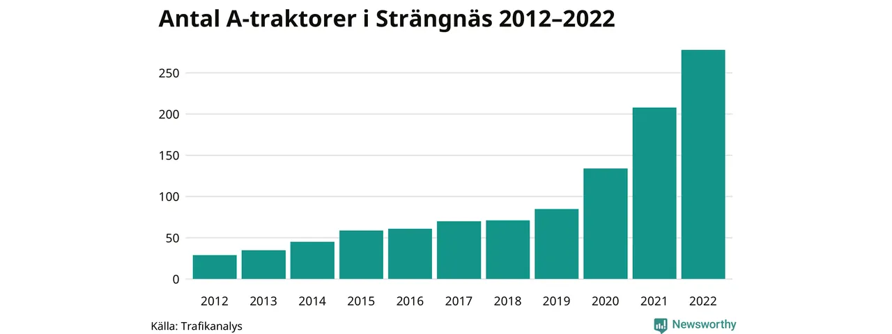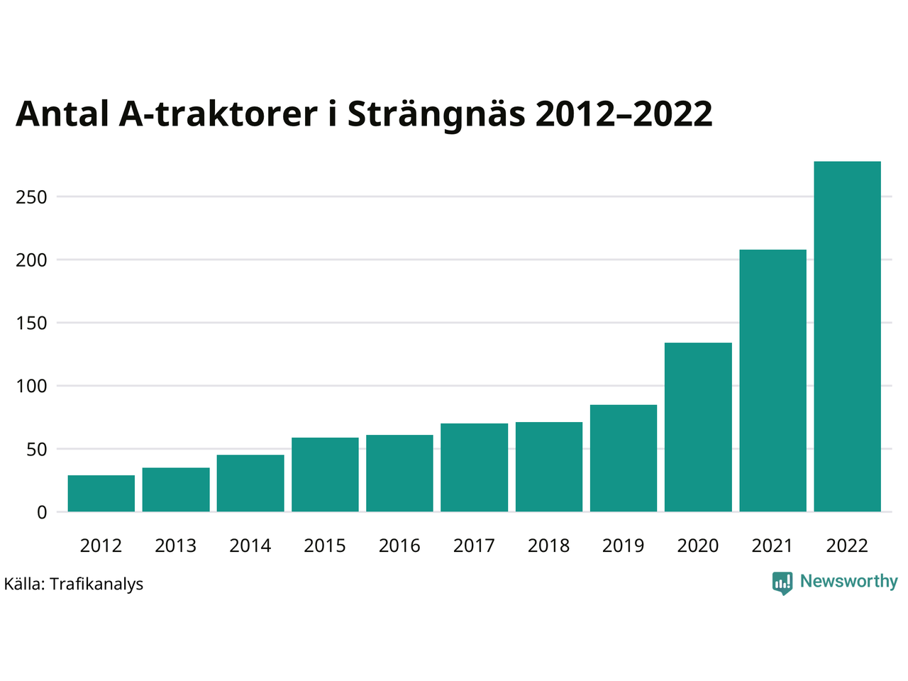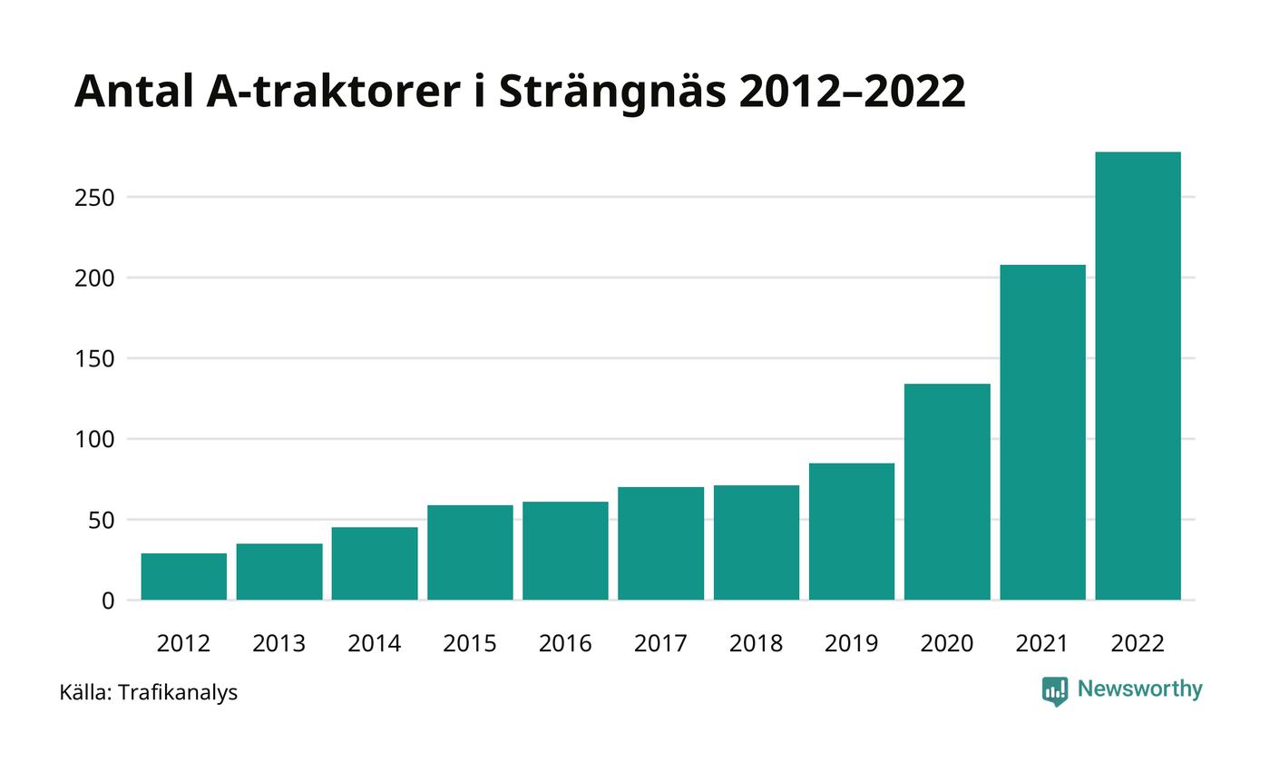 Det har aldrig funnits så många A-traktorer som nu i Strängnäs kommun. I slutet av 2022 fanns 278 A-traktorer registrerade i kommunen, nästan en tiodubbling jämfört med 2012. Därmed följer kommunen trenden i både Södermanlands län och i landet som helhet. Under motsvarande period har antalet A-traktorer nästan femdubblats i Södermanlands län och mer än tredubblats i riket som helhet.