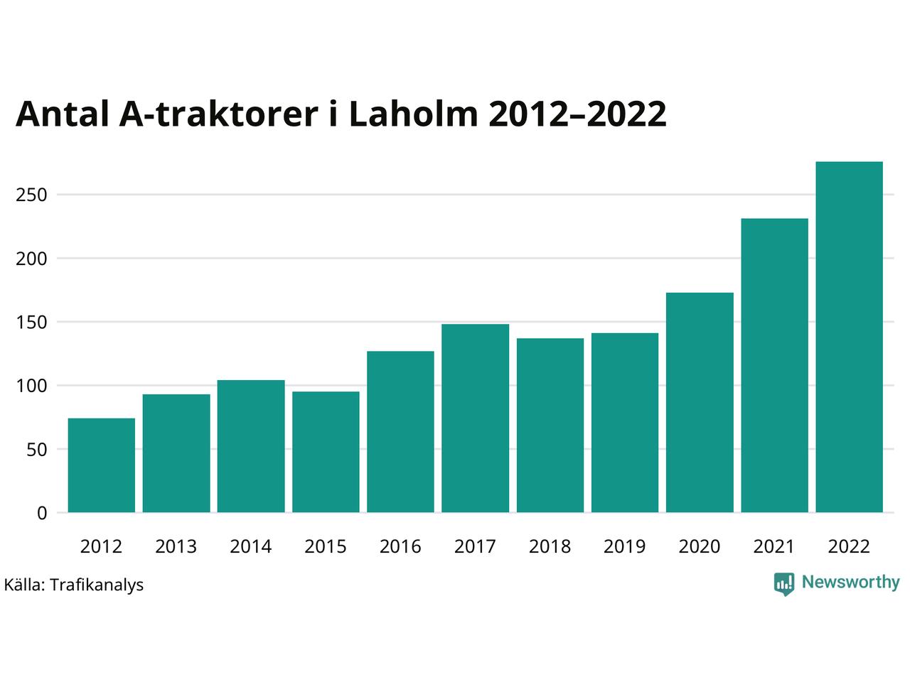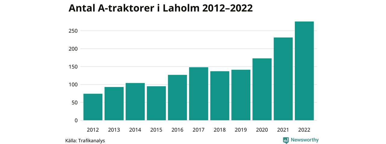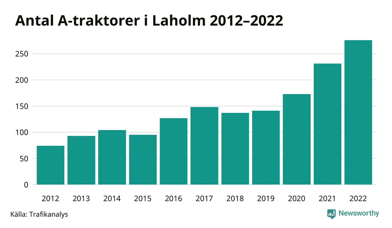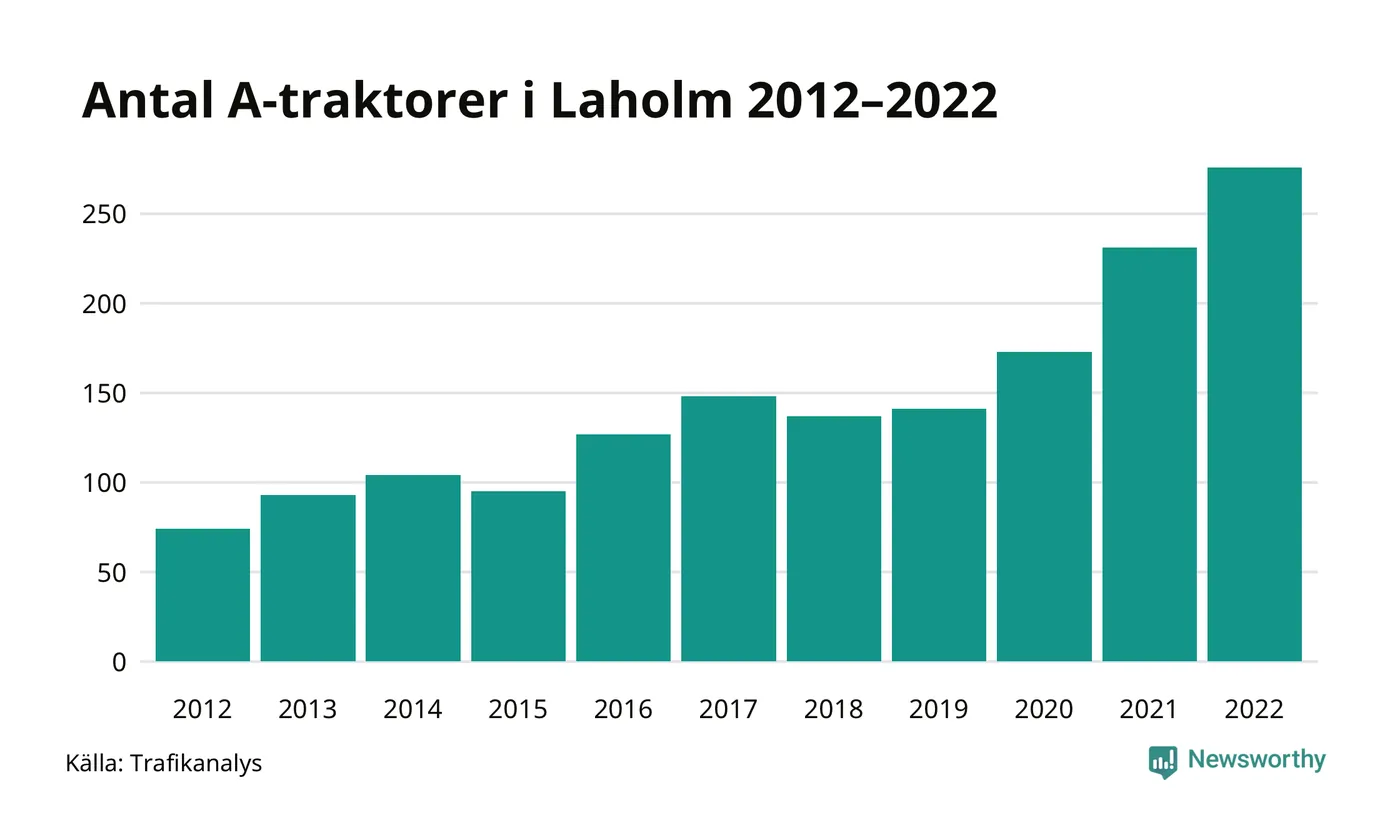 Det har aldrig funnits så många A-traktorer som nu i Laholms kommun. I slutet av 2022 fanns 276 A-traktorer registrerade i kommunen, nästan en fyrdubbling jämfört med 2012. Därmed följer kommunen trenden i både Hallands län och i landet som helhet. Under motsvarande period har antalet A-traktorer mer än tredubblats i Hallands län och mer än tredubblats i riket som helhet.