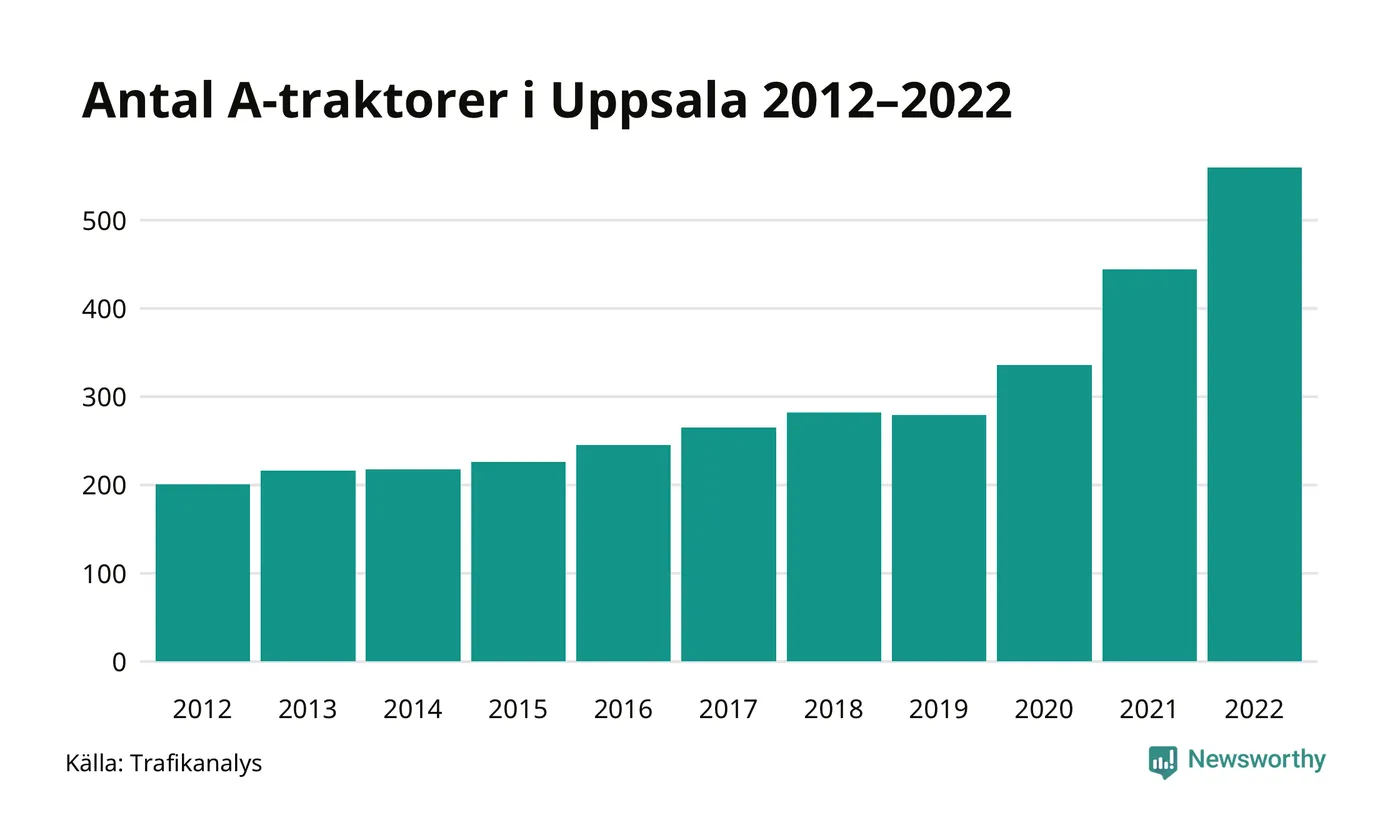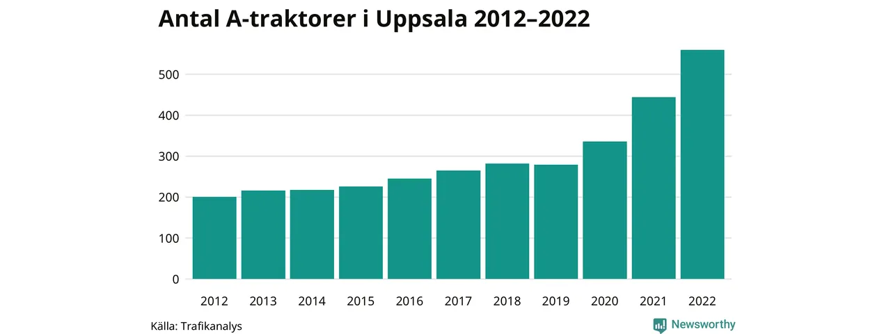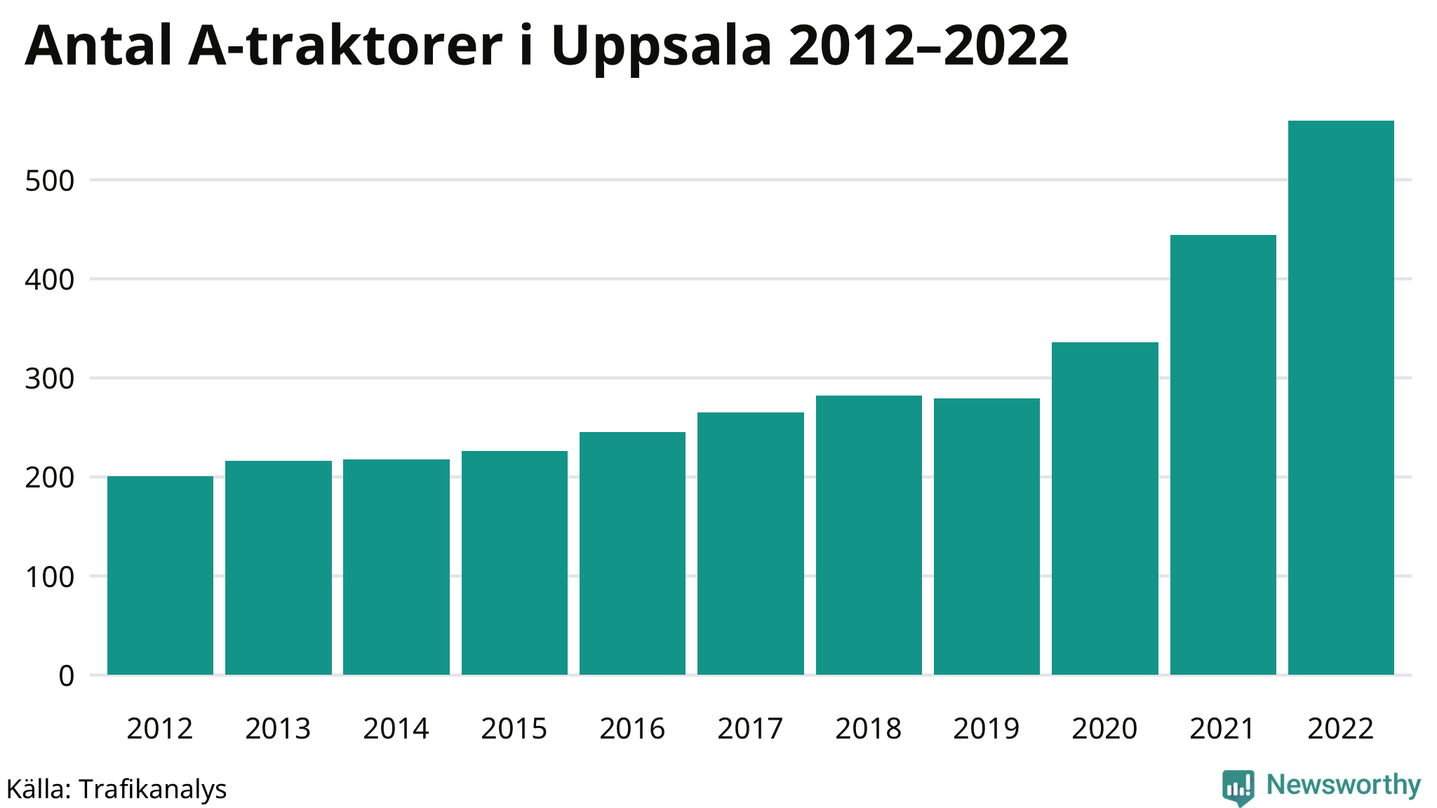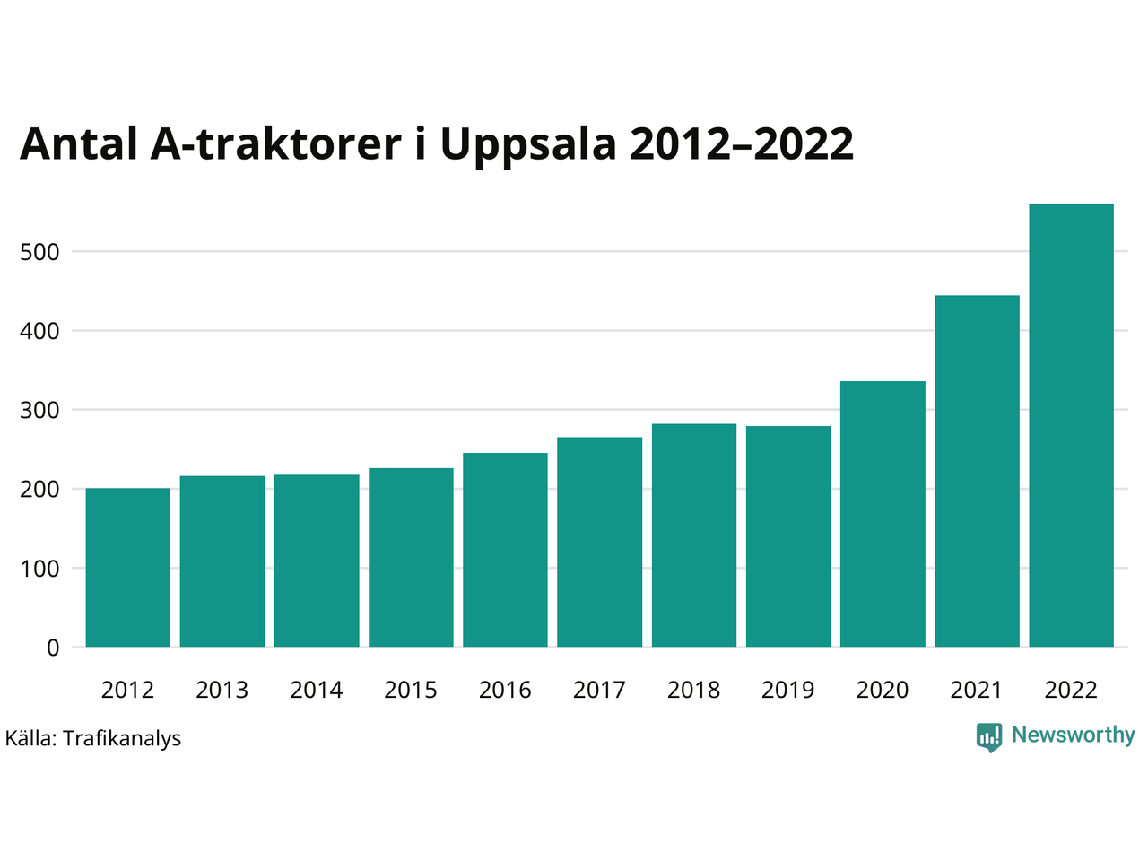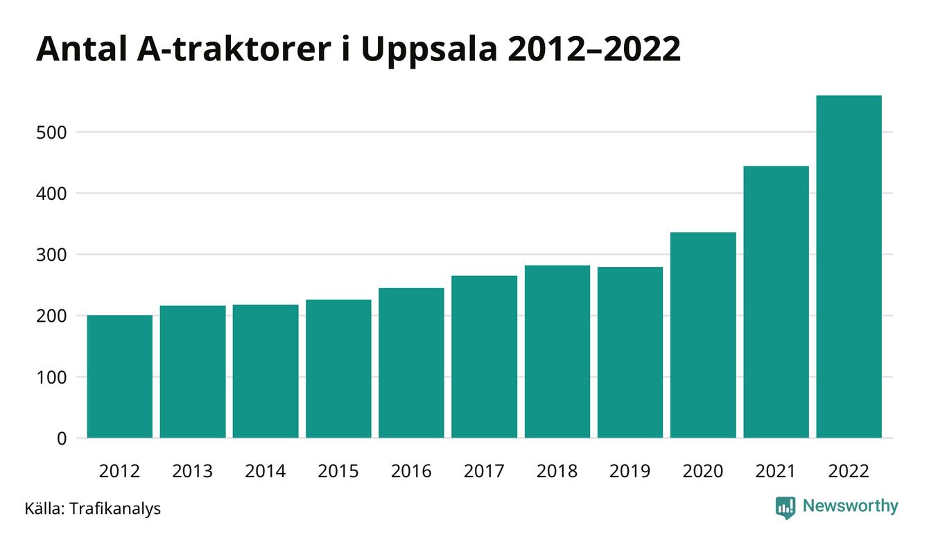 Det har aldrig funnits så många A-traktorer som nu i Uppsala kommun. I slutet av 2022 fanns 560 A-traktorer registrerade i kommunen, nästan en tredubbling jämfört med 2012. Därmed följer kommunen trenden i både Uppsala län och i landet som helhet. Under motsvarande period har antalet A-traktorer tredubblats i Uppsala län och mer än tredubblats i riket som helhet.