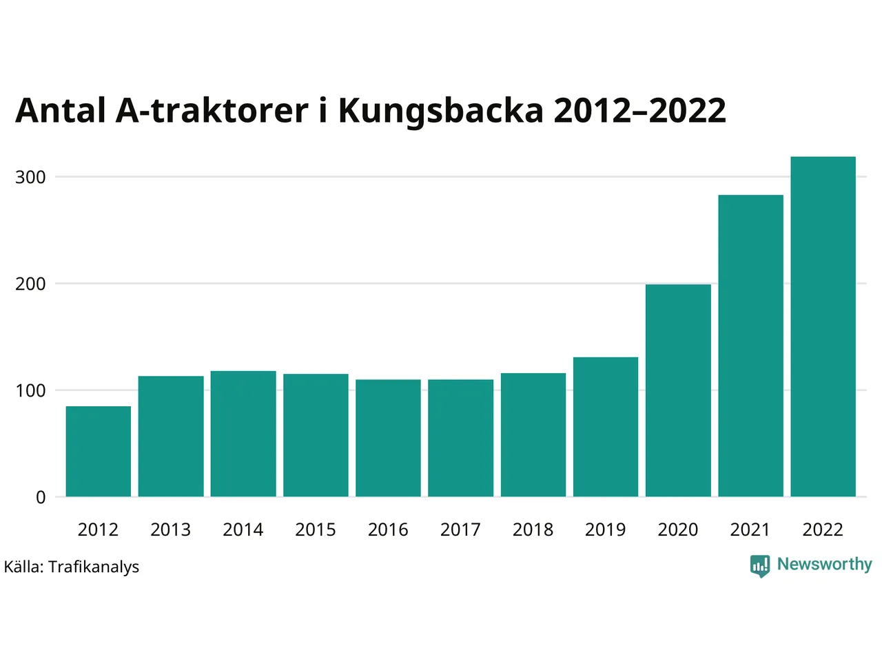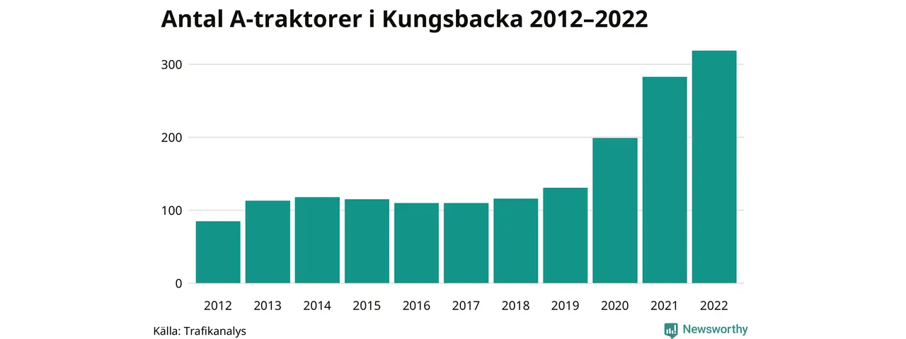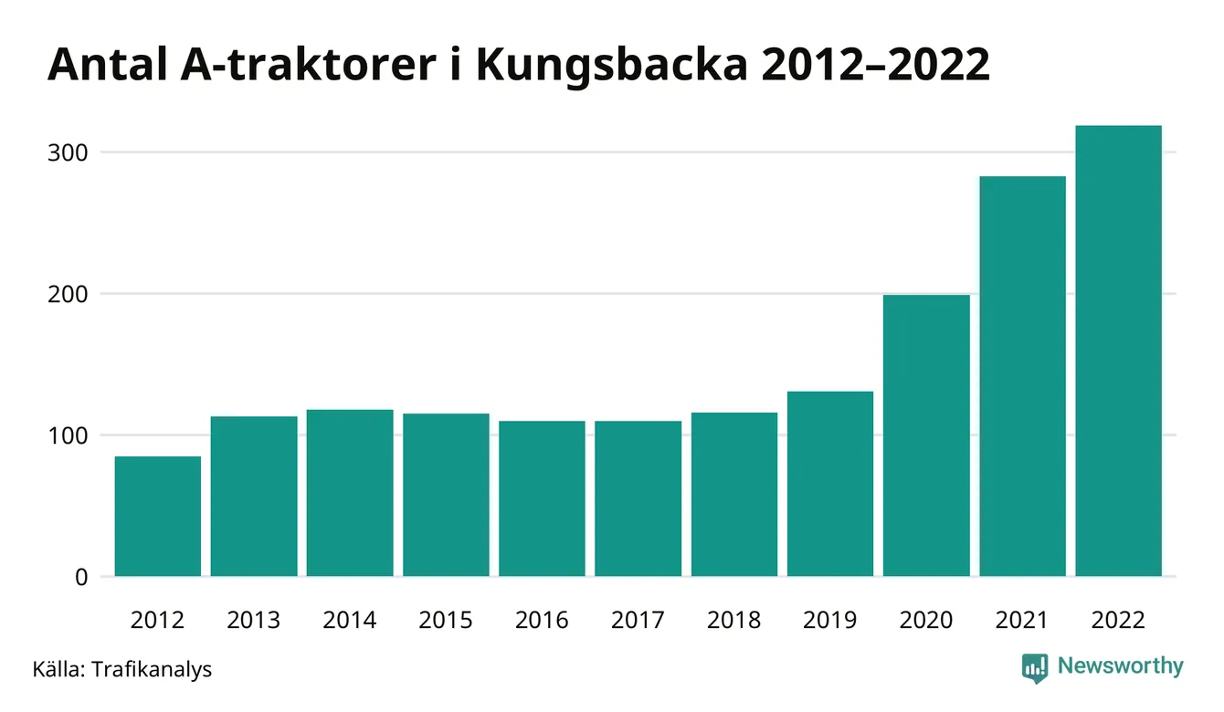 Det har aldrig funnits så många A-traktorer som nu i Kungsbacka kommun. I slutet av 2022 fanns 319 A-traktorer registrerade i kommunen, nästan en fyrdubbling jämfört med 2012. Därmed följer kommunen trenden i både Hallands län och i landet som helhet. Under motsvarande period har antalet A-traktorer mer än tredubblats i Hallands län och mer än tredubblats i riket som helhet.