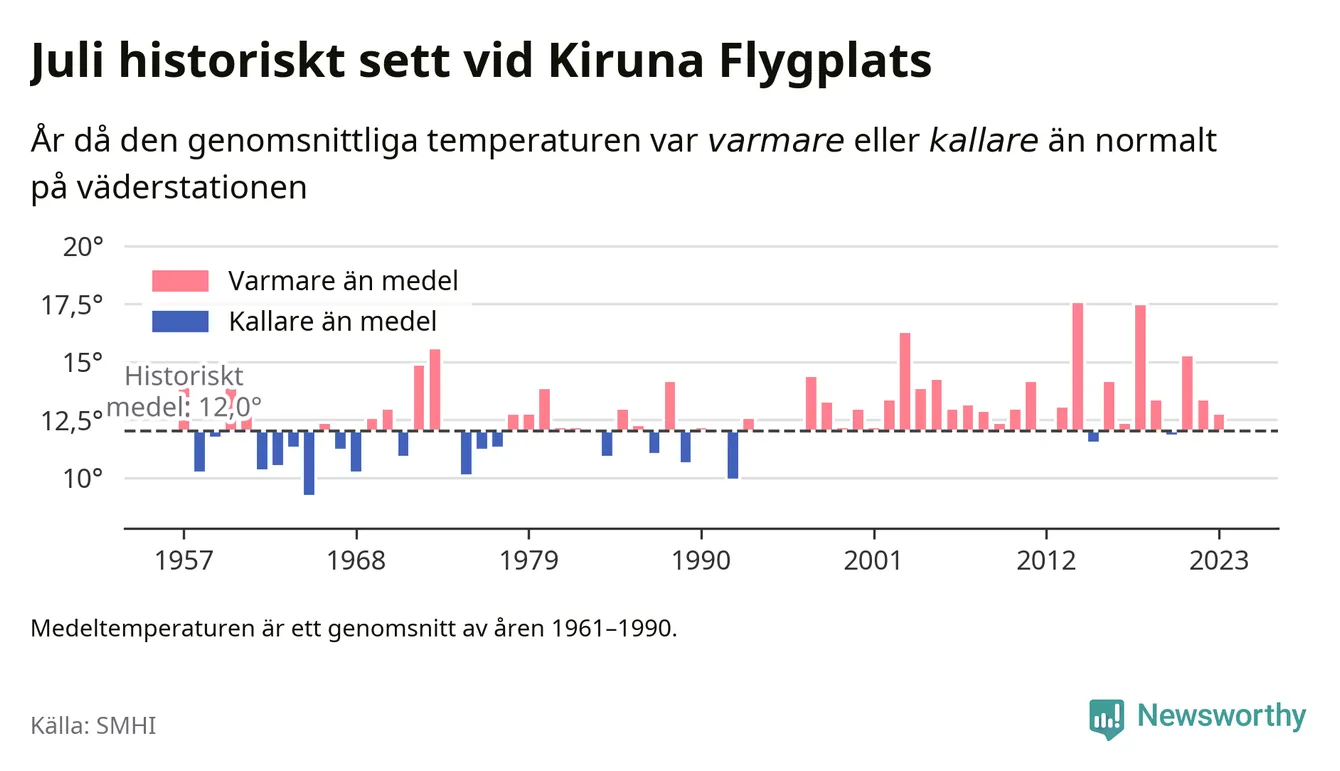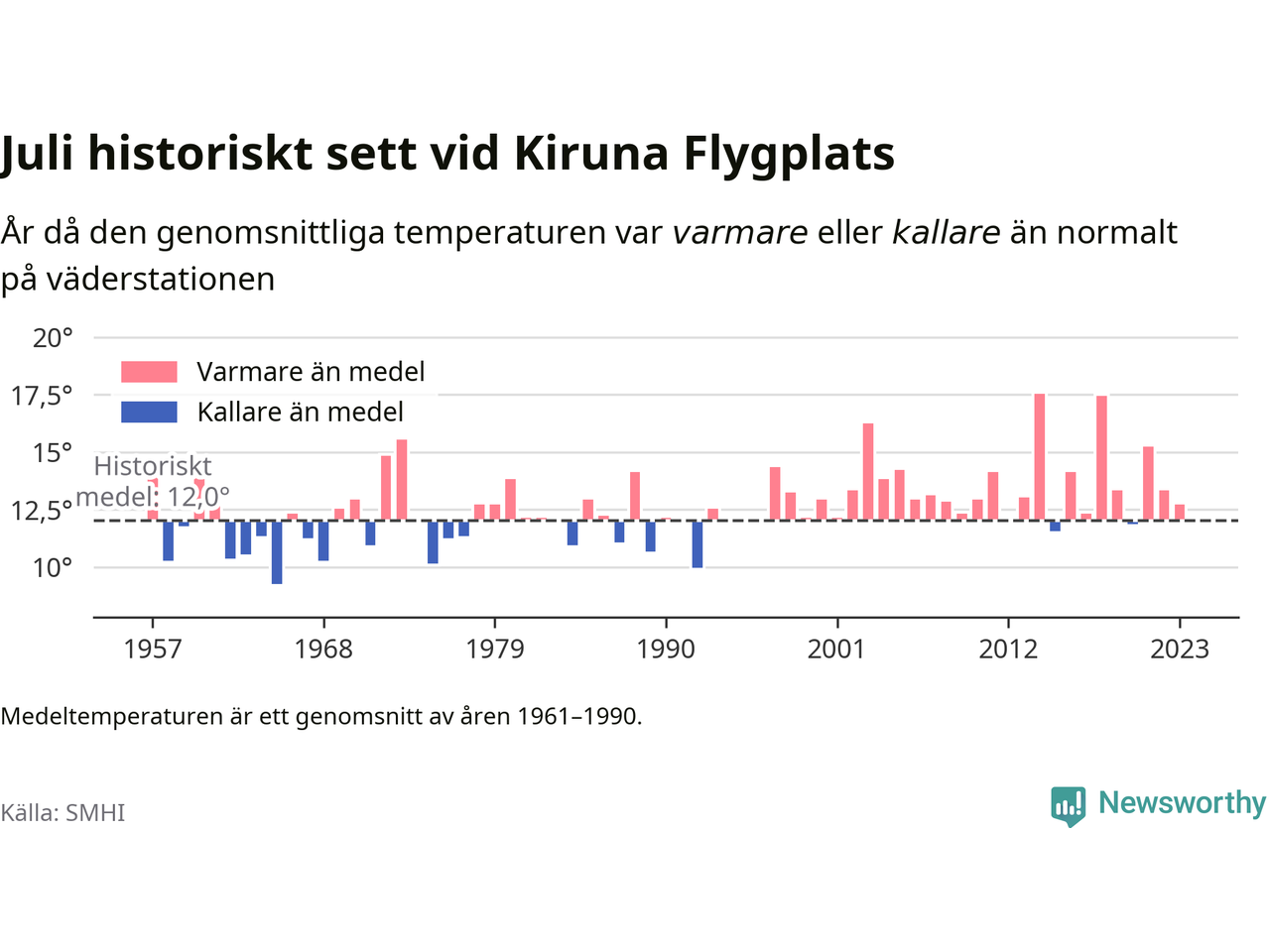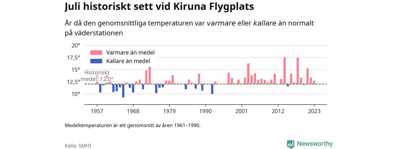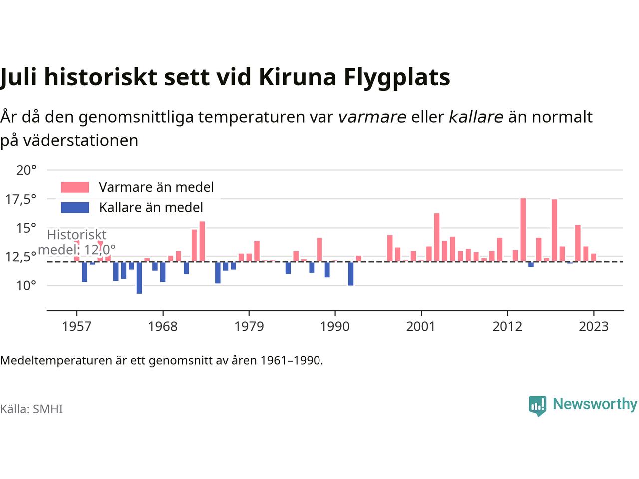 Under 20 av 31 dagar låg medeltemperaturen över det normala i Kiruna. Åtta av de här dagarna var temperaturen betydligt1 högre än vanligt.
