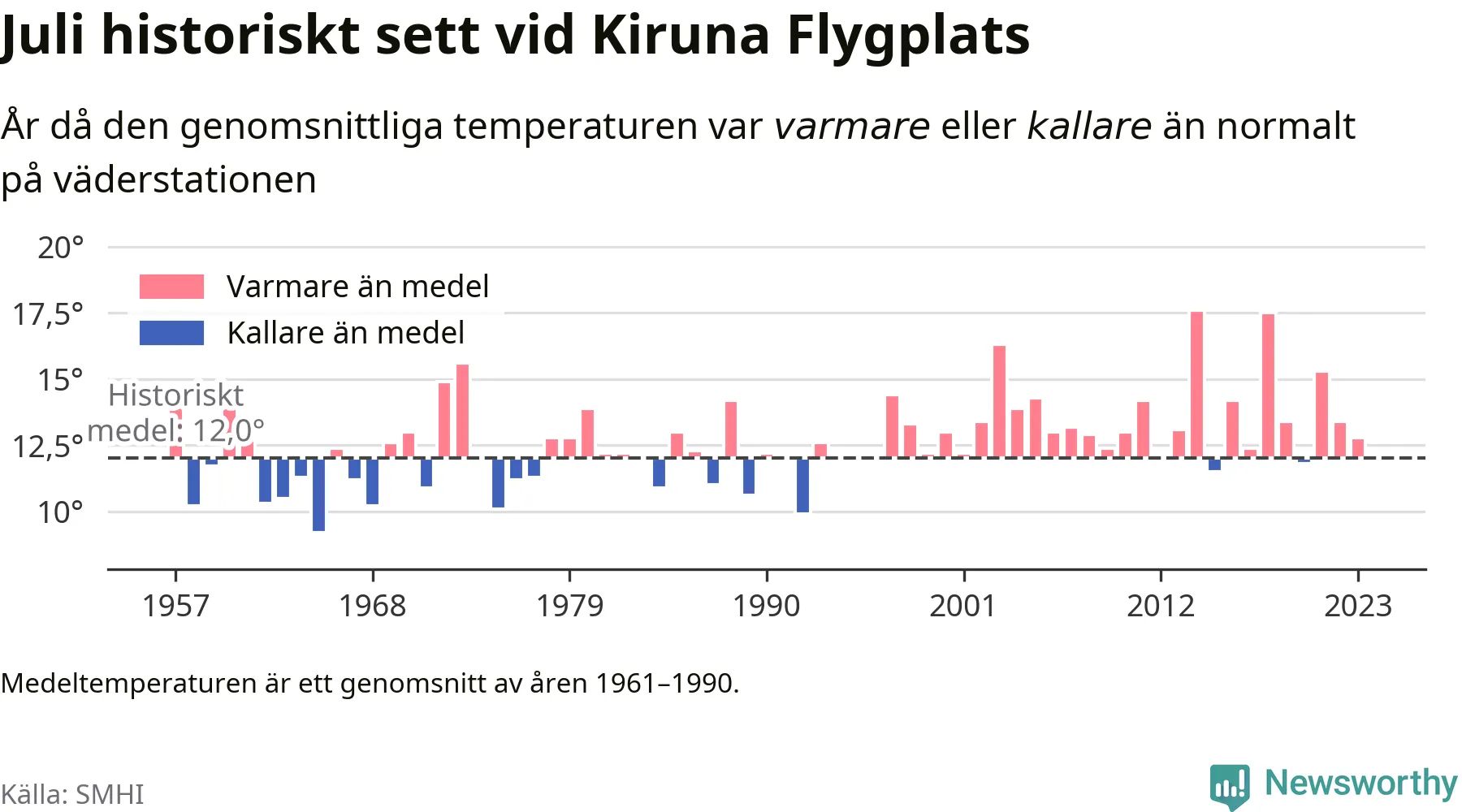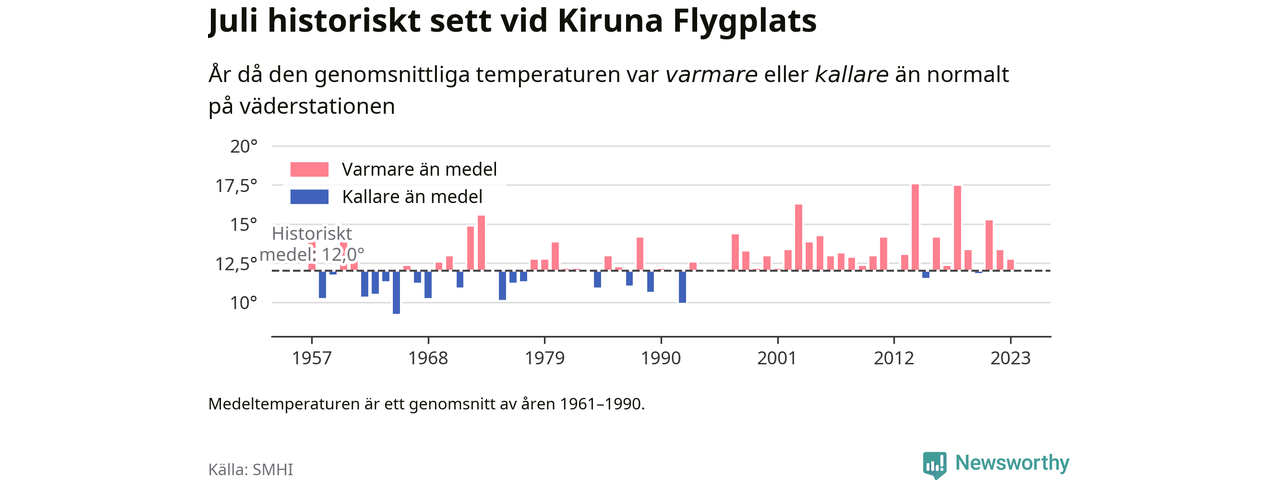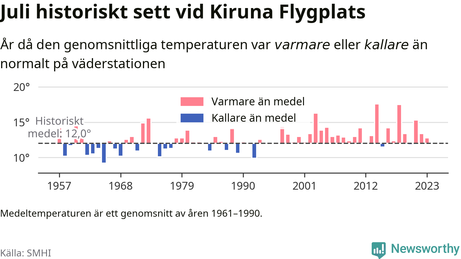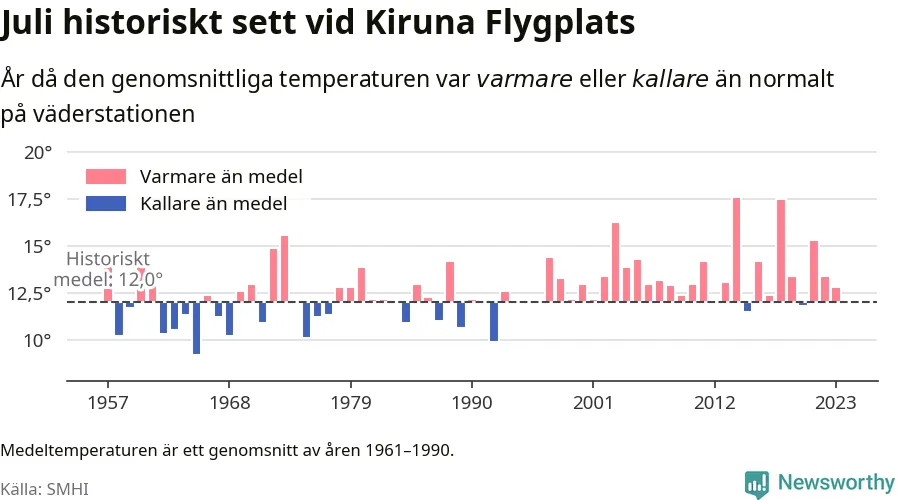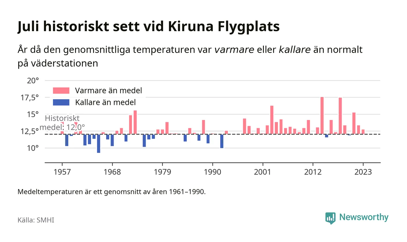 Under 20 av 31 dagar låg medeltemperaturen över det normala i Kiruna. Åtta av de här dagarna var temperaturen betydligt1 högre än vanligt.