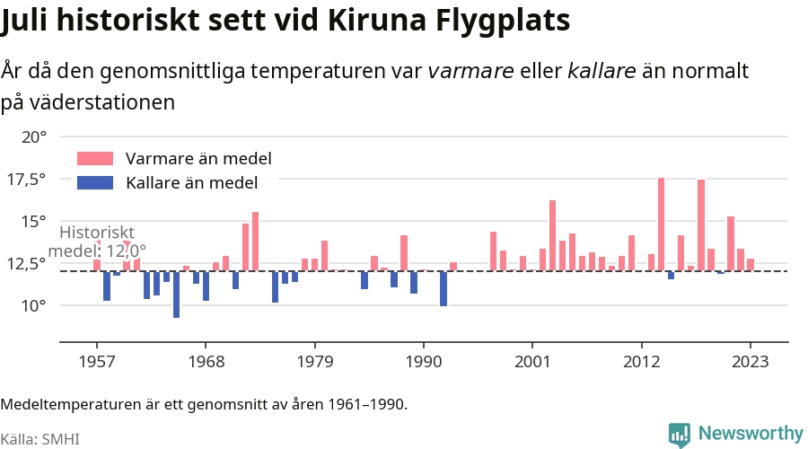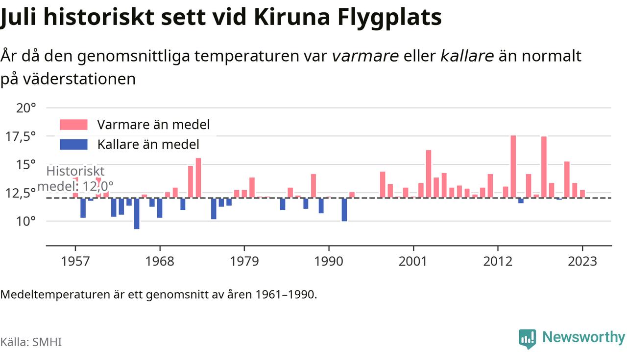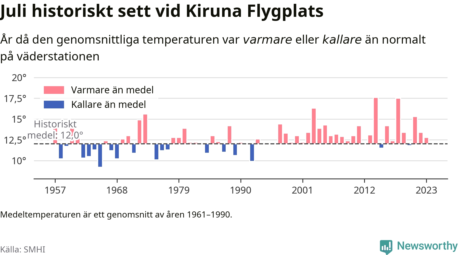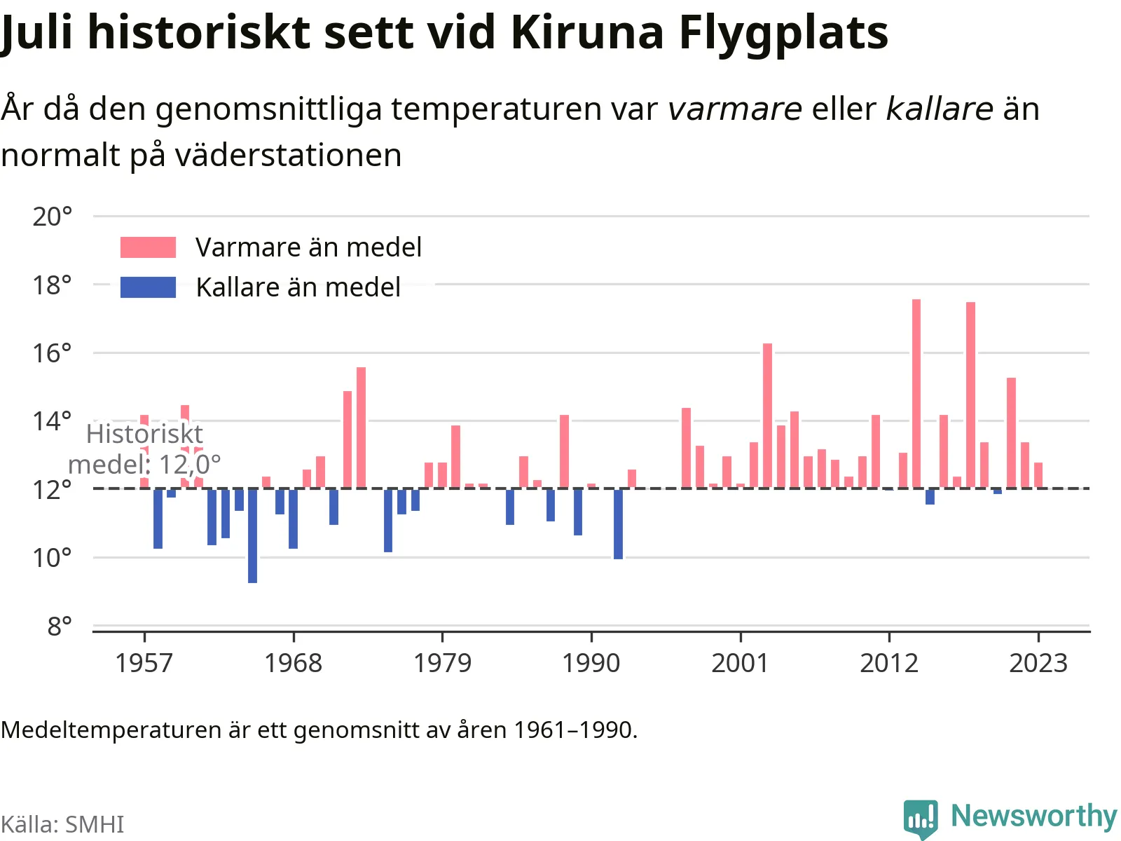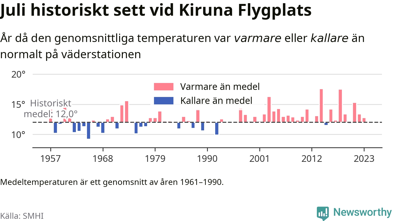 Under 20 av 31 dagar låg medeltemperaturen över det normala i Kiruna. Åtta av de här dagarna var temperaturen betydligt1 högre än vanligt.