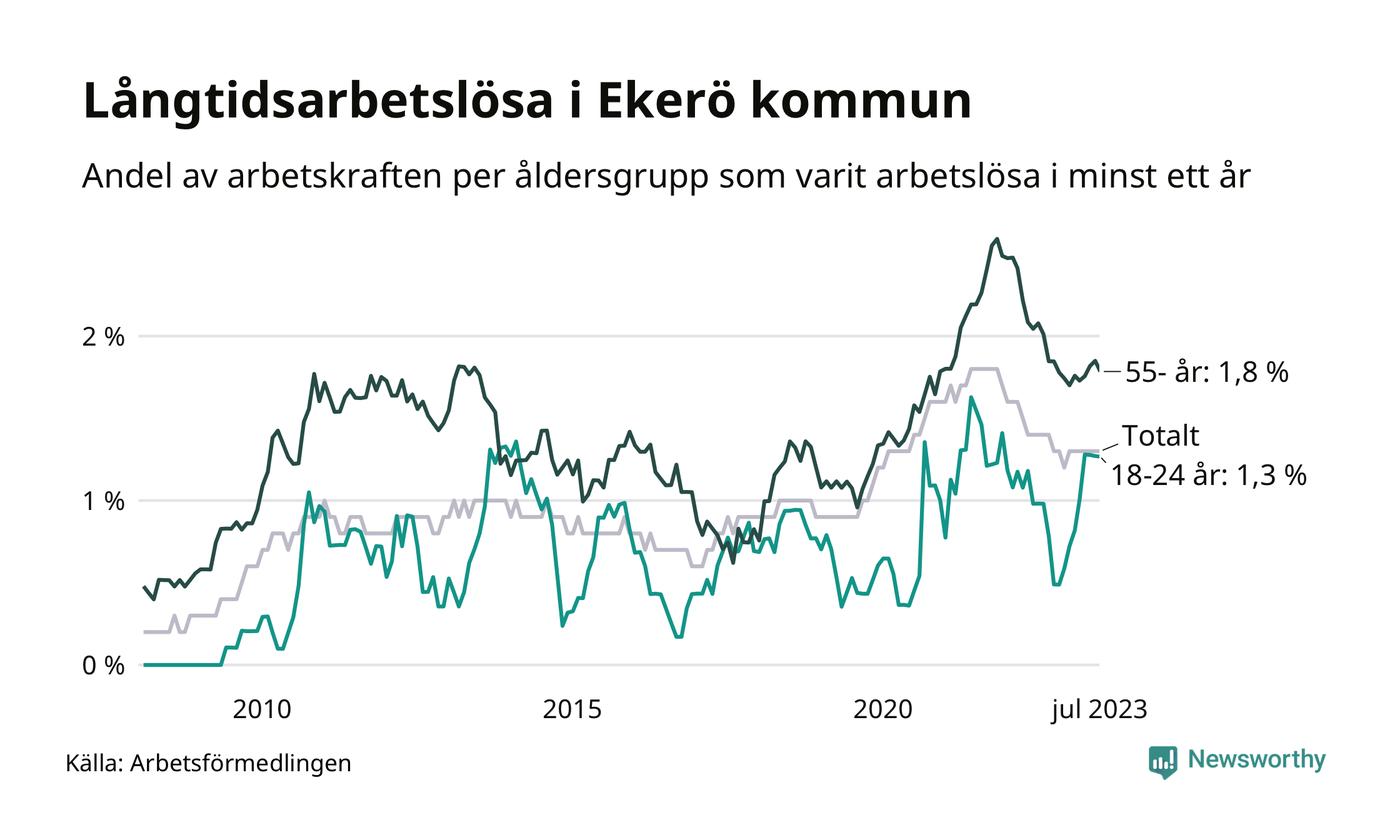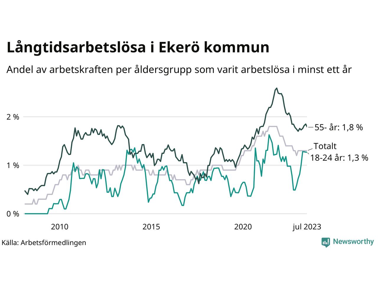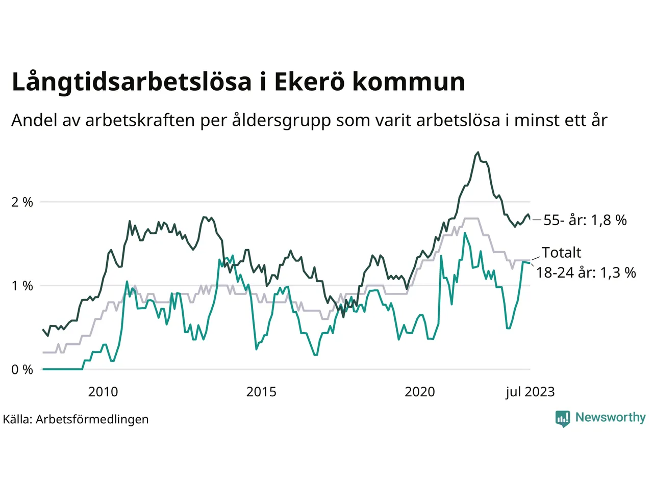 Av de 183 personerna som varit arbetslösa i mer än ett år i Ekerö kommun är 57 personer mellan 55 och 651 år och 14 är mellan 18 och 24 år. För den äldre gruppen är andelen arbetslösa 1,8 procent medan den i den yngre gruppen är 1,3 procent. Även i riket som helhet är långtidsarbetslösheten högre i gruppen äldre.