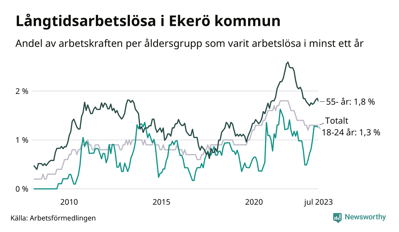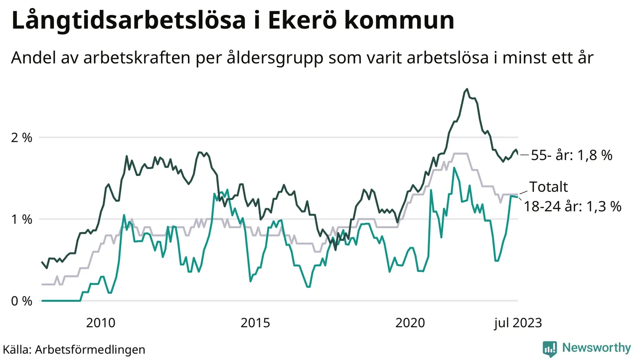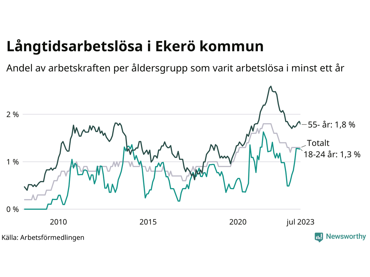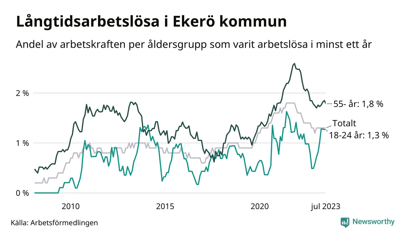 Av de 183 personerna som varit arbetslösa i mer än ett år i Ekerö kommun är 57 personer mellan 55 och 651 år och 14 är mellan 18 och 24 år. För den äldre gruppen är andelen arbetslösa 1,8 procent medan den i den yngre gruppen är 1,3 procent. Även i riket som helhet är långtidsarbetslösheten högre i gruppen äldre.