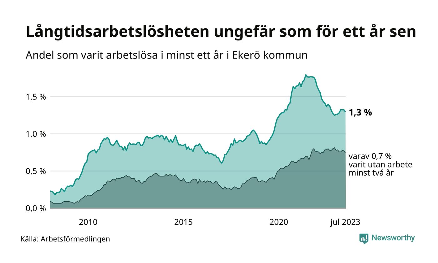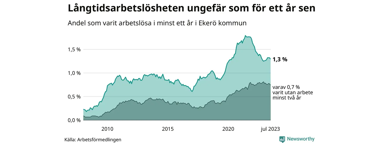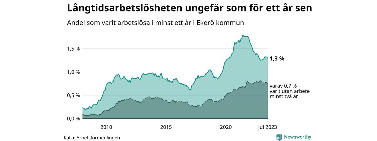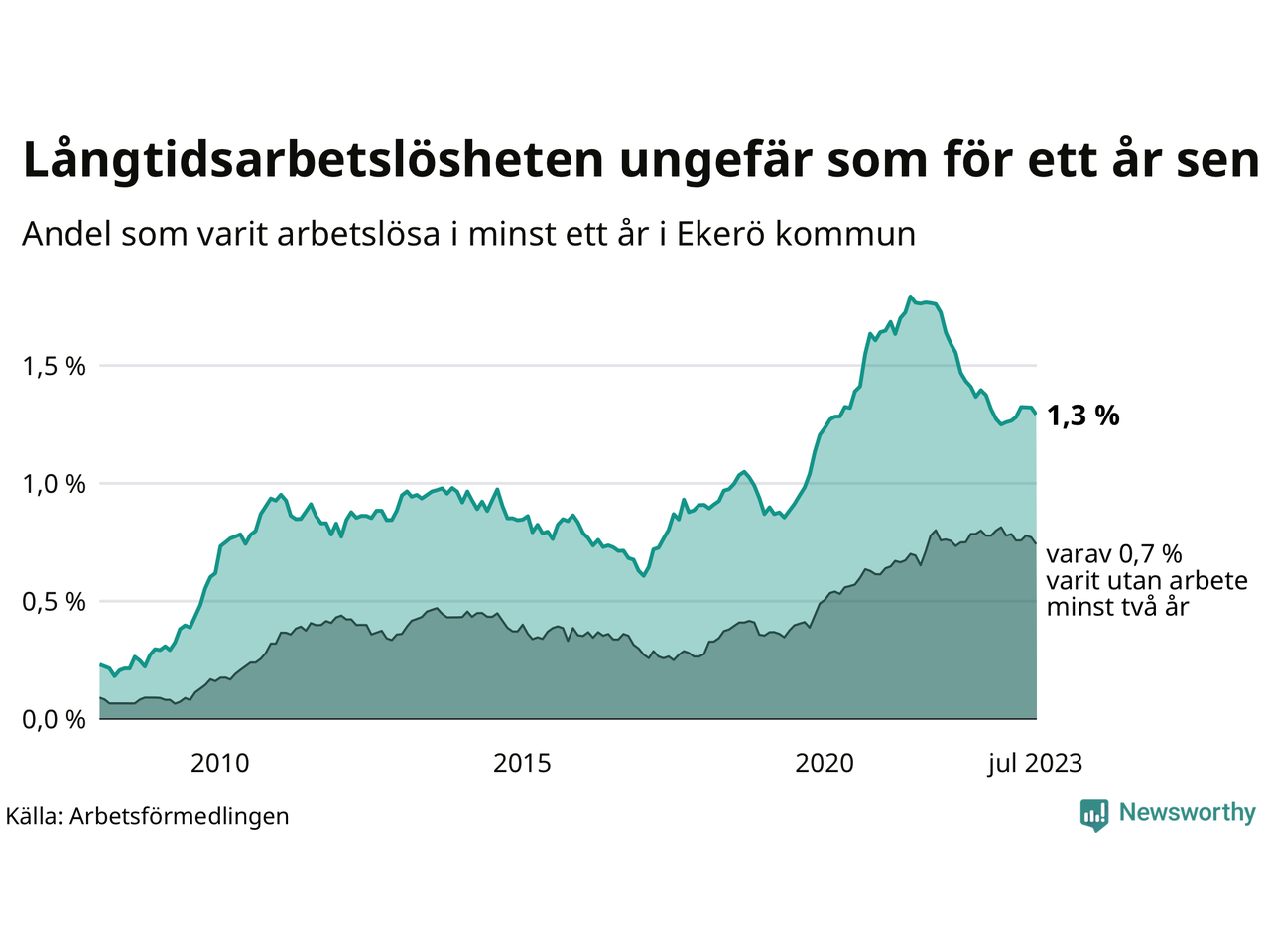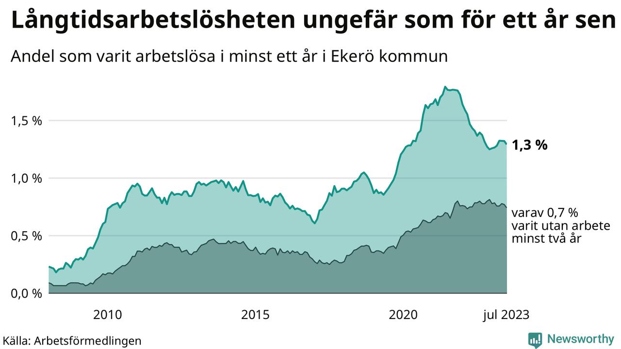 I juli hade 183 Ekeröbor varit arbetslösa i minst ett år, vilket är fyra färre än månaden innan. 183 personer motsvarar 1,3 procent av arbetskraften i kommunen – andelen långtidsarbetslösa är ungefär på samma nivå som för ett år sedan.