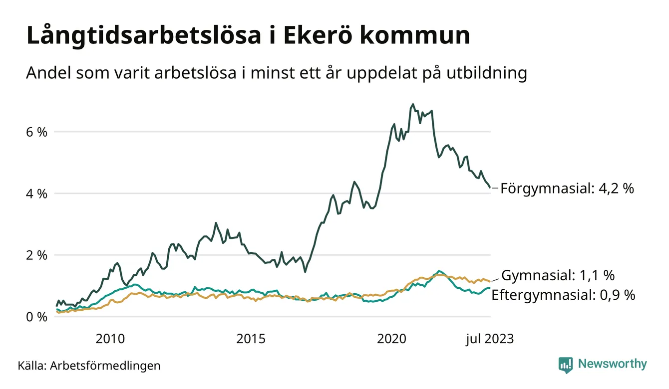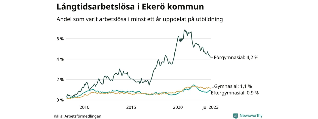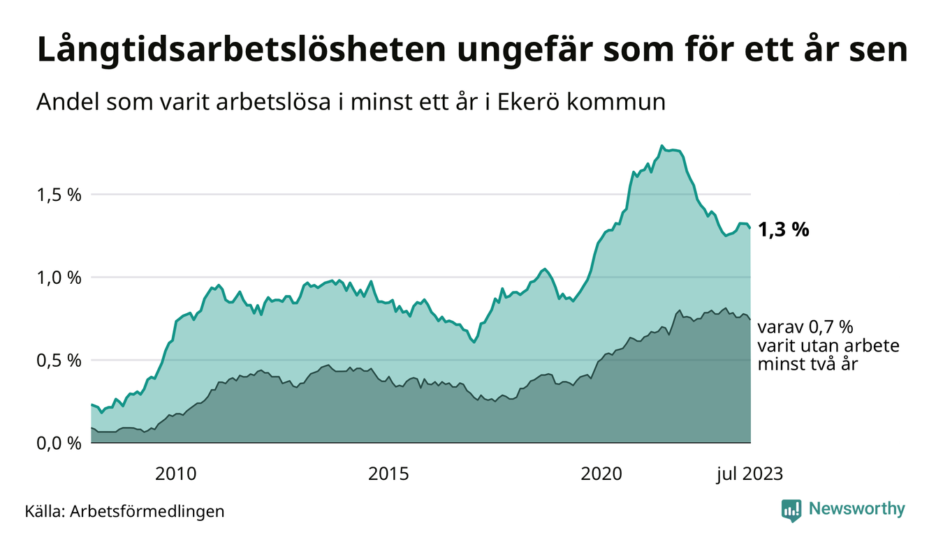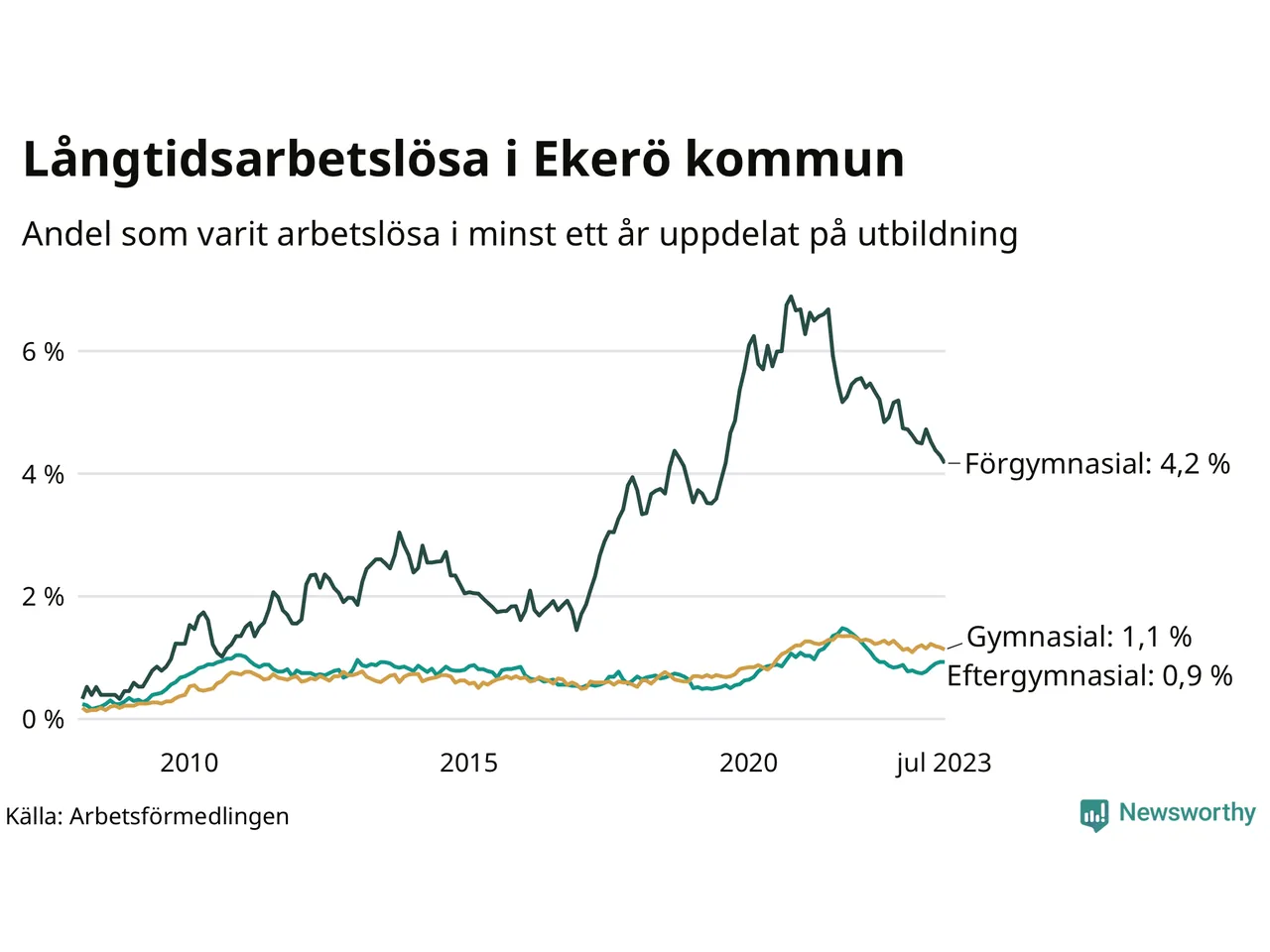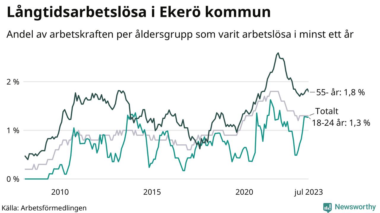 I juli hade 183 Ekeröbor varit arbetslösa i minst ett år, vilket är fyra färre än månaden innan. 183 personer motsvarar 1,3 procent av arbetskraften i kommunen – andelen långtidsarbetslösa är ungefär på samma nivå som för ett år sedan.