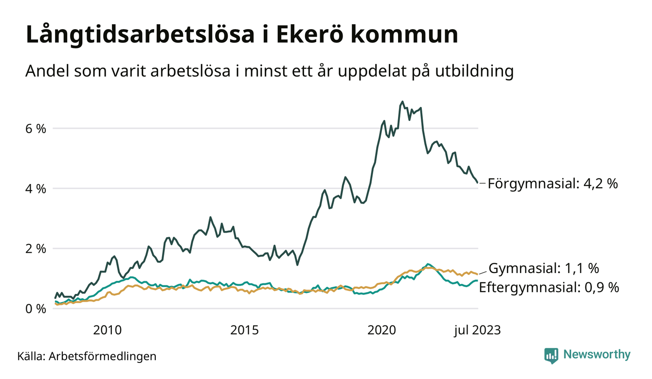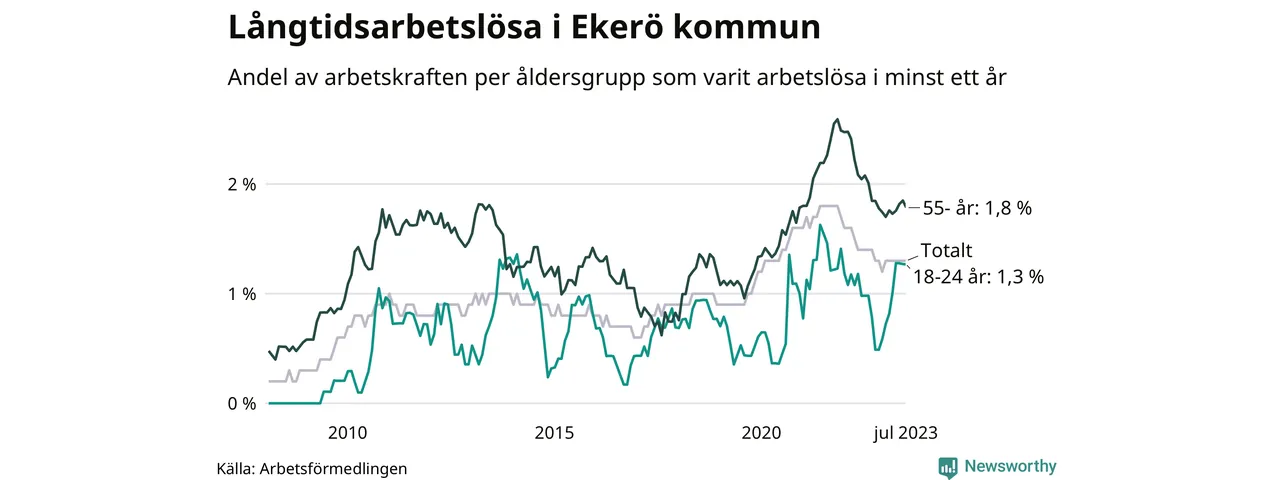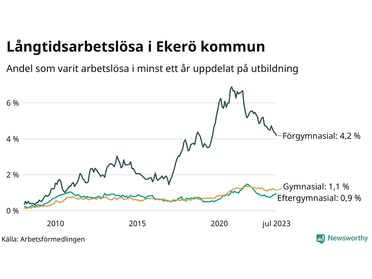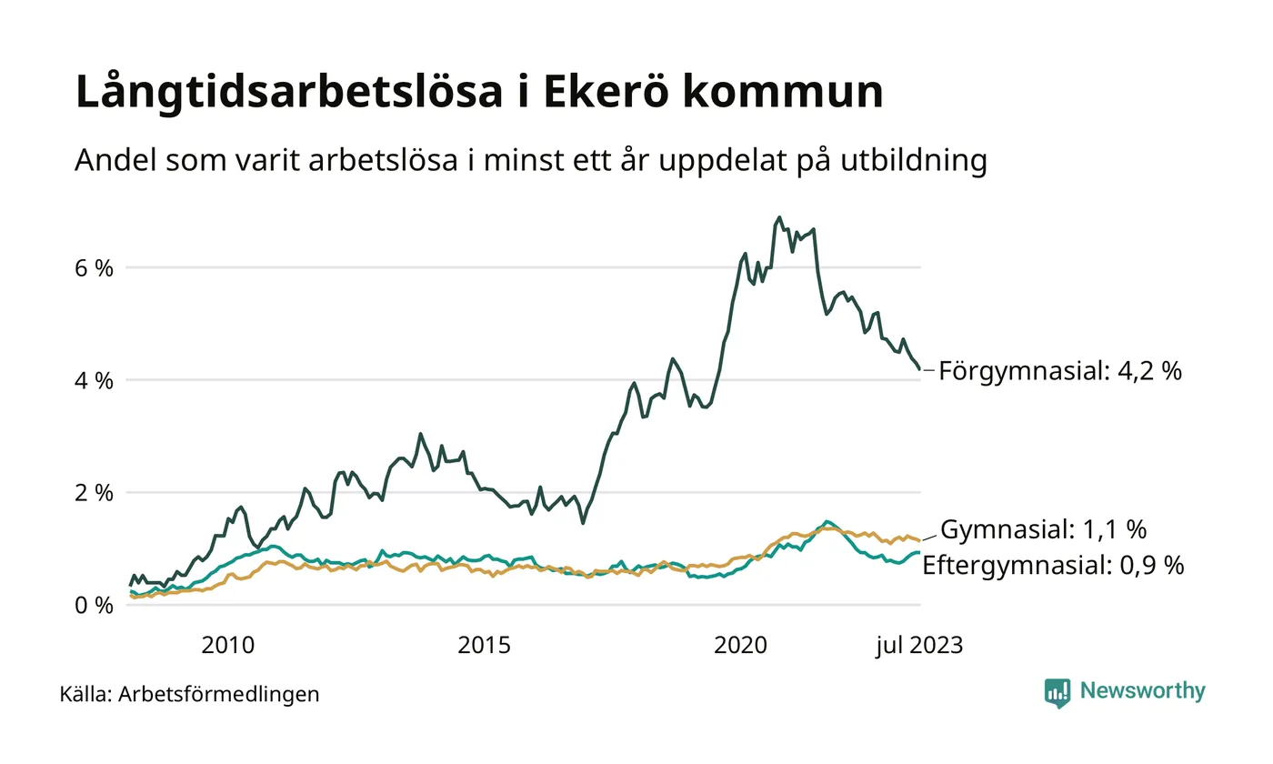 I juli hade 183 Ekeröbor varit arbetslösa i minst ett år, vilket är fyra färre än månaden innan. 183 personer motsvarar 1,3 procent av arbetskraften i kommunen – andelen långtidsarbetslösa är ungefär på samma nivå som för ett år sedan.