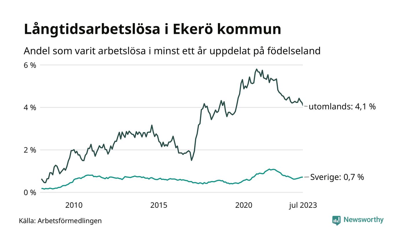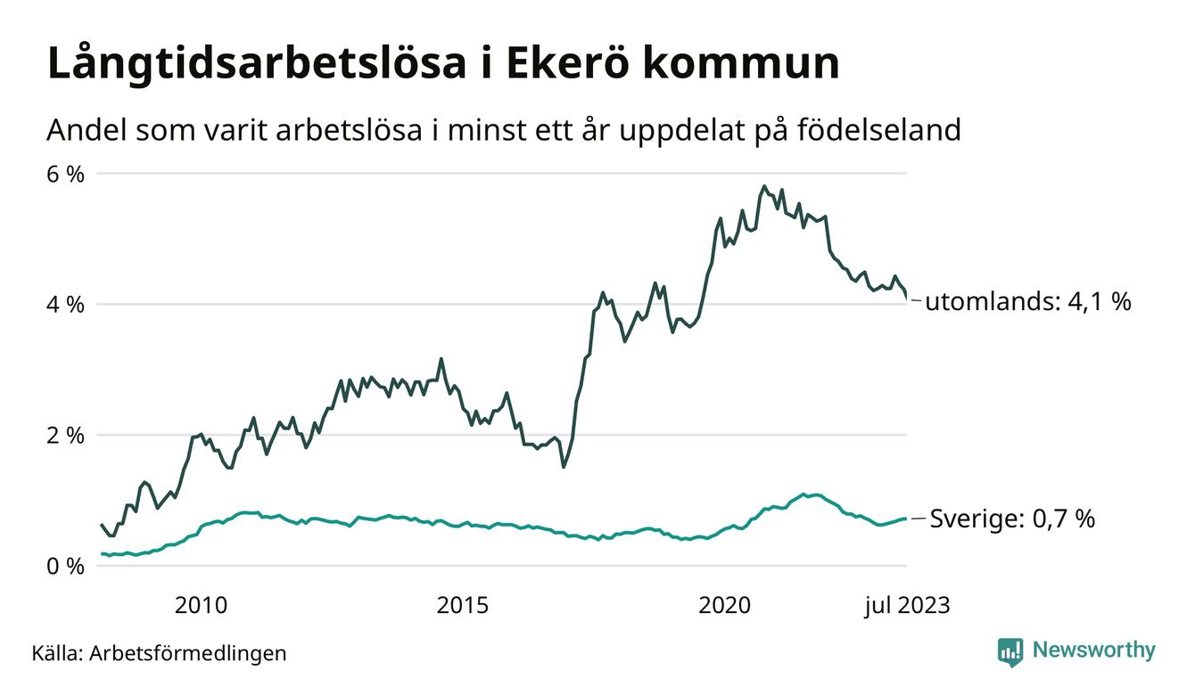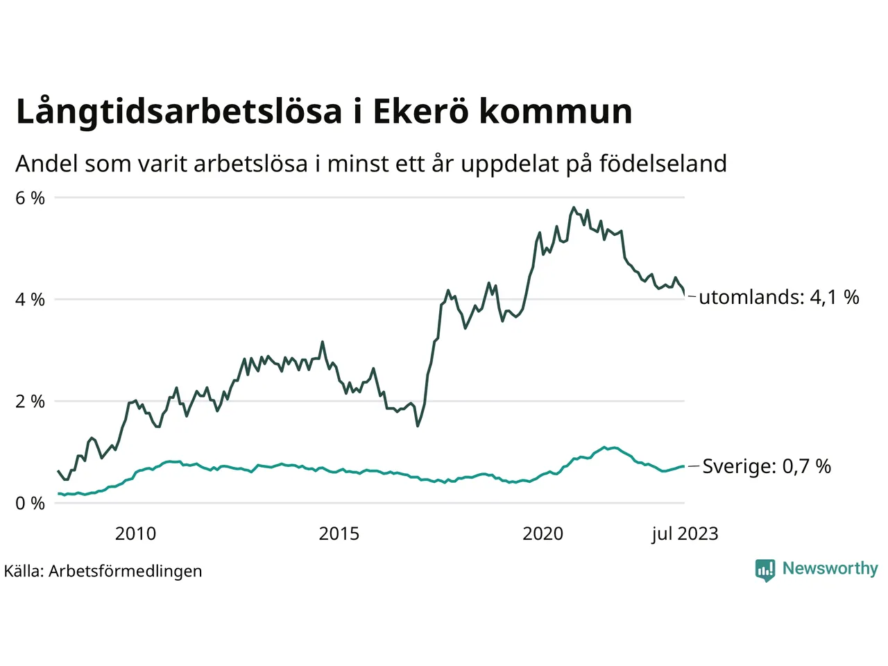 84 av de långtidsarbetslösa i Ekerö är födda i Sverige, medan 99 är födda utomlands. Det innebär att långtidsarbetslösheten bland Sverigefödda är 0,7 procent, medan den är sex gånger så hög – 4,1 procent – bland födda utomlands. Även i riket som helhet är arbetslösheten högre bland utrikesfödda.