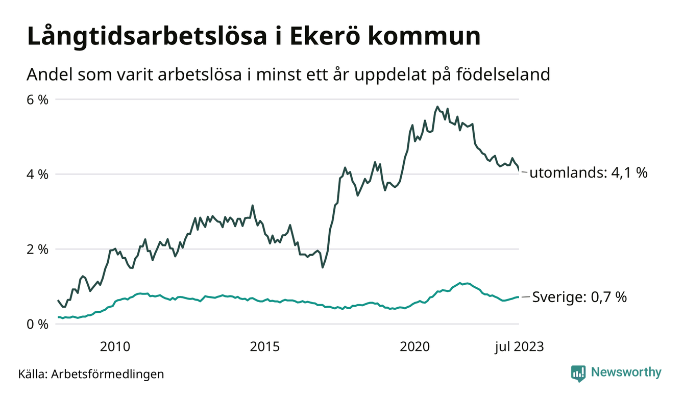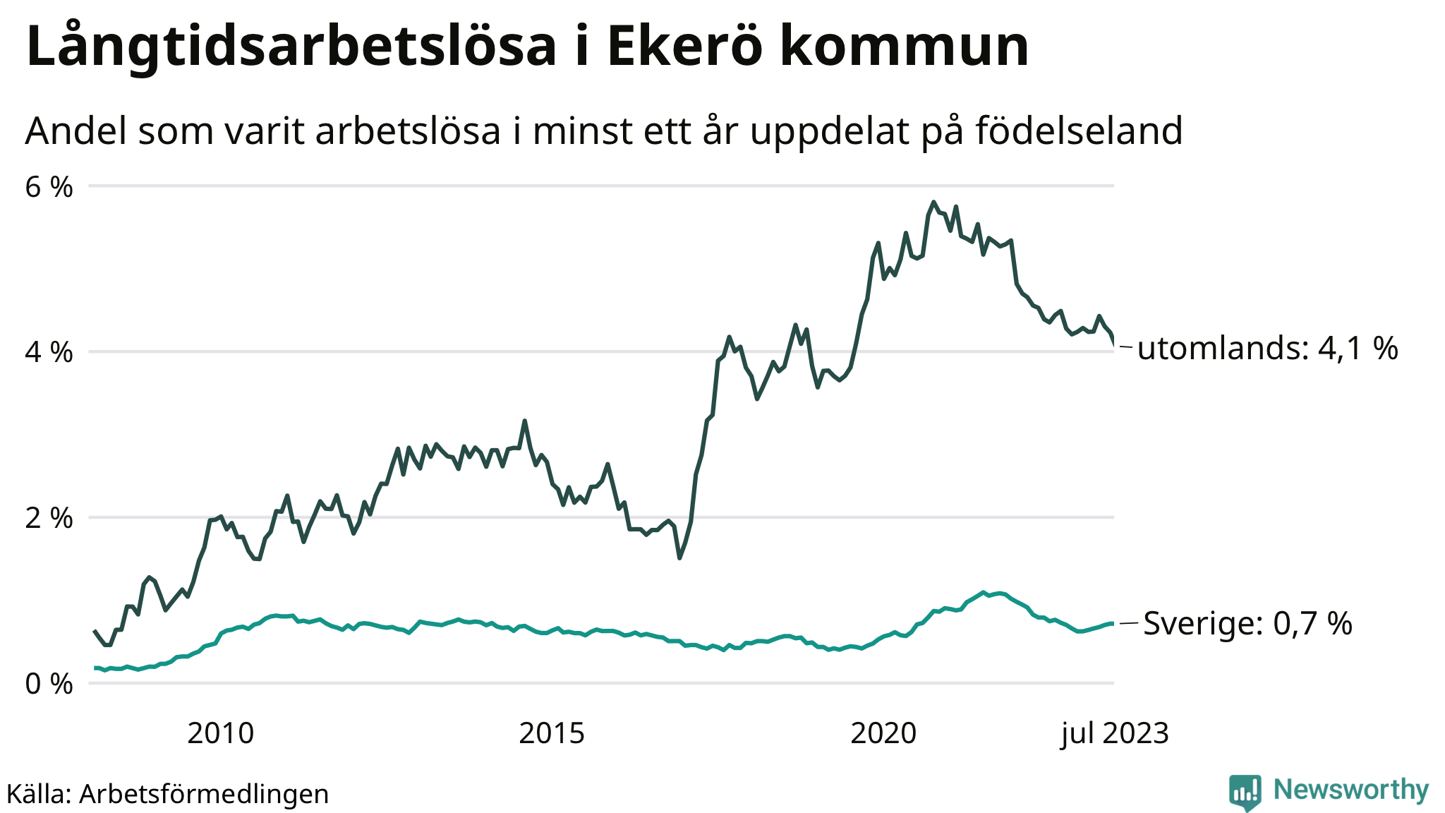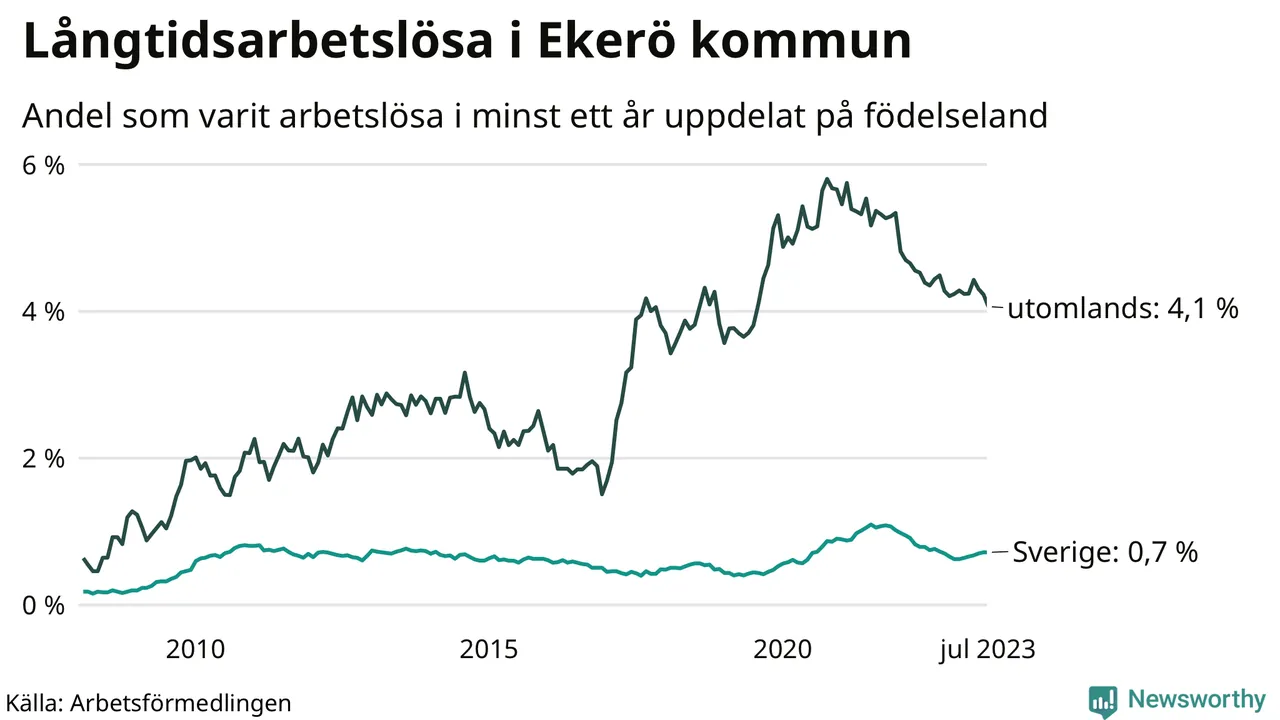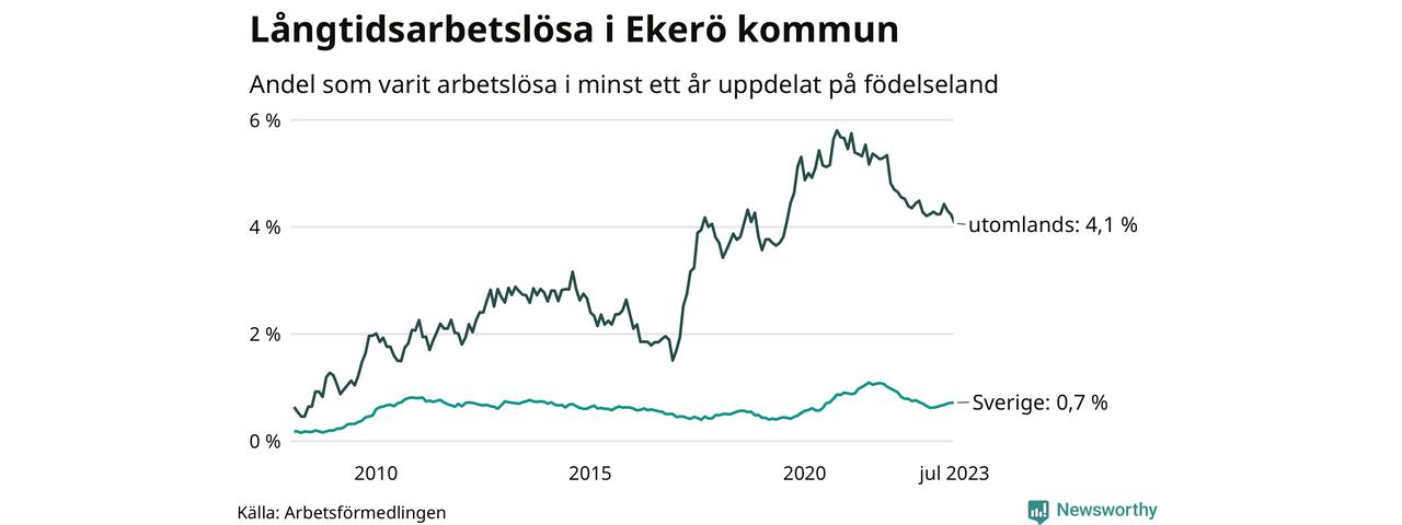 84 av de långtidsarbetslösa i Ekerö är födda i Sverige, medan 99 är födda utomlands. Det innebär att långtidsarbetslösheten bland Sverigefödda är 0,7 procent, medan den är sex gånger så hög – 4,1 procent – bland födda utomlands. Även i riket som helhet är arbetslösheten högre bland utrikesfödda.