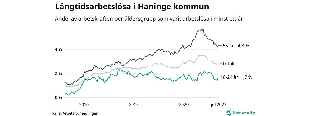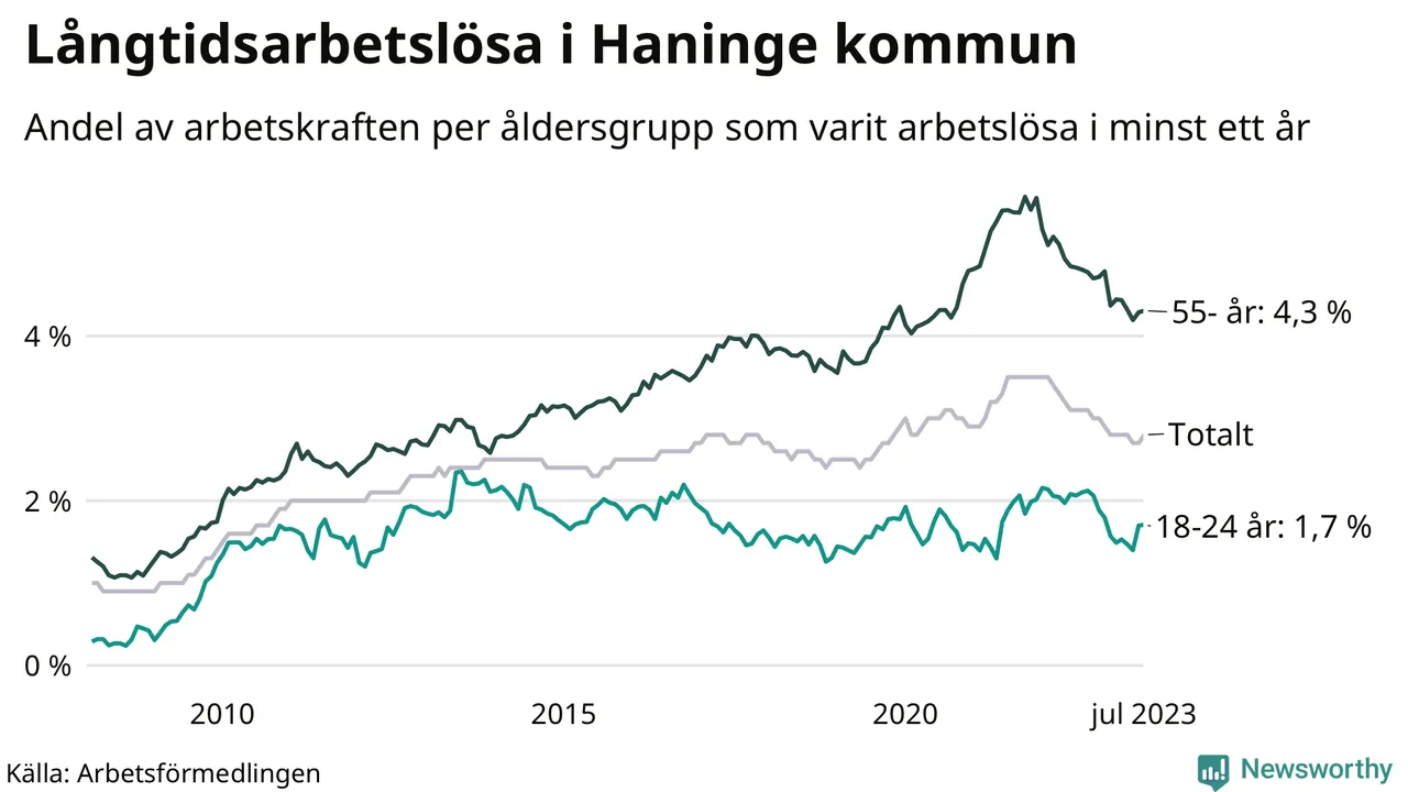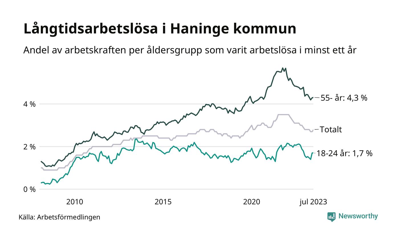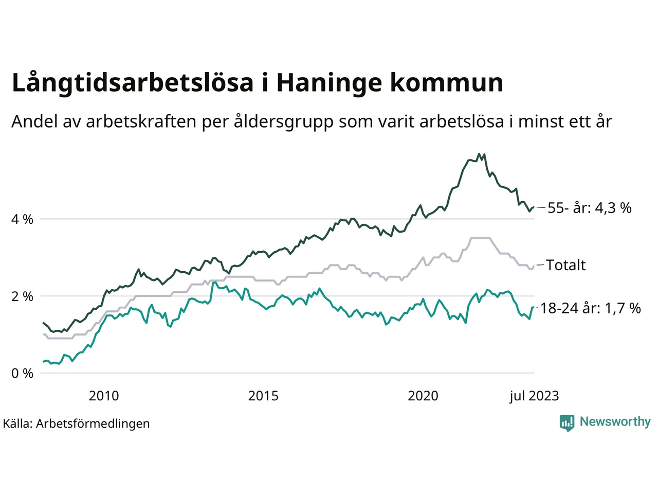 Av de 1 402 personerna som varit arbetslösa i mer än ett år i Haninge kommun är 366 personer mellan 55 och 651 år och 88 är mellan 18 och 24 år. För den äldre gruppen är andelen arbetslösa 4,3 procent medan den i den yngre gruppen är 1,7 procent. Även i riket som helhet är långtidsarbetslösheten högre i gruppen äldre.