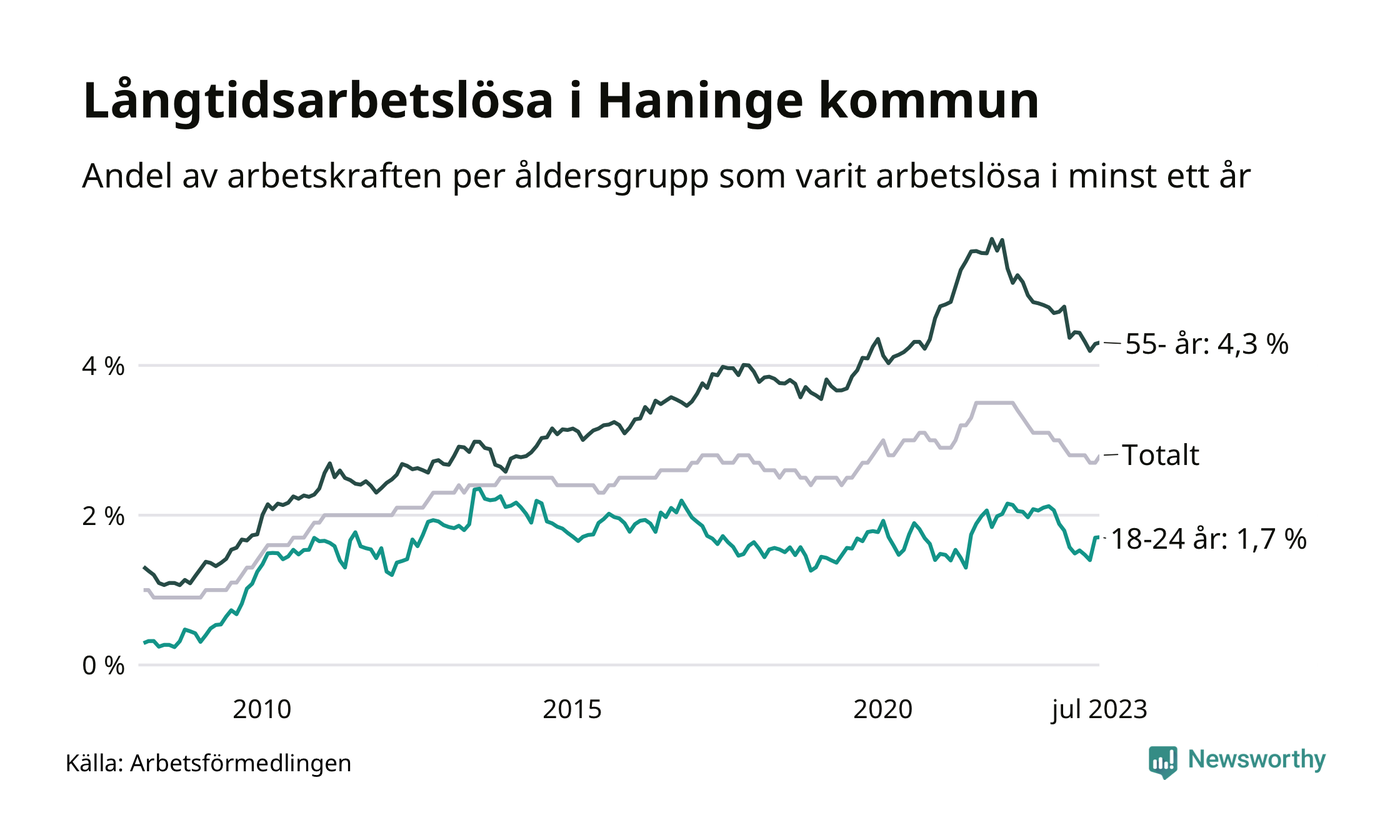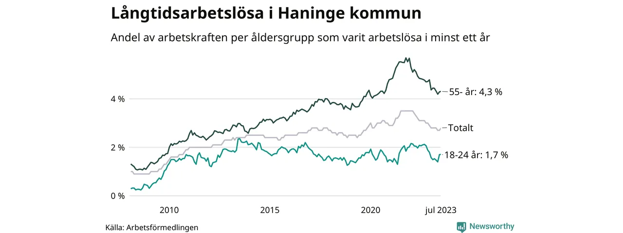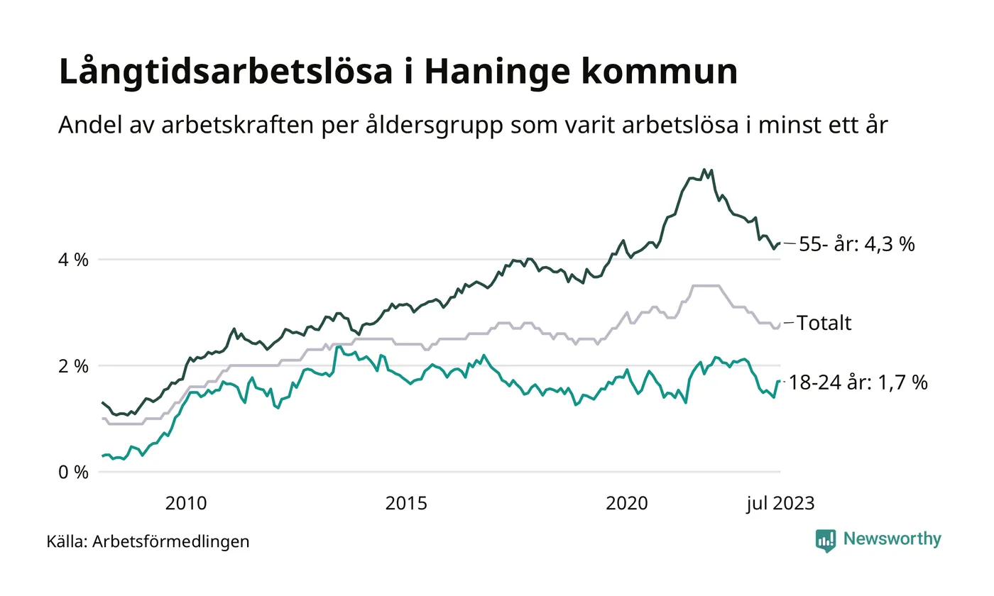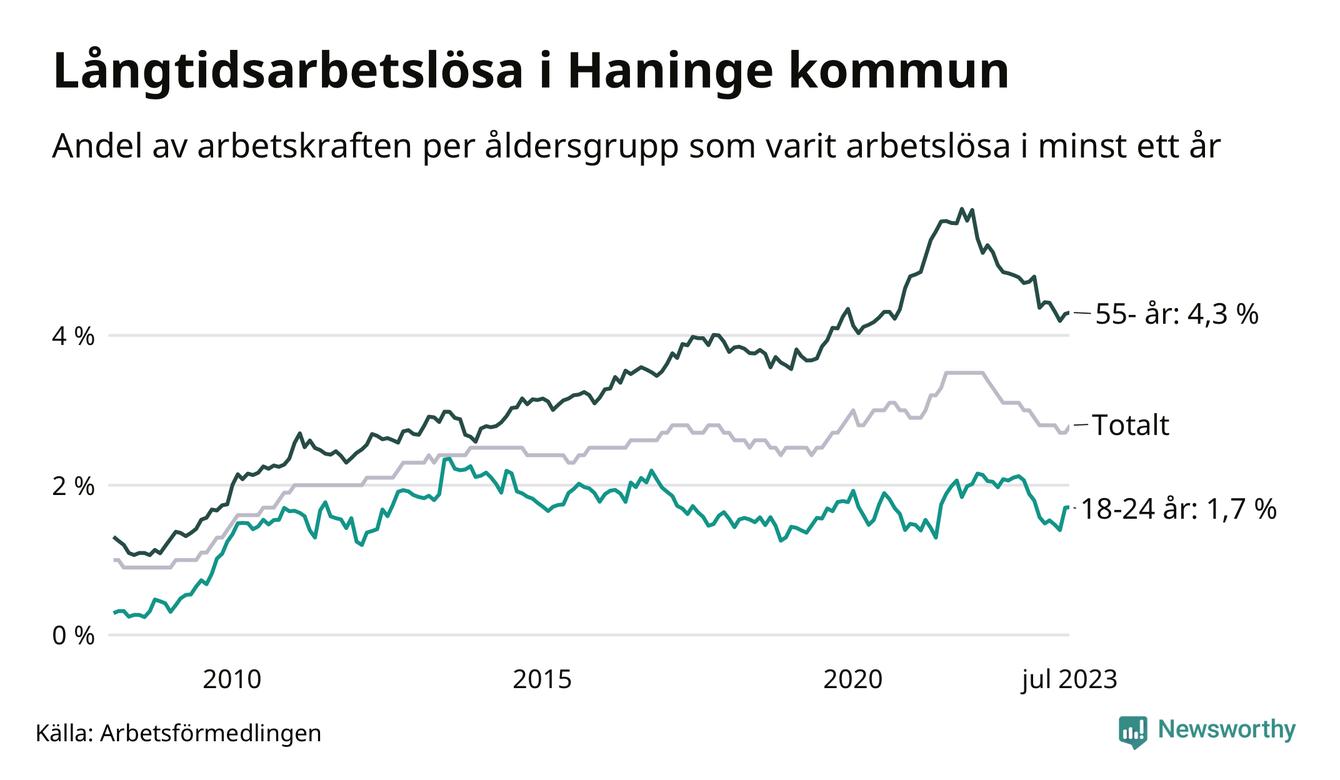 Av de 1 402 personerna som varit arbetslösa i mer än ett år i Haninge kommun är 366 personer mellan 55 och 651 år och 88 är mellan 18 och 24 år. För den äldre gruppen är andelen arbetslösa 4,3 procent medan den i den yngre gruppen är 1,7 procent. Även i riket som helhet är långtidsarbetslösheten högre i gruppen äldre.