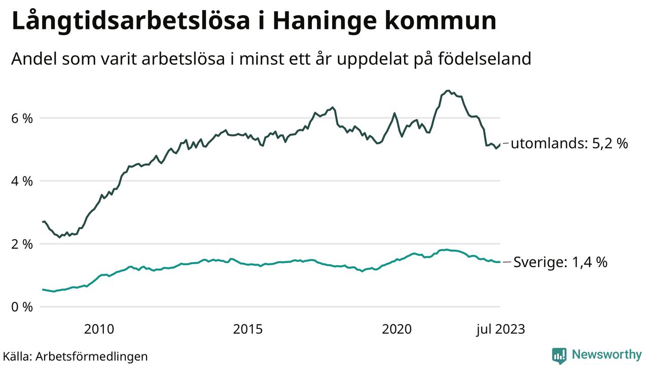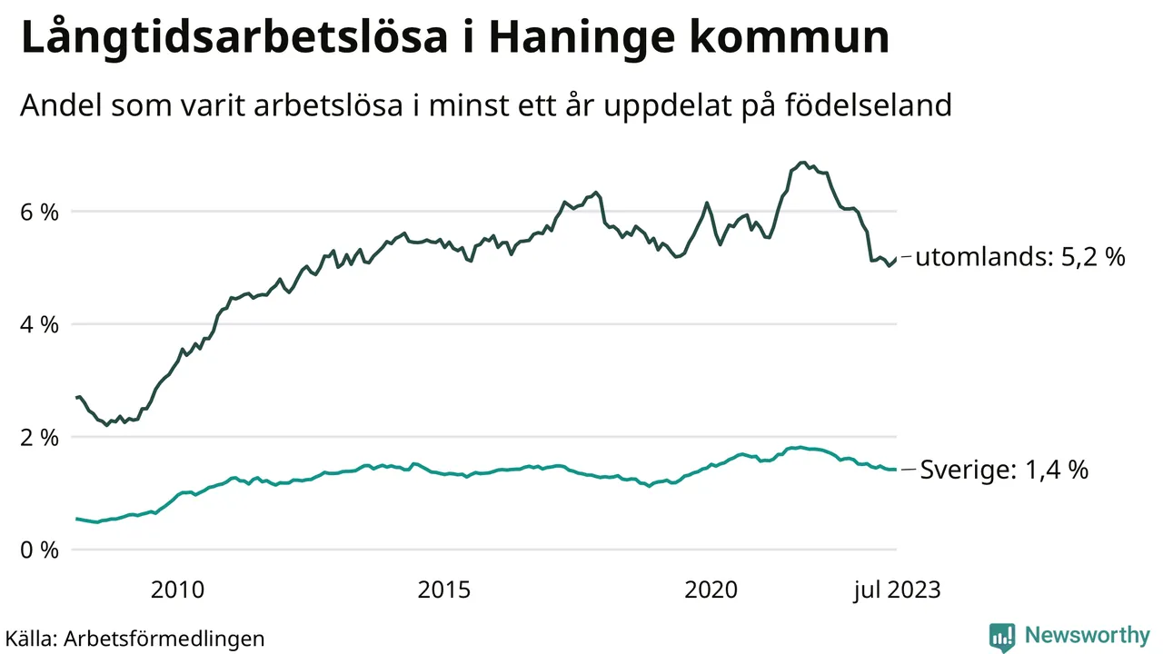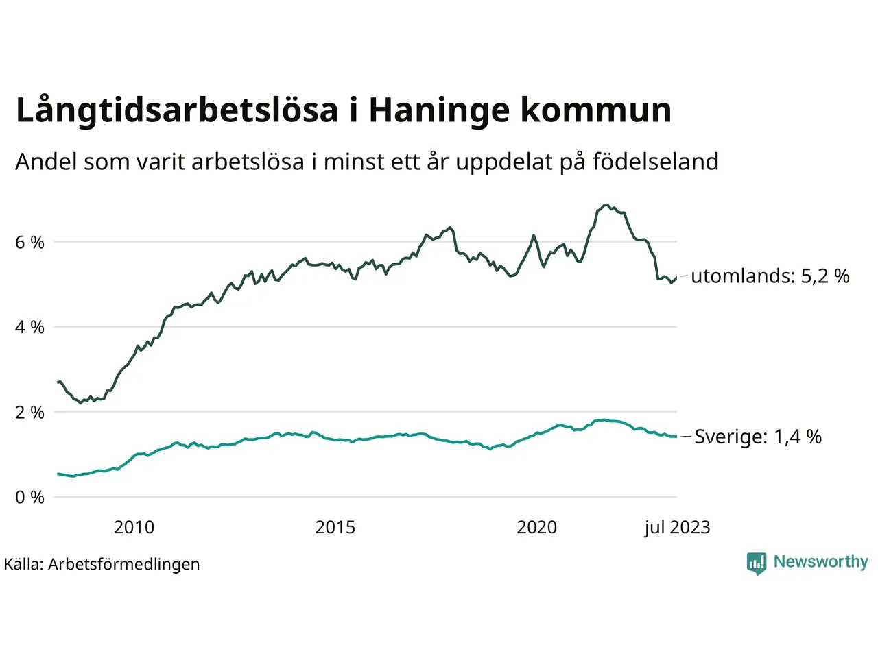 465 av de långtidsarbetslösa i Haninge är födda i Sverige, medan 937 är födda utomlands. Det innebär att långtidsarbetslösheten bland Sverigefödda är 1,4 procent, medan den är fyra gånger så hög – 5,2 procent – bland födda utomlands. Även i riket som helhet är arbetslösheten högre bland utrikesfödda.