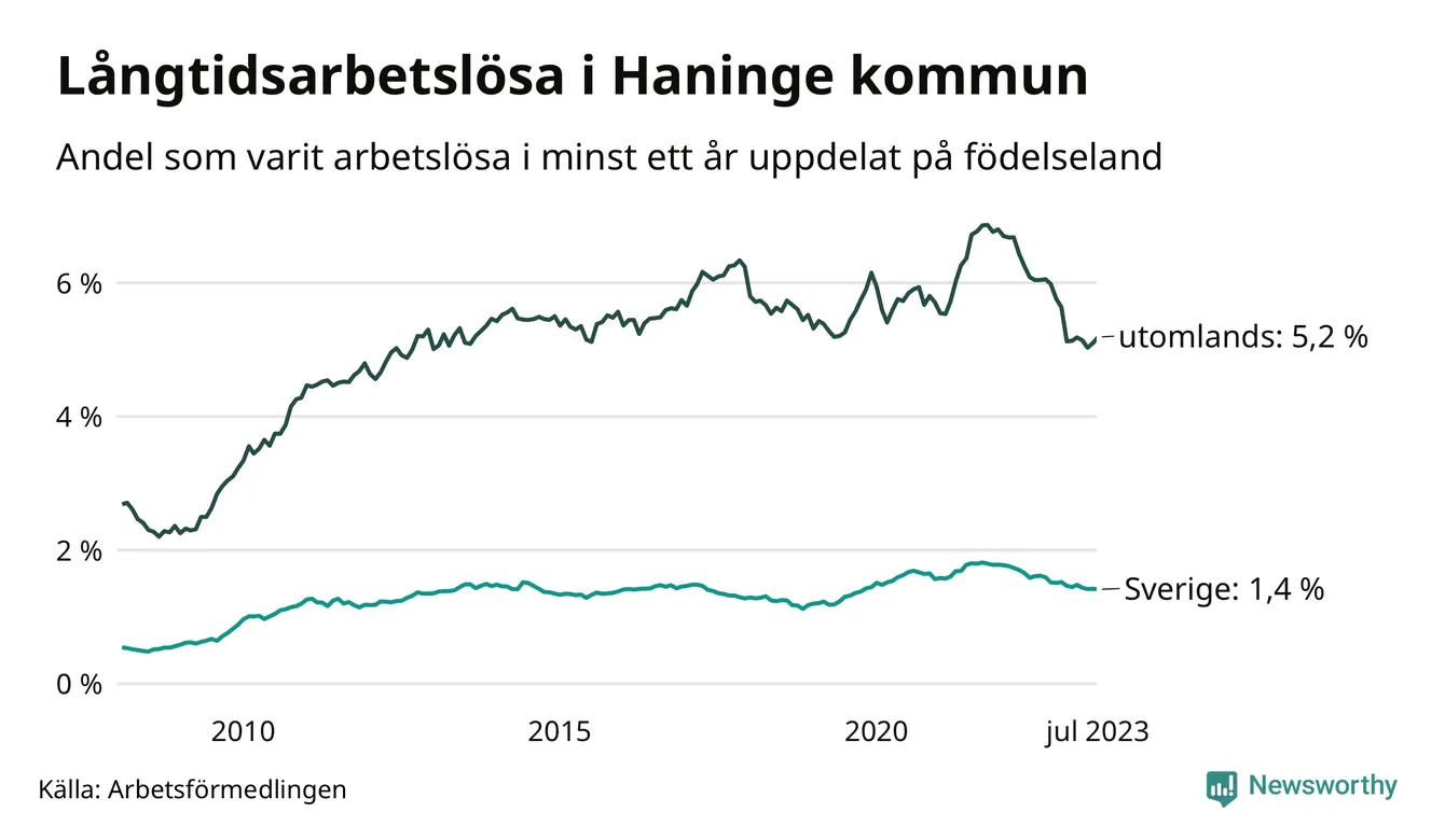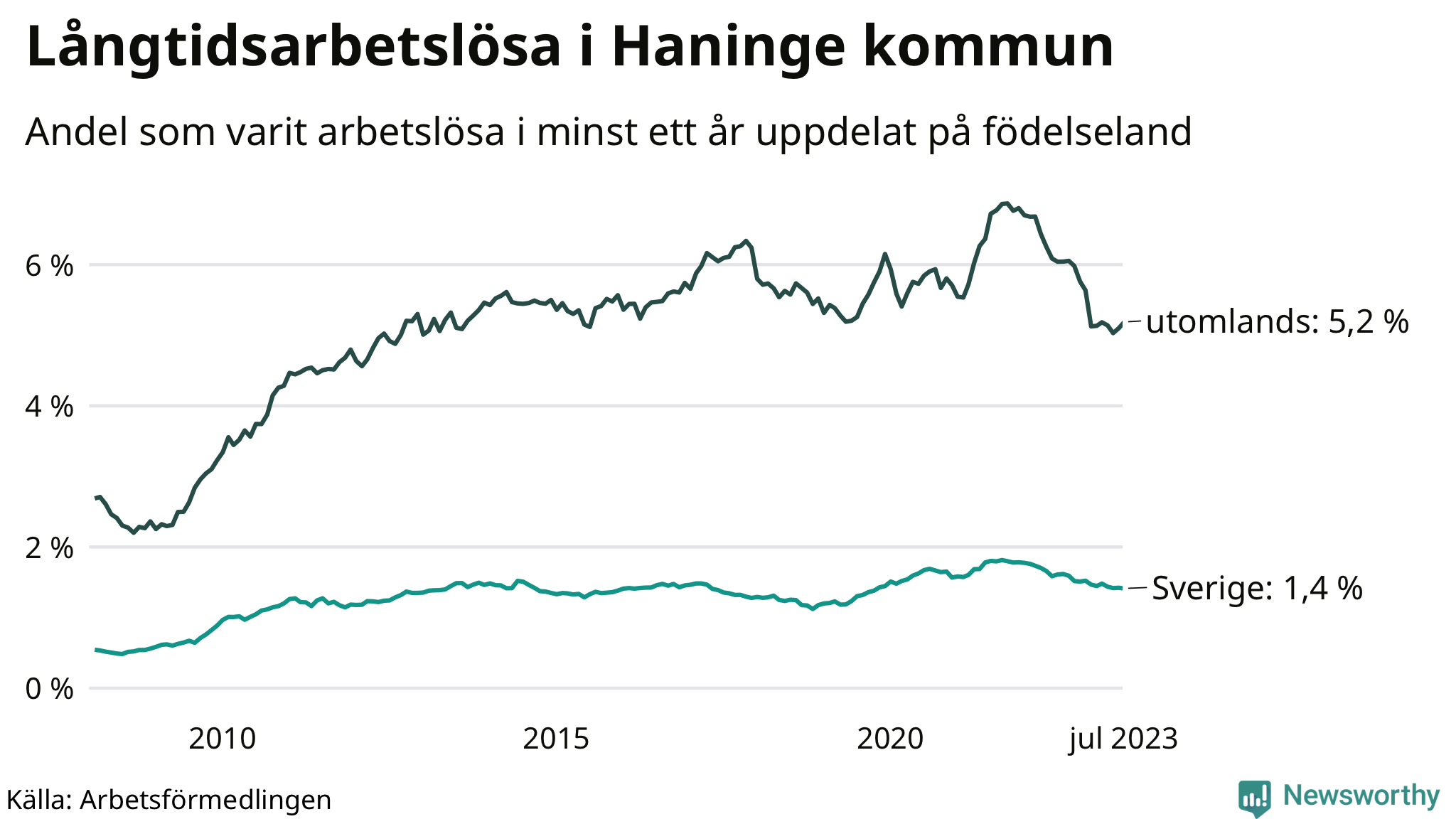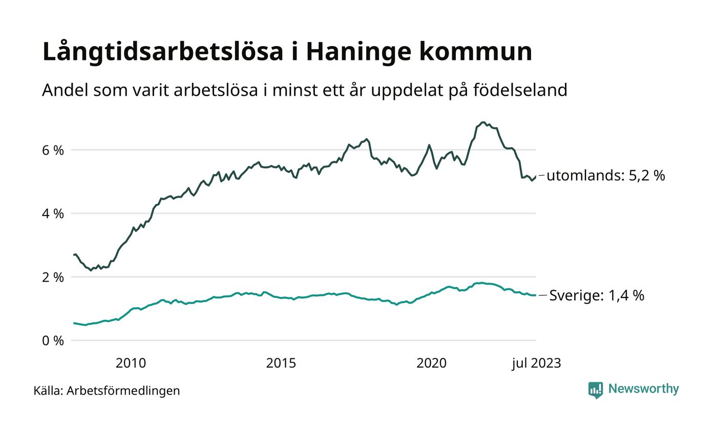 465 av de långtidsarbetslösa i Haninge är födda i Sverige, medan 937 är födda utomlands. Det innebär att långtidsarbetslösheten bland Sverigefödda är 1,4 procent, medan den är fyra gånger så hög – 5,2 procent – bland födda utomlands. Även i riket som helhet är arbetslösheten högre bland utrikesfödda.