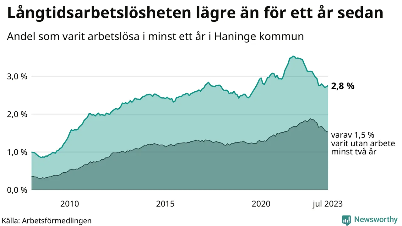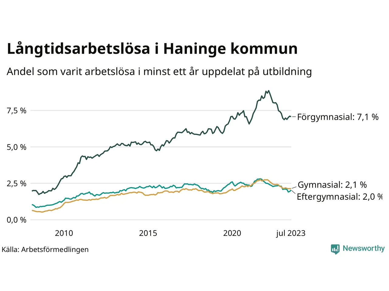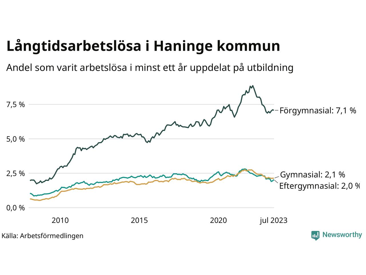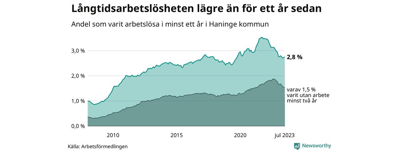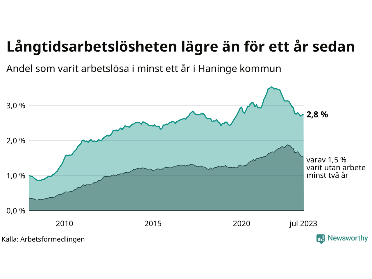 I juli hade 1 402 Haningebor varit arbetslösa i minst ett år, vilket är 16 fler än månaden innan. 1 402 personer motsvarar 2,8 procent av arbetskraften i kommunen – andelen långtidsarbetslösa är 0,3 procentenheter lägre än samma månad för ett år sedan.