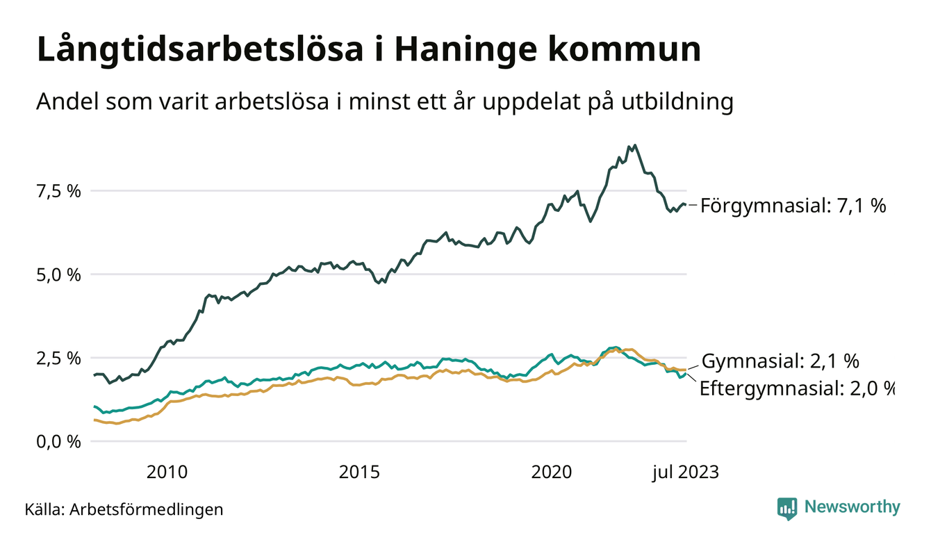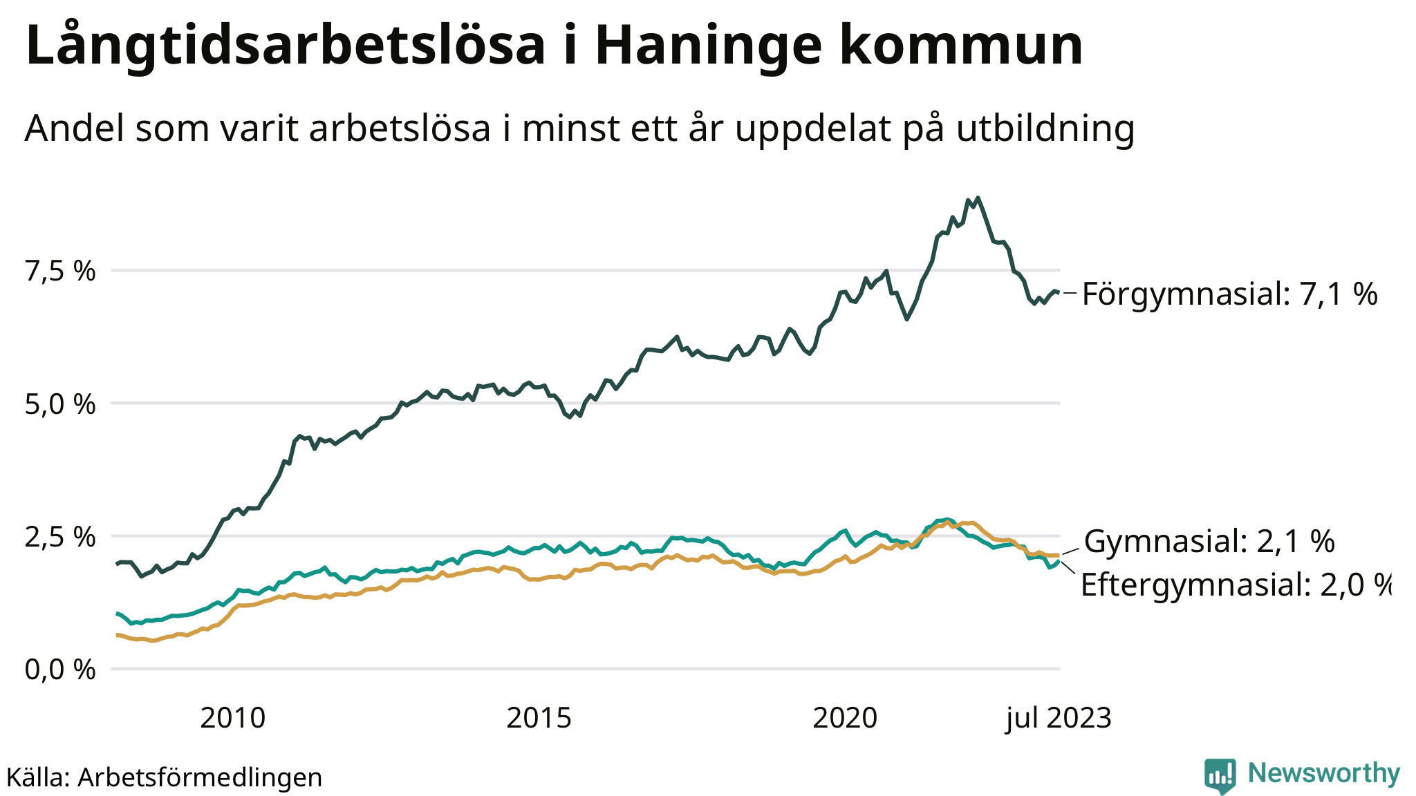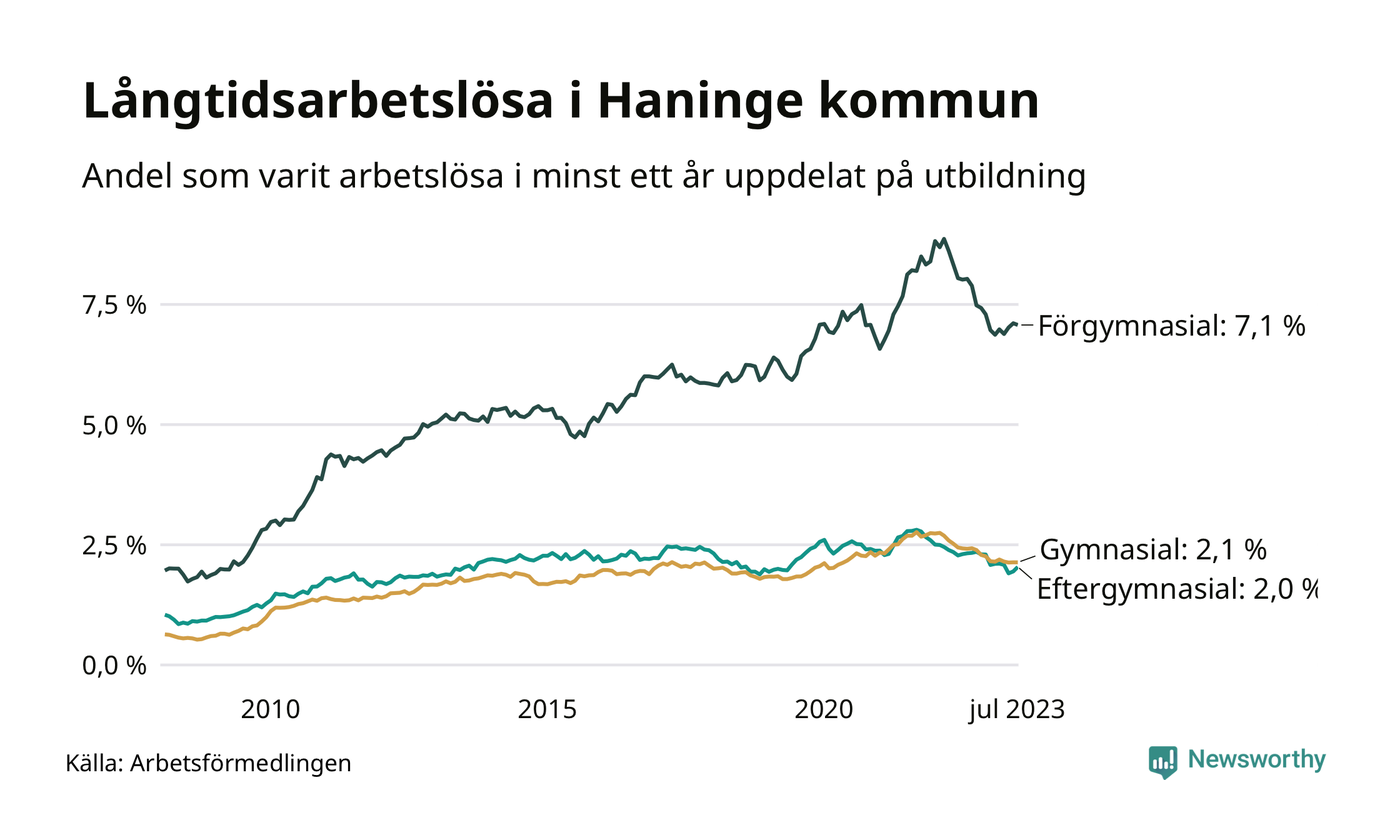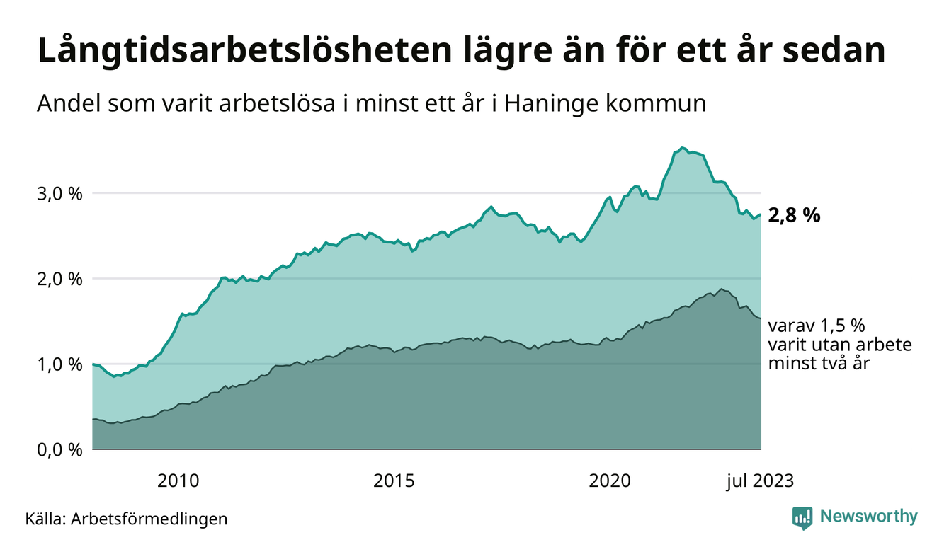 I juli hade 1 402 Haningebor varit arbetslösa i minst ett år, vilket är 16 fler än månaden innan. 1 402 personer motsvarar 2,8 procent av arbetskraften i kommunen – andelen långtidsarbetslösa är 0,3 procentenheter lägre än samma månad för ett år sedan.