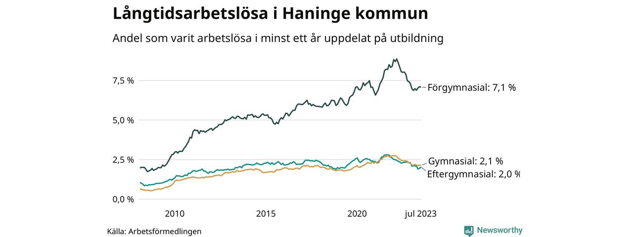 Andelen som varit utan arbete i minst ett år i Haninge i juli var lägre än för ett år sedan. Men jämfört med i juni har antalet långtidsarbetslösa ökat.