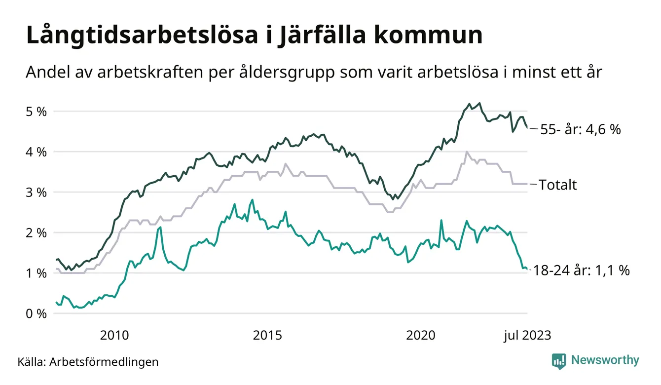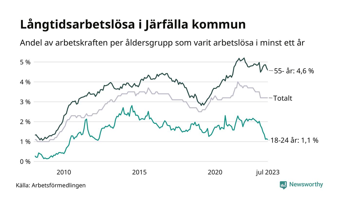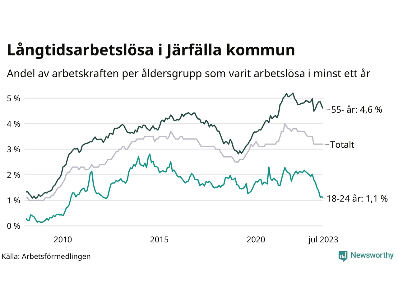 Av de 1 386 personerna som varit arbetslösa i mer än ett år i Järfälla kommun är 349 personer mellan 55 och 651 år och 44 är mellan 18 och 24 år. För den äldre gruppen är andelen arbetslösa 4,6 procent medan den i den yngre gruppen är 1,1 procent. Även i riket som helhet är långtidsarbetslösheten högre i gruppen äldre.