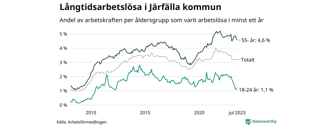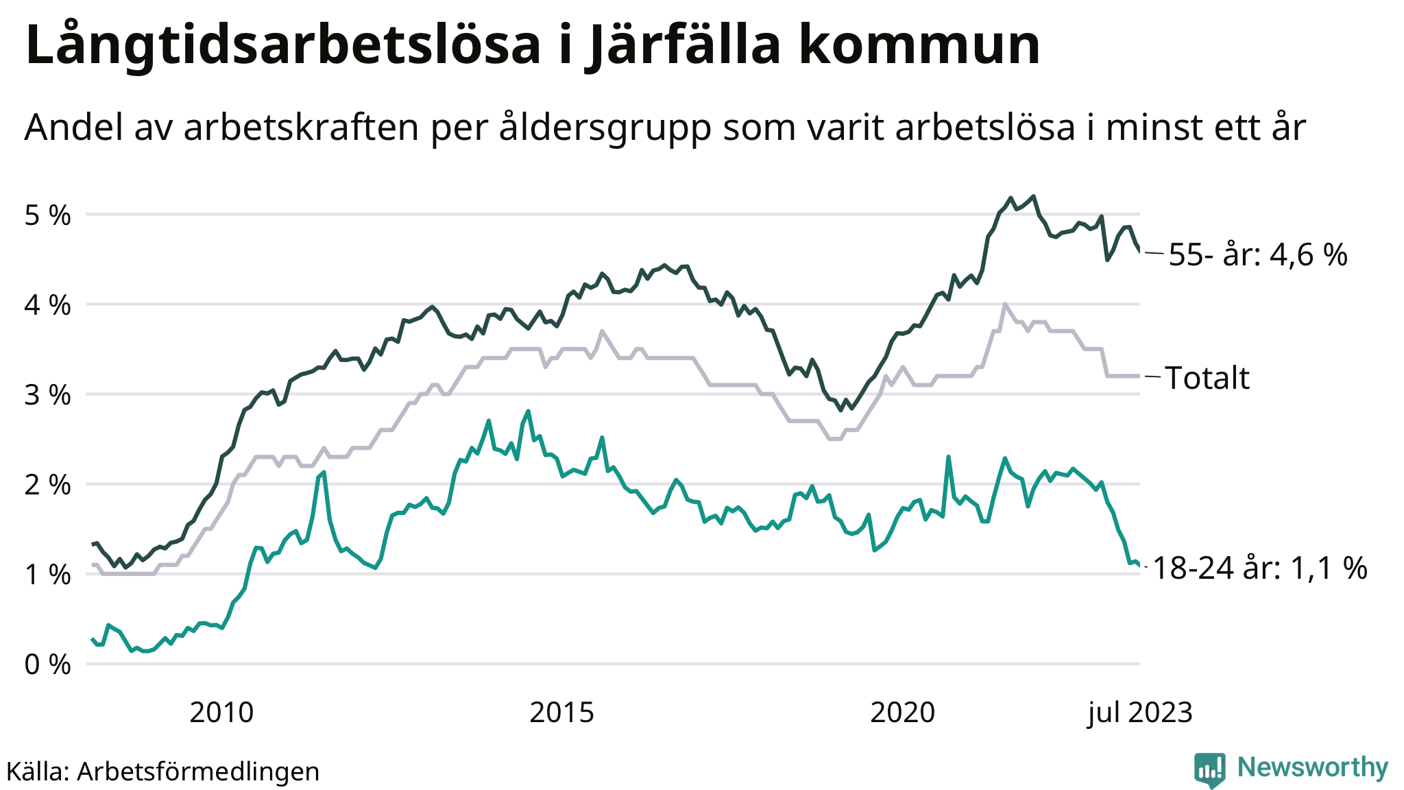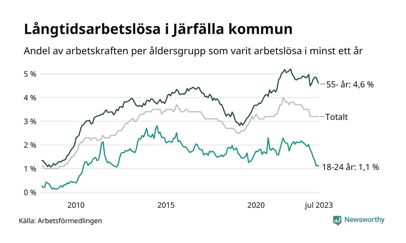 Av de 1 386 personerna som varit arbetslösa i mer än ett år i Järfälla kommun är 349 personer mellan 55 och 651 år och 44 är mellan 18 och 24 år. För den äldre gruppen är andelen arbetslösa 4,6 procent medan den i den yngre gruppen är 1,1 procent. Även i riket som helhet är långtidsarbetslösheten högre i gruppen äldre.