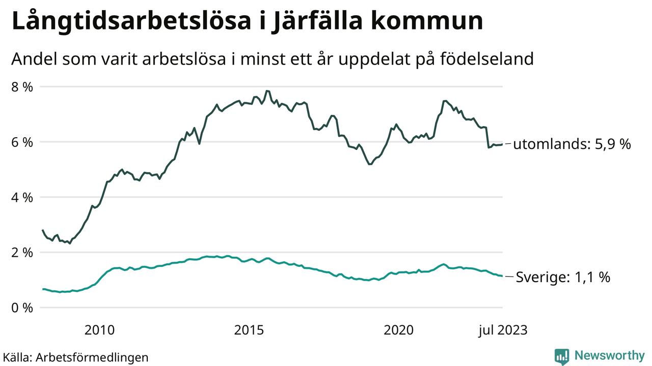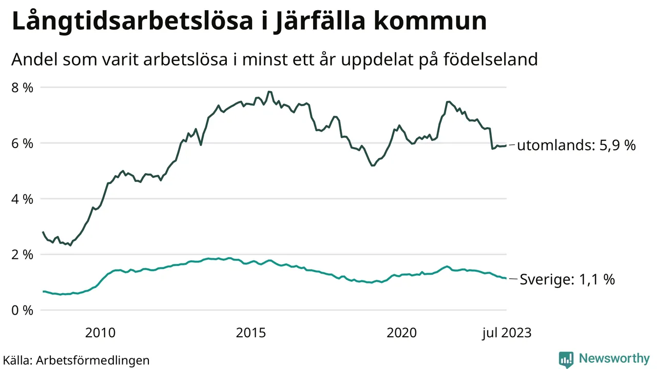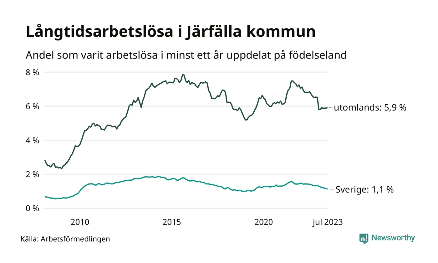 280 av de långtidsarbetslösa i Järfälla är födda i Sverige, medan 1 106 är födda utomlands. Det innebär att långtidsarbetslösheten bland Sverigefödda är 1,1 procent, medan den är fem gånger så hög – 5,9 procent – bland födda utomlands. Även i riket som helhet är arbetslösheten högre bland utrikesfödda.