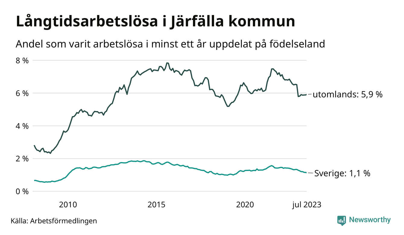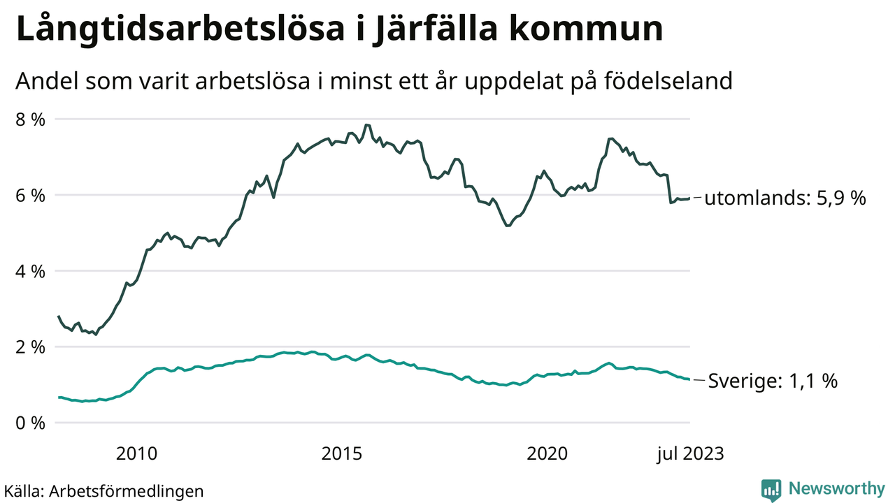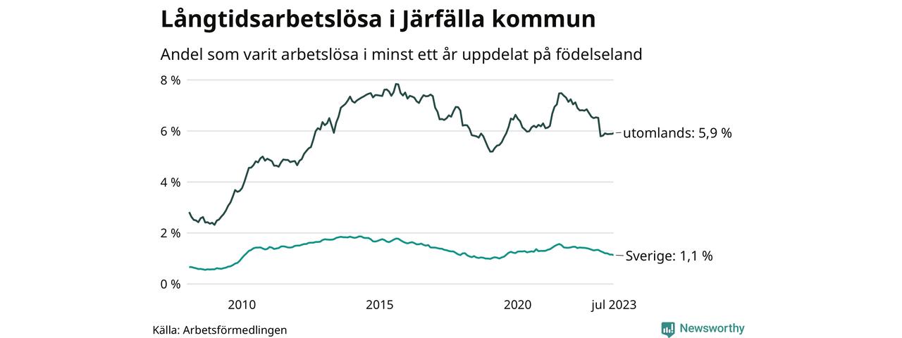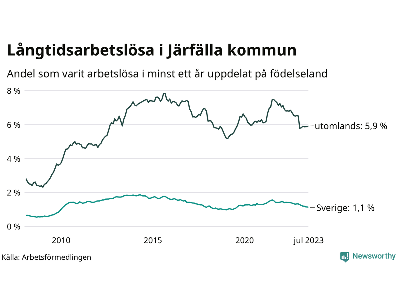280 av de långtidsarbetslösa i Järfälla är födda i Sverige, medan 1 106 är födda utomlands. Det innebär att långtidsarbetslösheten bland Sverigefödda är 1,1 procent, medan den är fem gånger så hög – 5,9 procent – bland födda utomlands. Även i riket som helhet är arbetslösheten högre bland utrikesfödda.