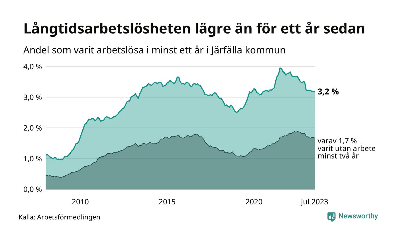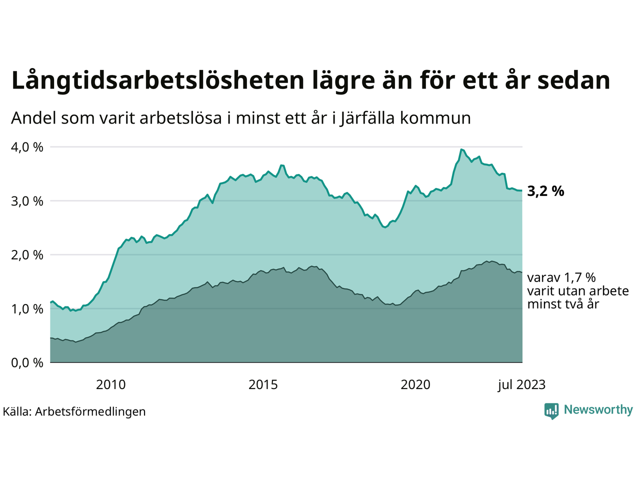 I juli hade 1 386 Järfällabor varit arbetslösa i minst ett år, vilket är två fler än månaden innan. 1 386 personer motsvarar 3,2 procent av arbetskraften i kommunen – andelen långtidsarbetslösa är 0,5 procentenheter lägre än samma månad för ett år sedan.