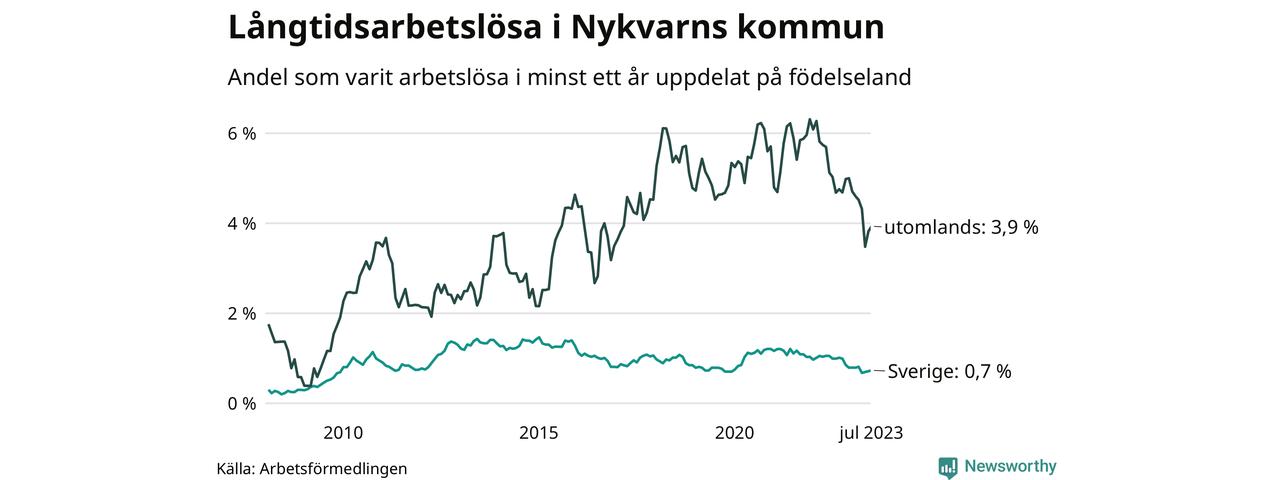 I juli hade 73 Nykvarnsbor varit arbetslösa i minst ett år, vilket är två fler än månaden innan. 73 personer motsvarar 1,2 procent av arbetskraften i kommunen – andelen långtidsarbetslösa är 0,4 procentenheter lägre än samma månad för ett år sedan.