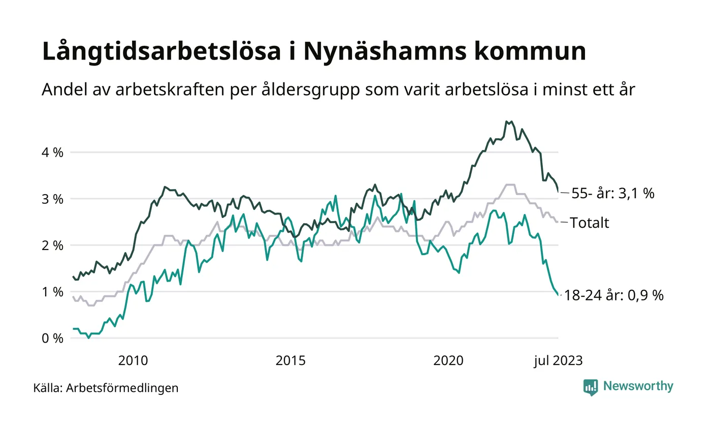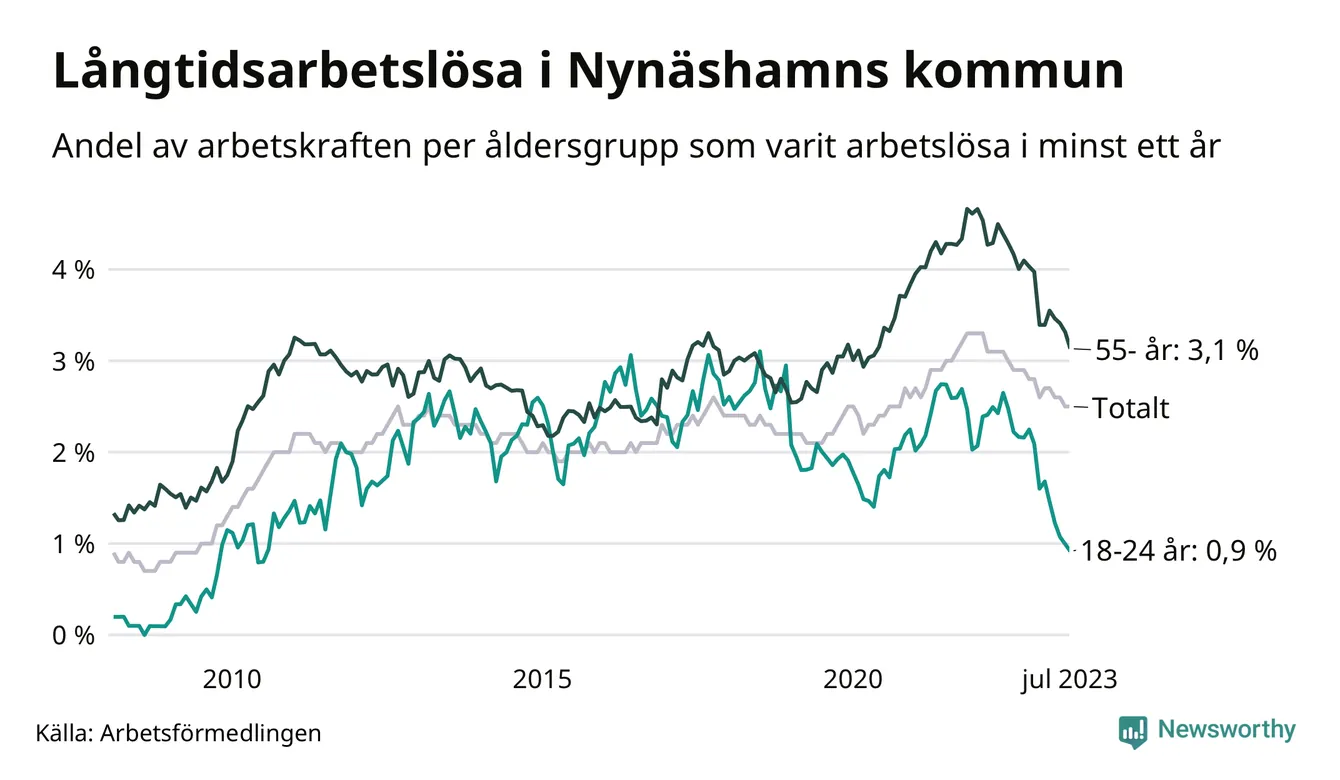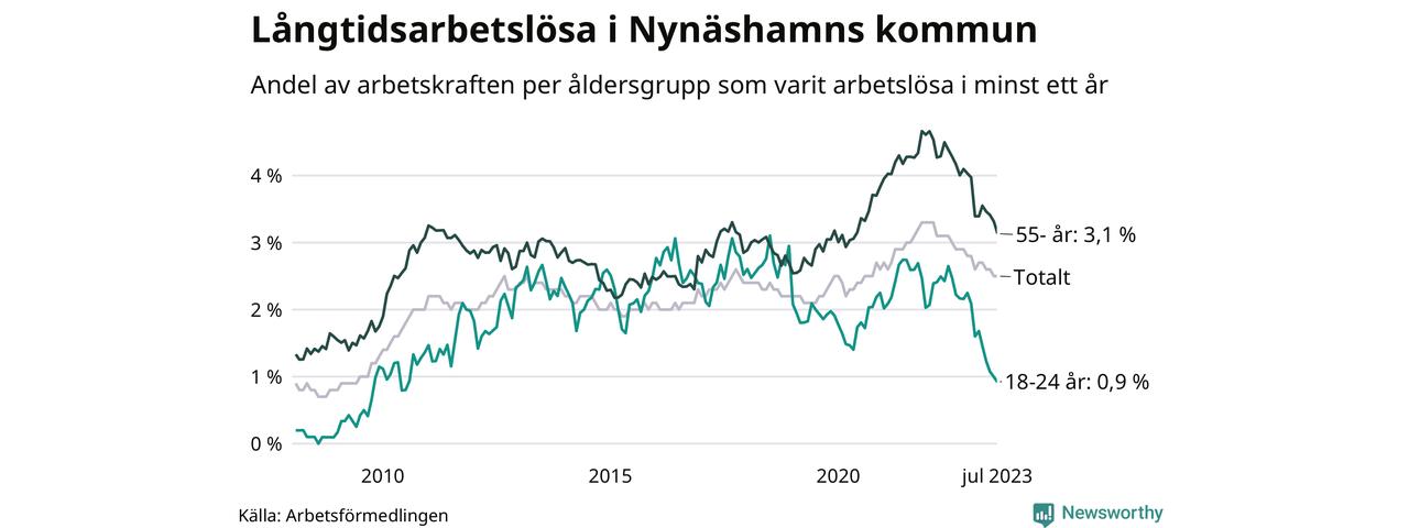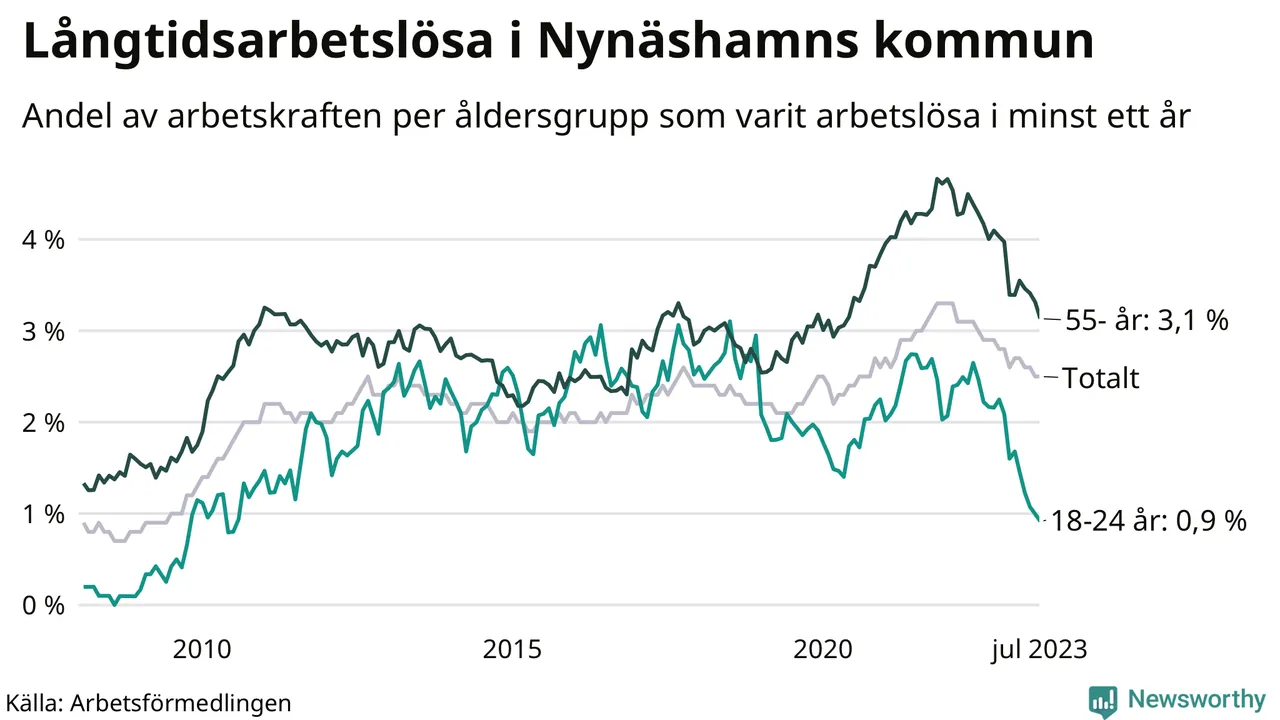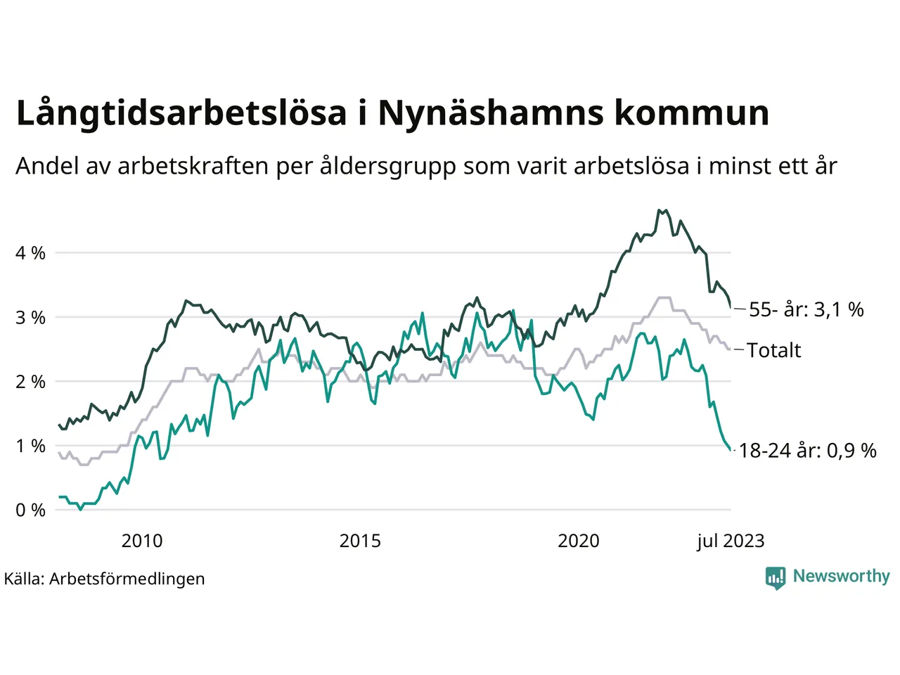 Av de 363 personerna som varit arbetslösa i mer än ett år i Nynäshamns kommun är 100 personer mellan 55 och 651 år och tolv är mellan 18 och 24 år. För den äldre gruppen är andelen arbetslösa 3,1 procent medan den i den yngre gruppen är 0,9 procent. Även i riket som helhet är långtidsarbetslösheten högre i gruppen äldre.