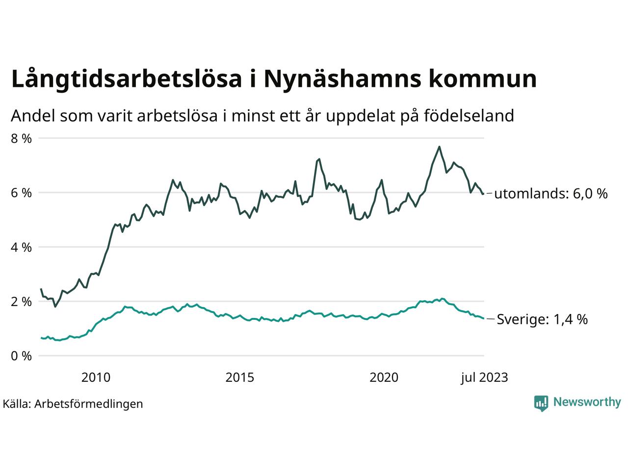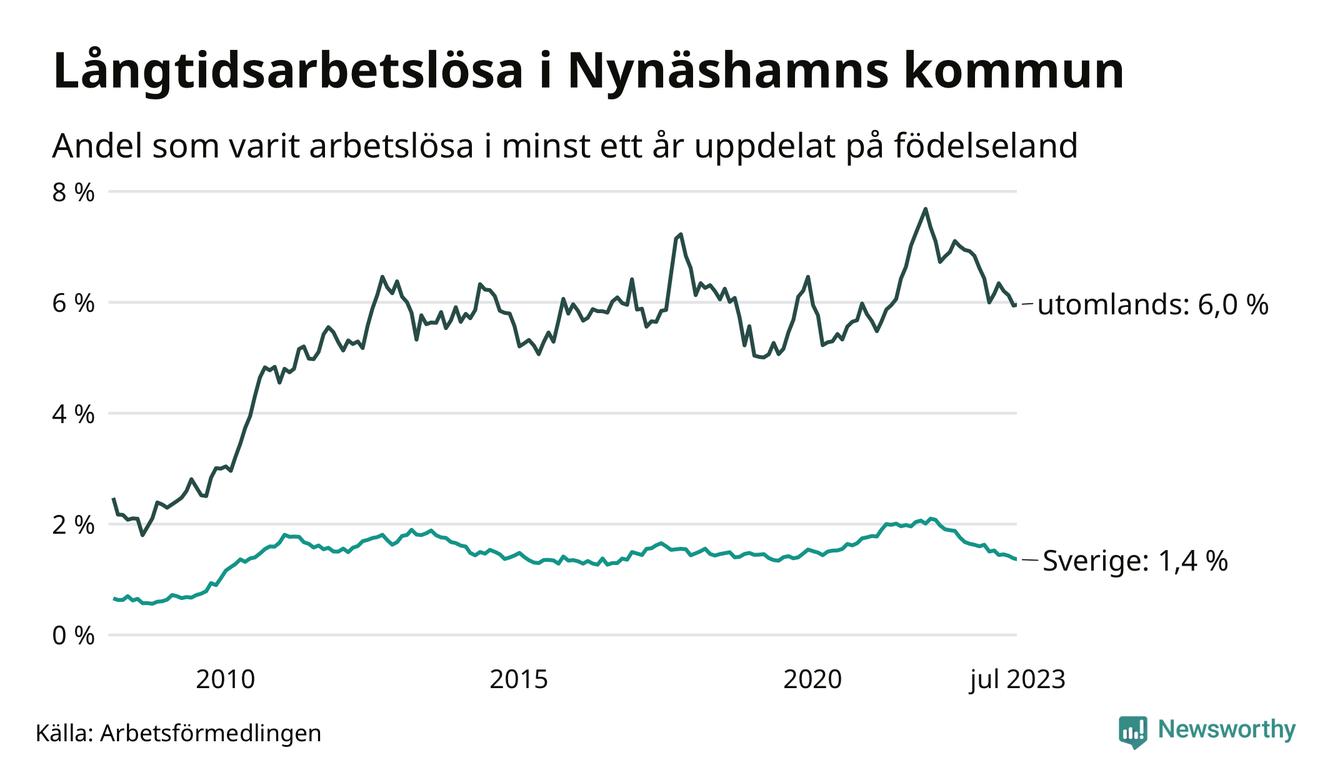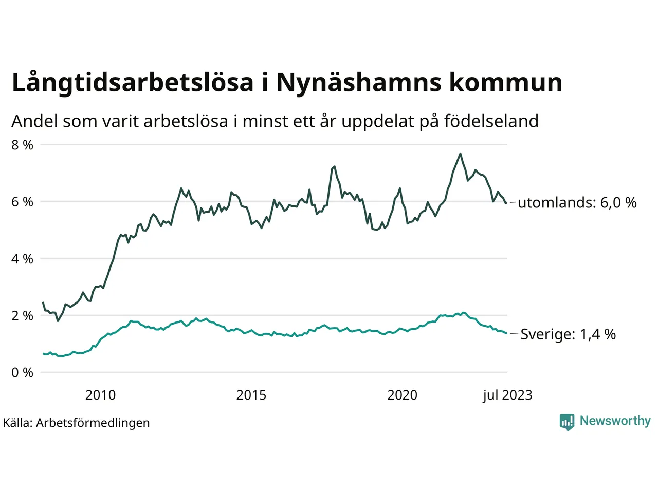 148 av de långtidsarbetslösa i Nynäshamn är födda i Sverige, medan 215 är födda utomlands. Det innebär att långtidsarbetslösheten bland Sverigefödda är 1,4 procent, medan den är fyra gånger så hög – 6,0 procent – bland födda utomlands. Även i riket som helhet är arbetslösheten högre bland utrikesfödda.