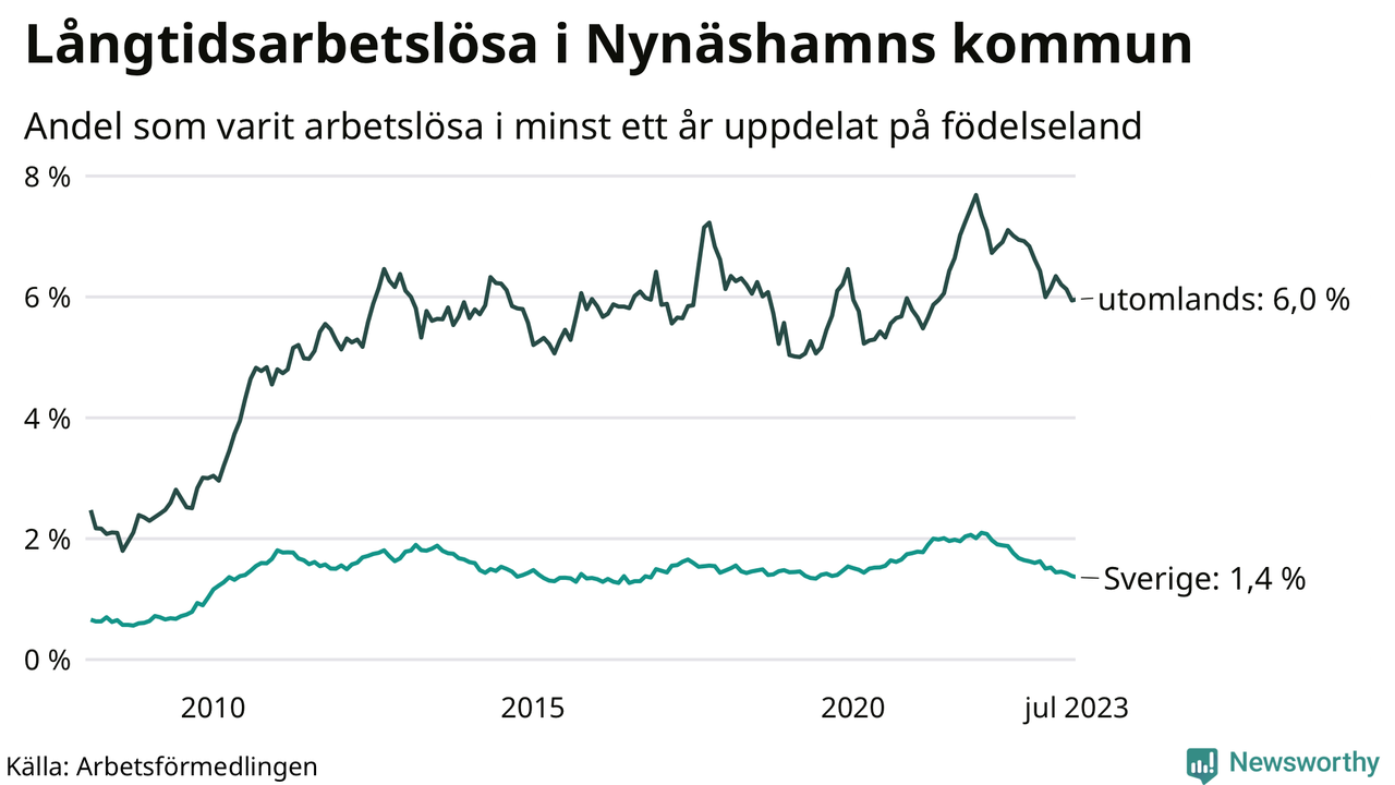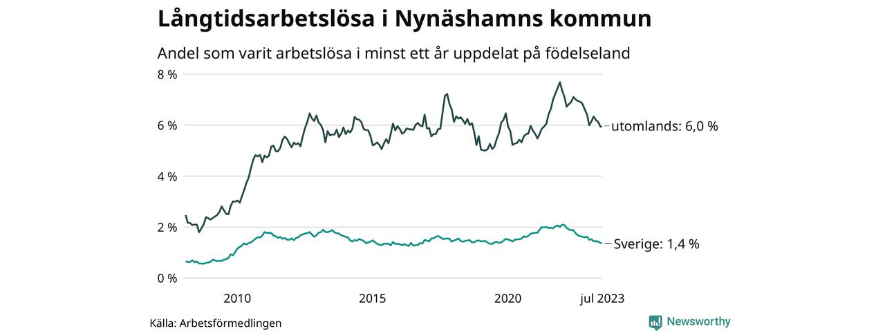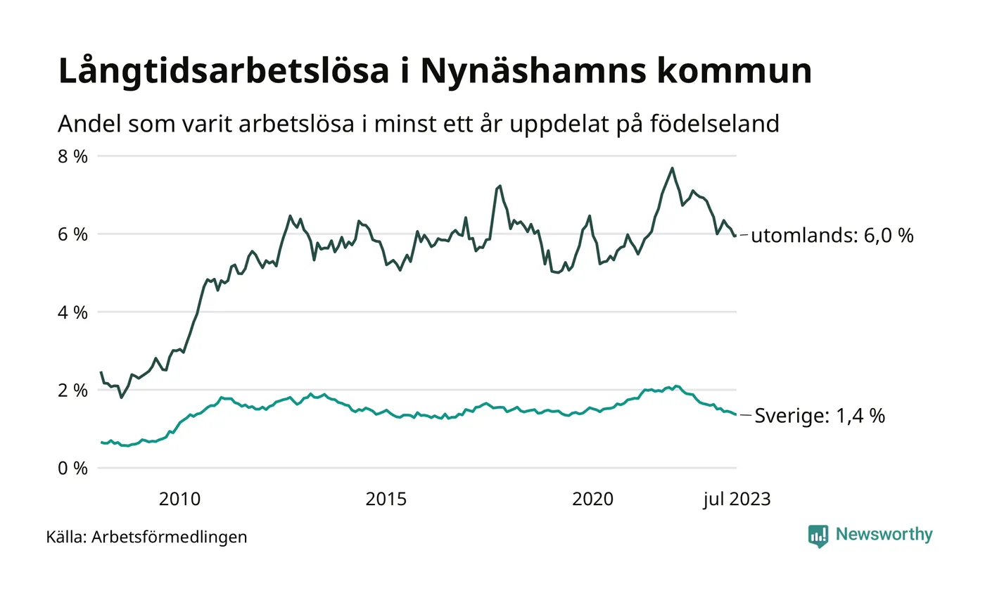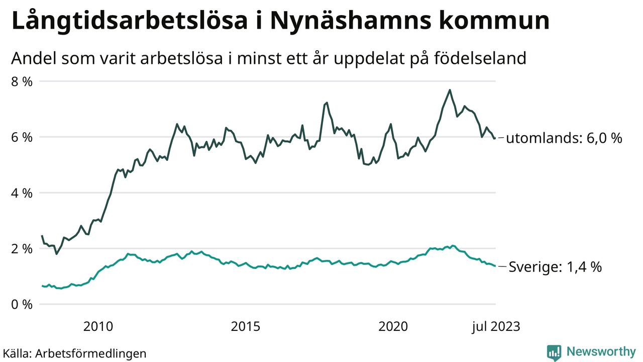 148 av de långtidsarbetslösa i Nynäshamn är födda i Sverige, medan 215 är födda utomlands. Det innebär att långtidsarbetslösheten bland Sverigefödda är 1,4 procent, medan den är fyra gånger så hög – 6,0 procent – bland födda utomlands. Även i riket som helhet är arbetslösheten högre bland utrikesfödda.