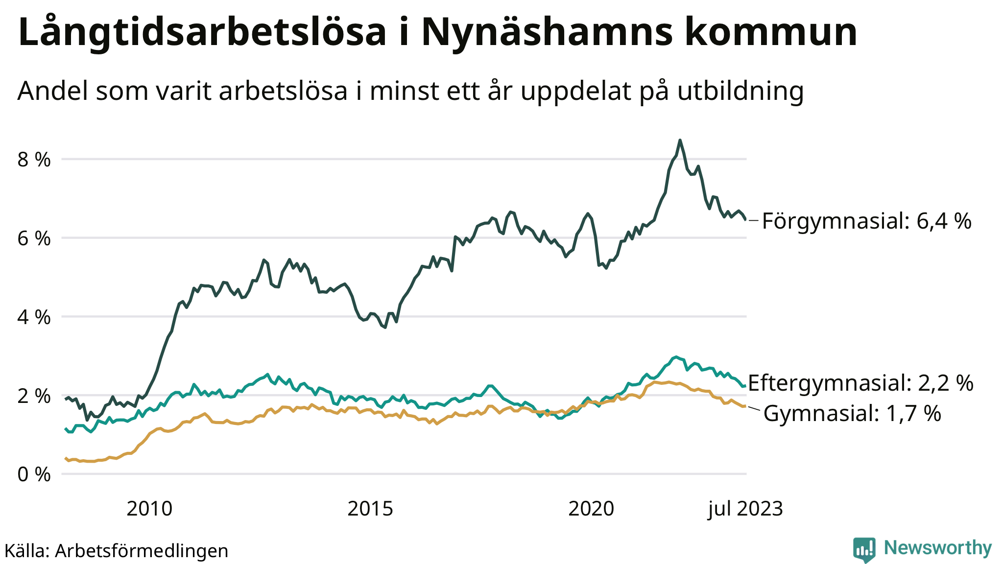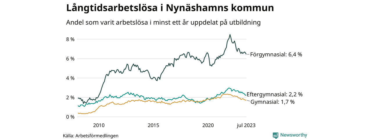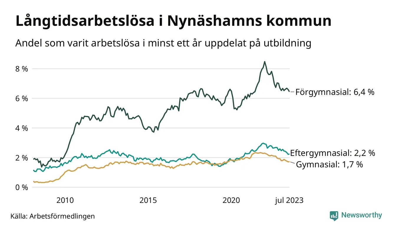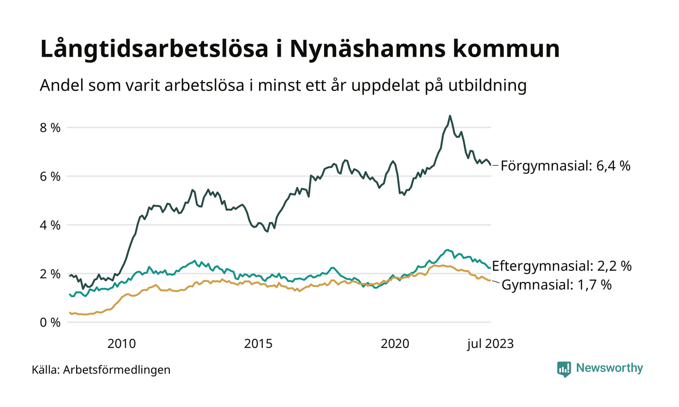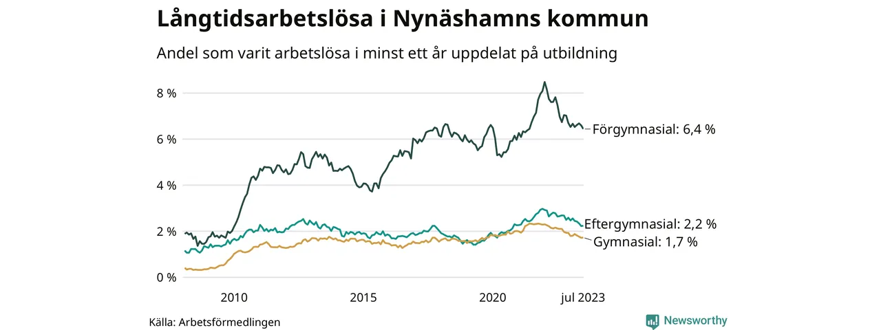 Graf över andel långtidsarbetslösa i Nynäshamn uppdelat på utbildningsnivå